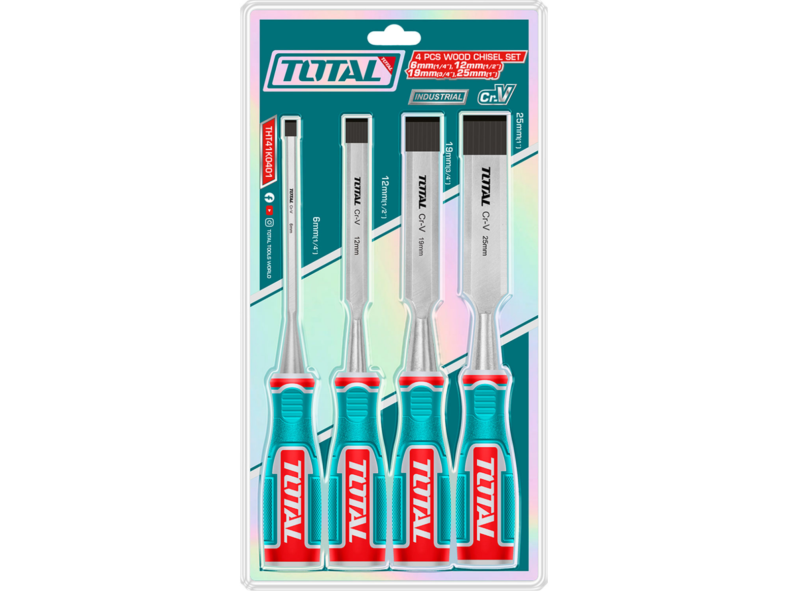 Sada 4 dlát, kvalitní CrV ocel, přesné ostří šíře 6, 12, 20 a 25 mm, rukojeť z protiskluzové TPR pryže.
