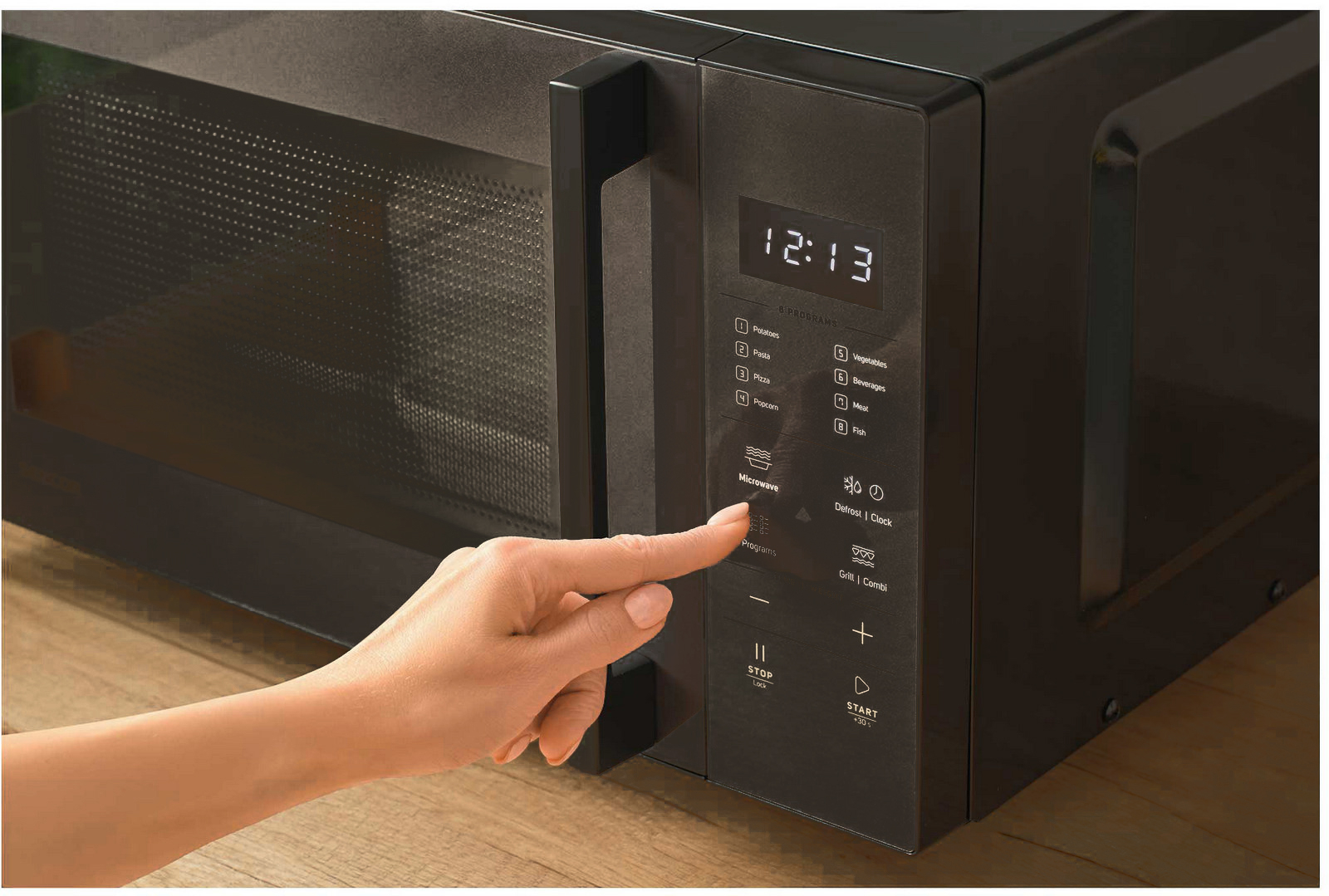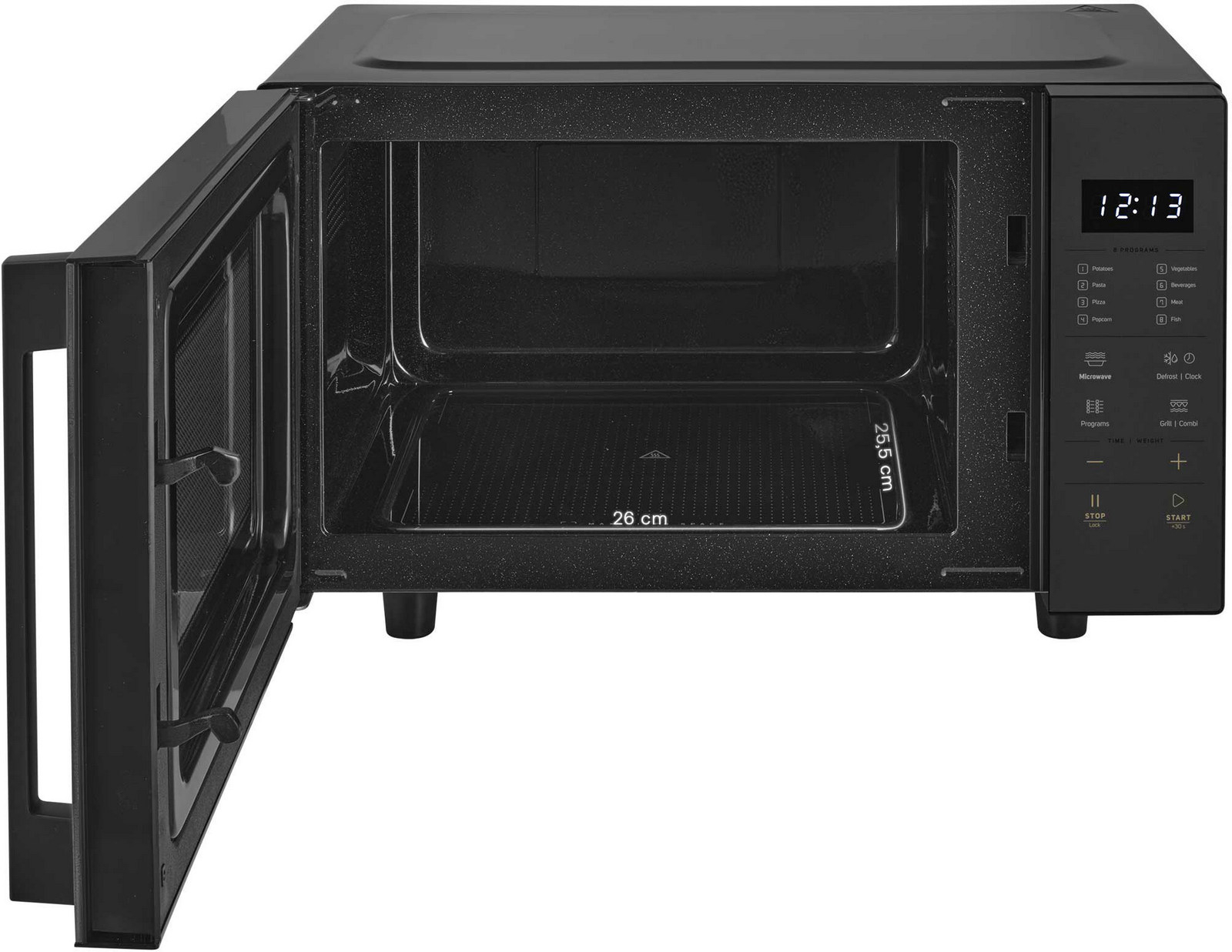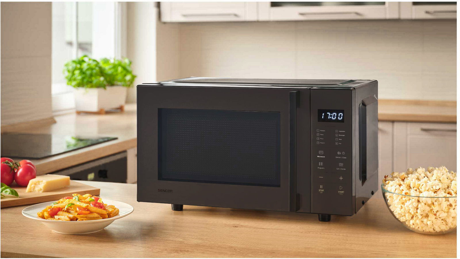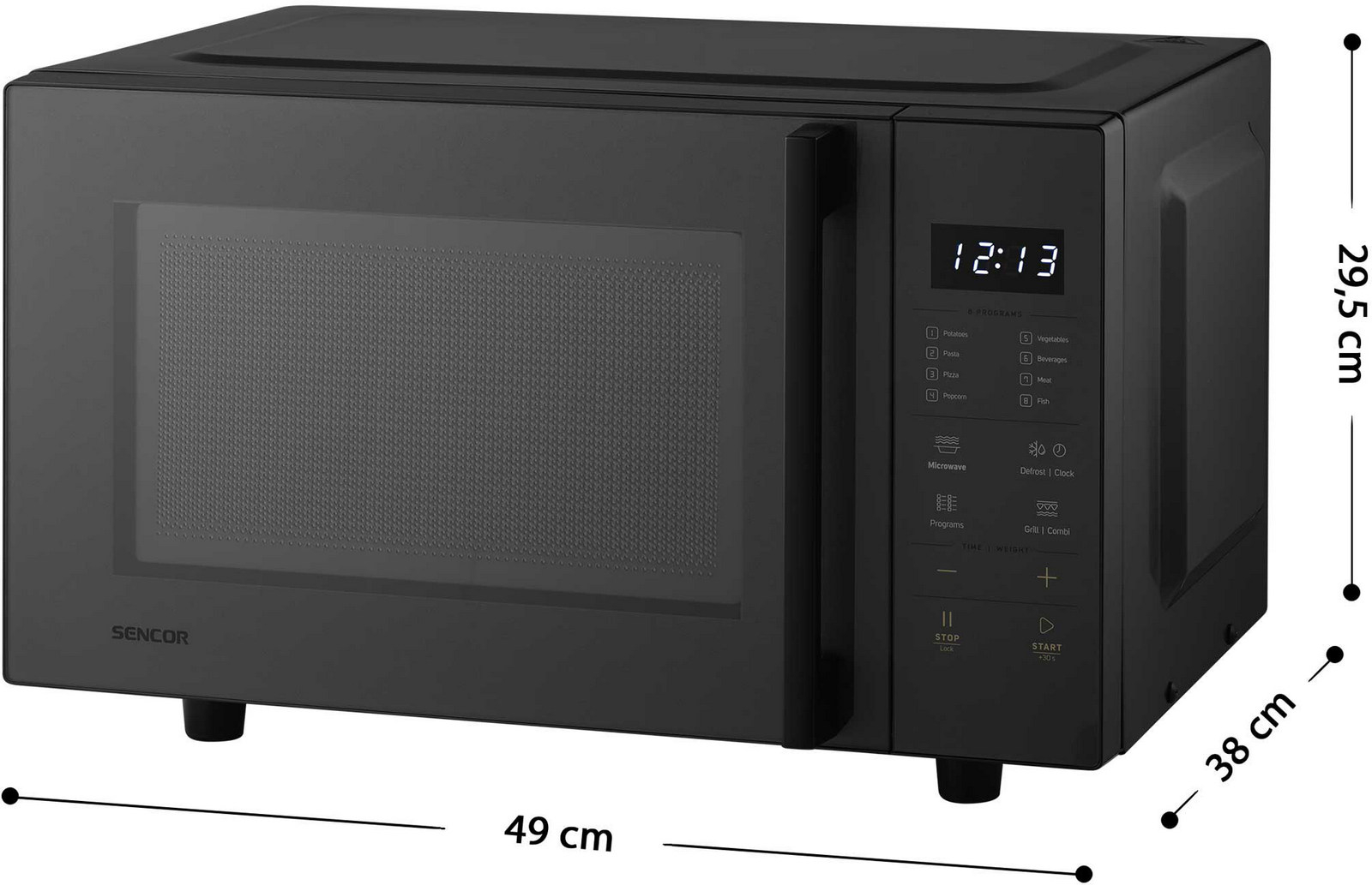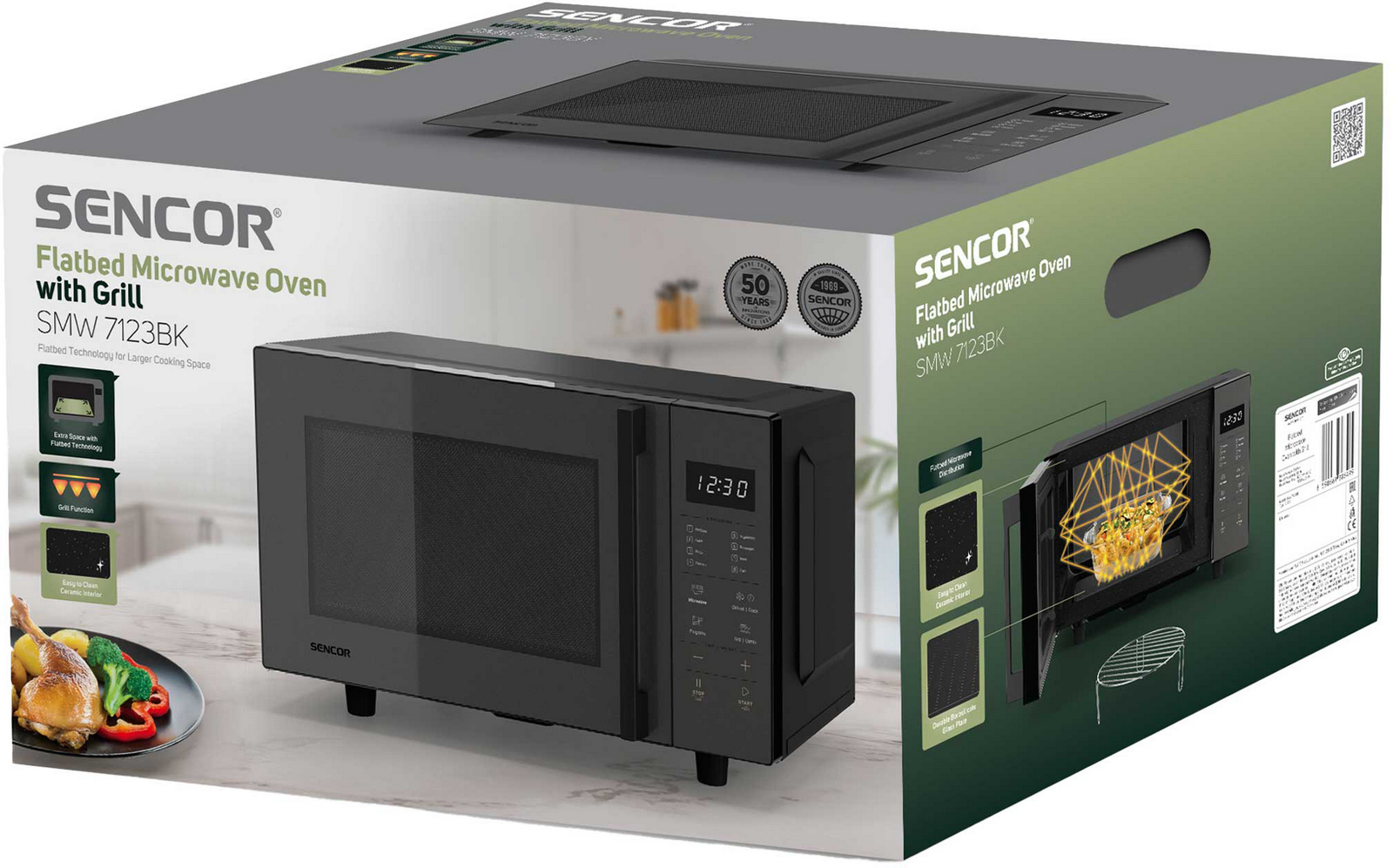 Objem trouby 23 l, mikrovlnný výkon 800 W, gril 1000 W, technologie Flatbed bez rotačního talíře pro větší prostor na nádoby různých tvarů, vnitřní prostor s vlastnostmi keramického povrchu pro větší odolnost proti poškrábání a snadnější čištění, elektronické dotykové ovládání. L celý popisED displej se zobrazením hodin, s 8 snadnými programy, deska z borosilikátového skla o rozměrech 260 x 255 mm, 5 úrovní výkonu mikrovln, 2 režimy kombinovaného mikrovlnného vaření a grilu, dětská pojistka, grilovací rošt, Quartz gril, rozmrazení dle váhy a času, 60 minutový časovač, zvukový signál označující ukončení programu, rozměry (š x v x h): 490 x 295 x 380 mm, hmotnost 12,4 kg.