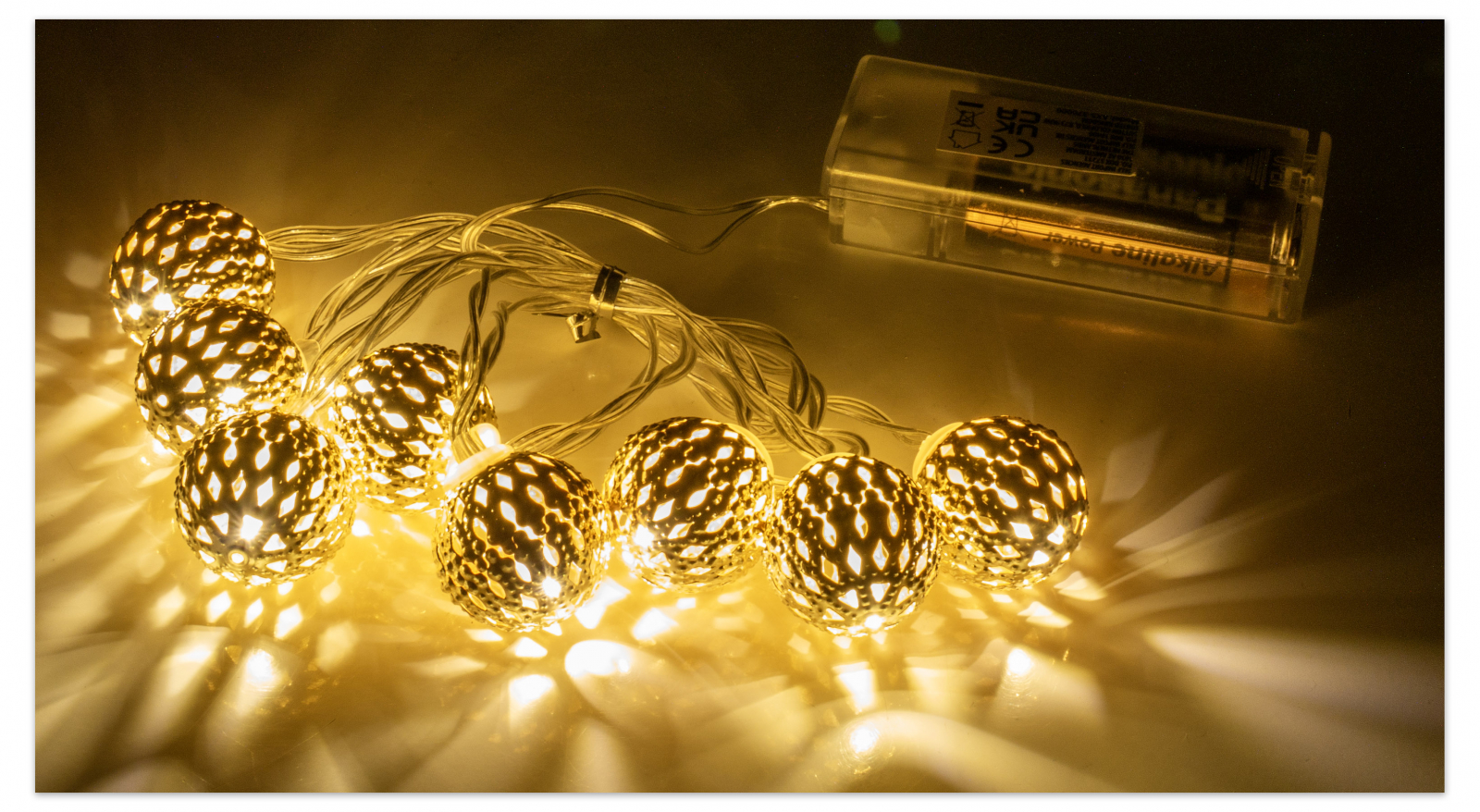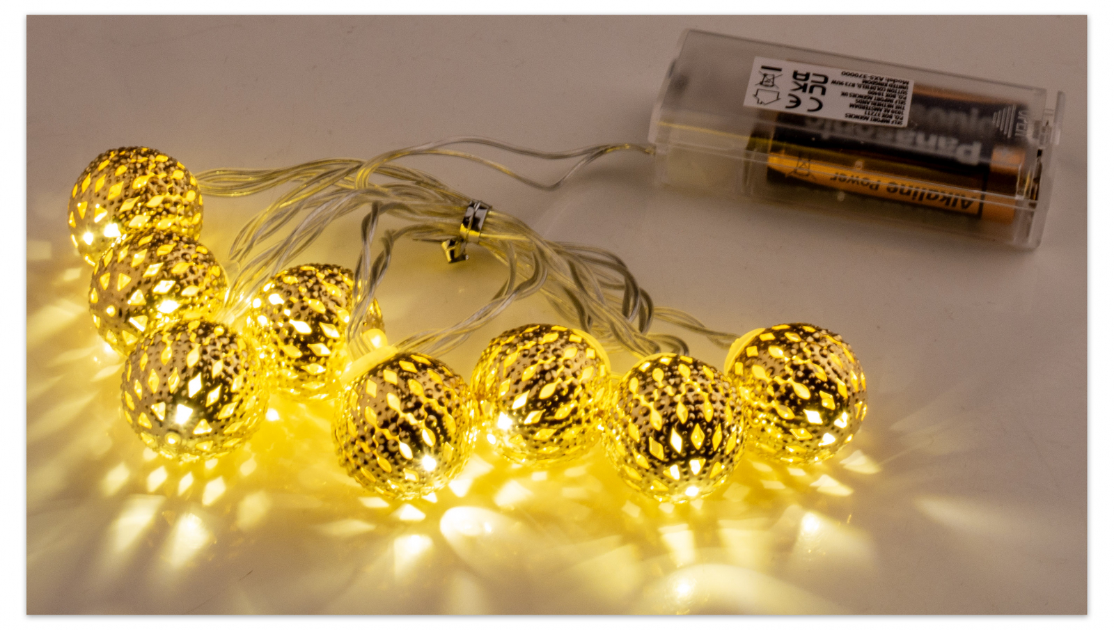 Vánoční girlanda s 8 LED zlatými kuličkami. Průměr kuličky 2,5cm. Délka osvětlené části 90 cm. Přívodní kabel 30cm. Napájení 2x AA tužkové baterie (nejsou součástí balení). Vhodná pro užití v interiéru IP20.