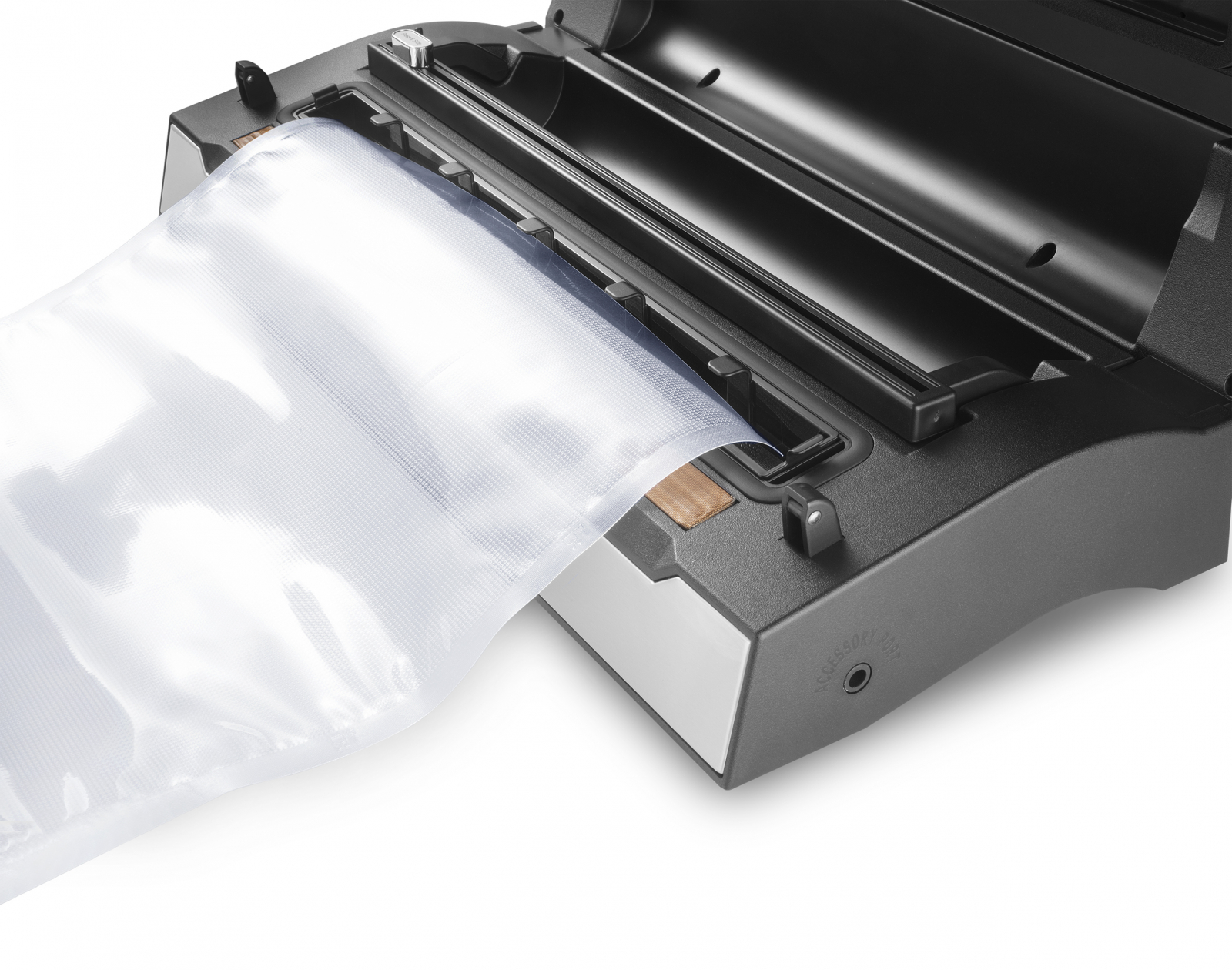 Dvojitá tepelná páska zajišťuje pevné a bezpečné zatavení sáčků dvojitým svárem, vestavěný řezák umožní jednoduchou přípravu sáčků na míru a praktická hadička rozšiřuje využití o možnost vakuování v nádobách nebo odsávání vzduchu z lahví.