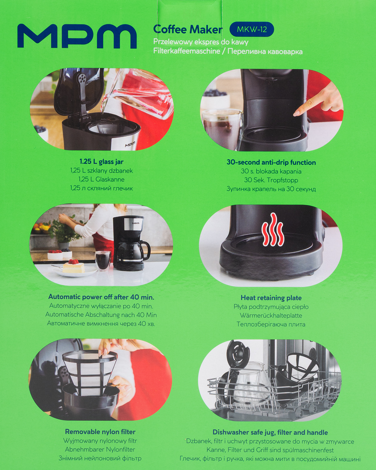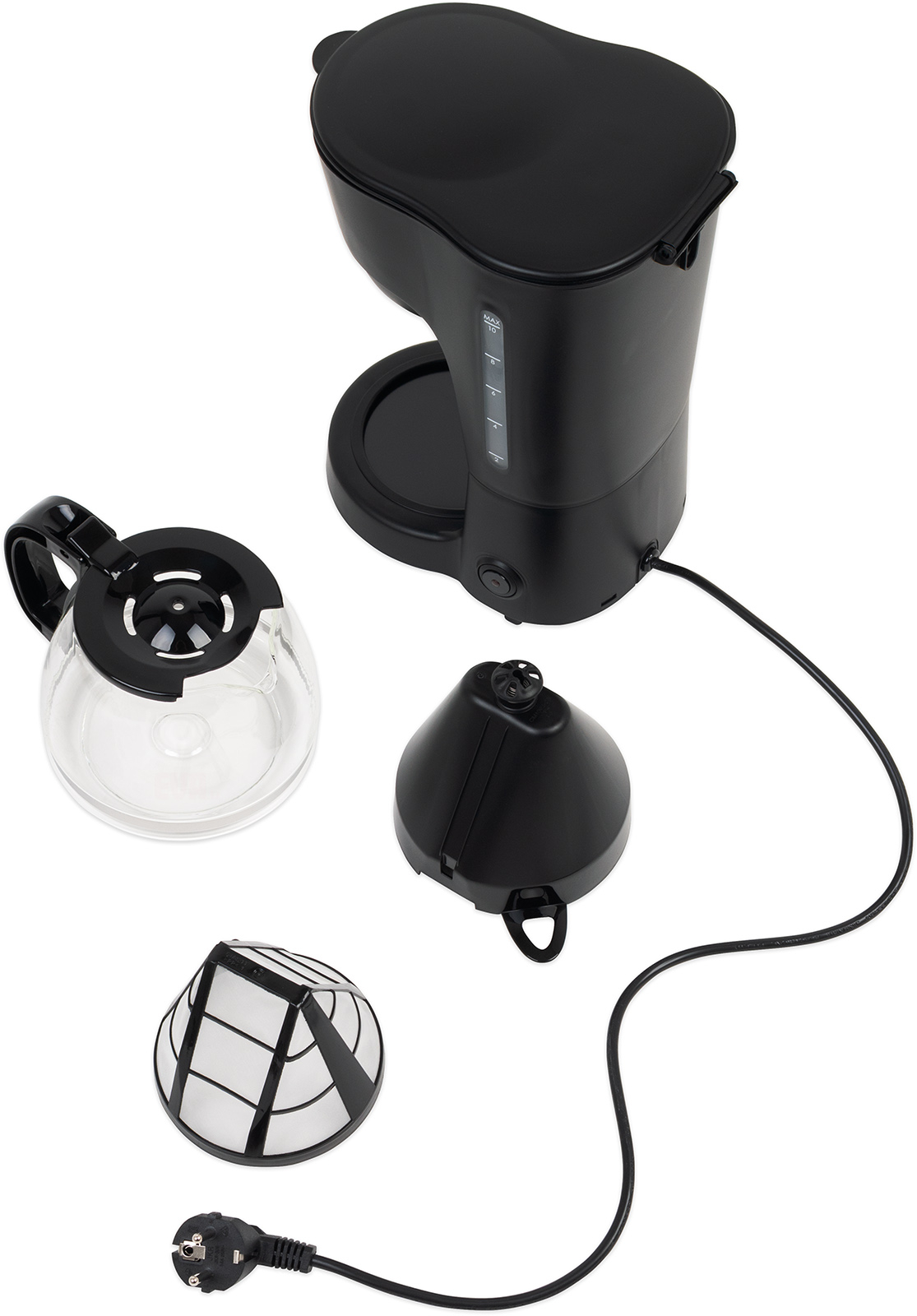 Kávovar s příkonem 600 W, objem zásobníku na vodu 1,25 l pro přípravu 10 šálků, skleněná konvice (1,25 l) s praktickým uzavíratelným víkem, vyjímatelný a omyvatelný permanentní filtr, funkce udržování teploty po dobu 40 minut, značka hladiny vody na nádrži a konvici udávající poč celý popiset šálků, ochrana proti přehřátí, možnost použití jednorázových papírových filtrů (velikost 4), funkce proti odkapávání, tepelně izolovaná rukojeť konvice, skleněnou nádobu na kávu lze mýt v myčce nádobí, protiskluzové nožky. rozměry výrobku (š x v x h) 170 x 285 x 210 mm, délka přívodního kabelu 0,75 m.