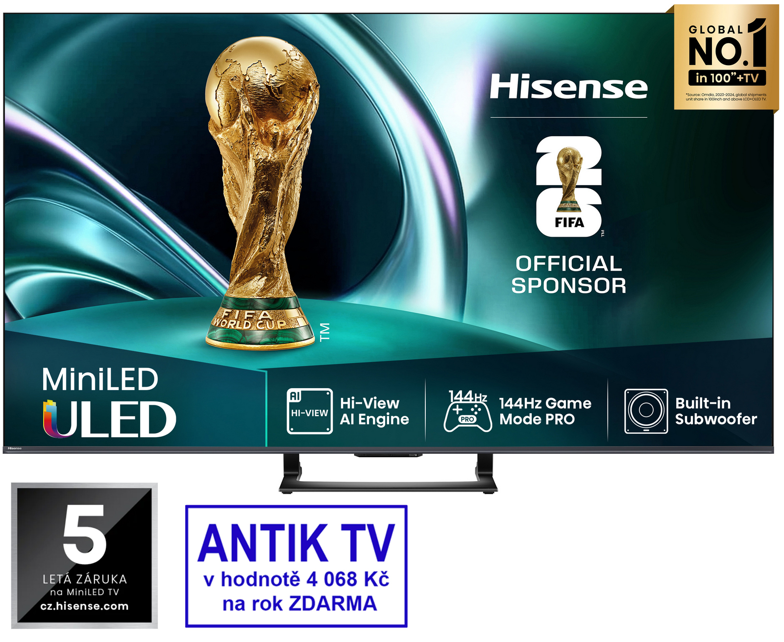 MiniLED 4K Smart UHD televizor, úhlopříčka 139 cm (55"), energetická třída E, rozlišení UHD 3840 x 2160 px., operační systém Vidaa, DVB-T/T2/C/S/S2 HEVC, HbbTV, Dolby Atmos/Vision IQ, DTS Virtual X decoding, EZPlay, výstupní výkon 2x 10 W + 20W + 2x 5W, 2.1.2 Multi Channel Surrou celý popisnd, subwoofer, 4x HDMI, eARC, ALLM, VRR, EZPlay, 2x USB, přehrávač foto/video/hudba, Bluetooth, DLNA, Ethernet, CI+, optický výstup, AV IN, sluchátkový výstup, světelný senzor, Netflix, YouTube, OnePlay, Disney+, Max a další, Hi-Viwe Engine Pro, 165 Hz Game Mode Ultra VRR, AMD FreeSync Premium Pro, Skylink Fast Scan, VESA 400x200, hmotnost 15 kg, rozměry (š x v x h): 1226 x 773 x 288 mm.