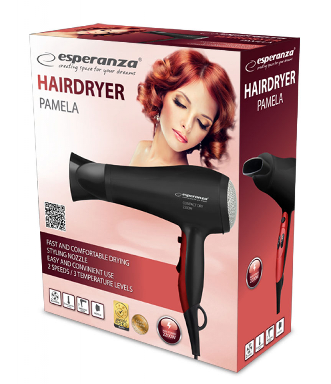 Fén s příkonem 2200 W, dva stupně rychlosti proudění vzduchu, tři teploty vysoušení vlasů, optimálně rozložení ovládacích prvků pro leváky i praváky, tlačítko studeného vzduchu pro rychlou fixaci a modeling účesu, závěsné očko, tepelná pojistka, příslušenství: vzduchová tryska