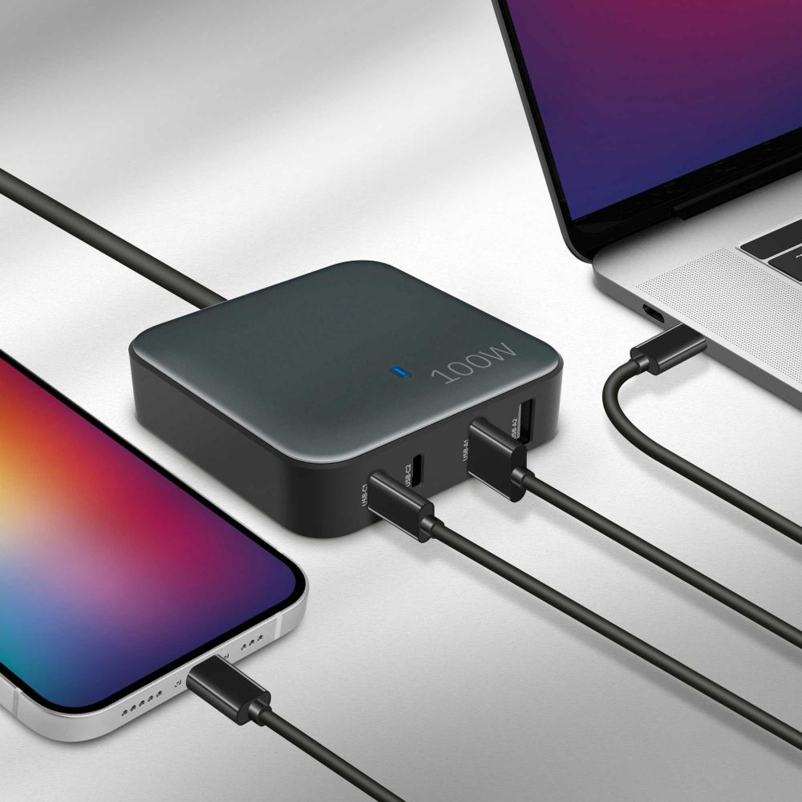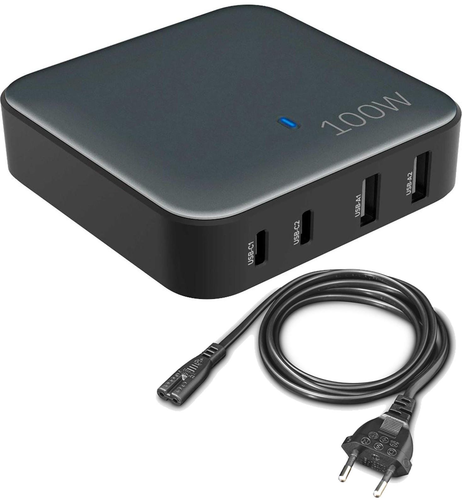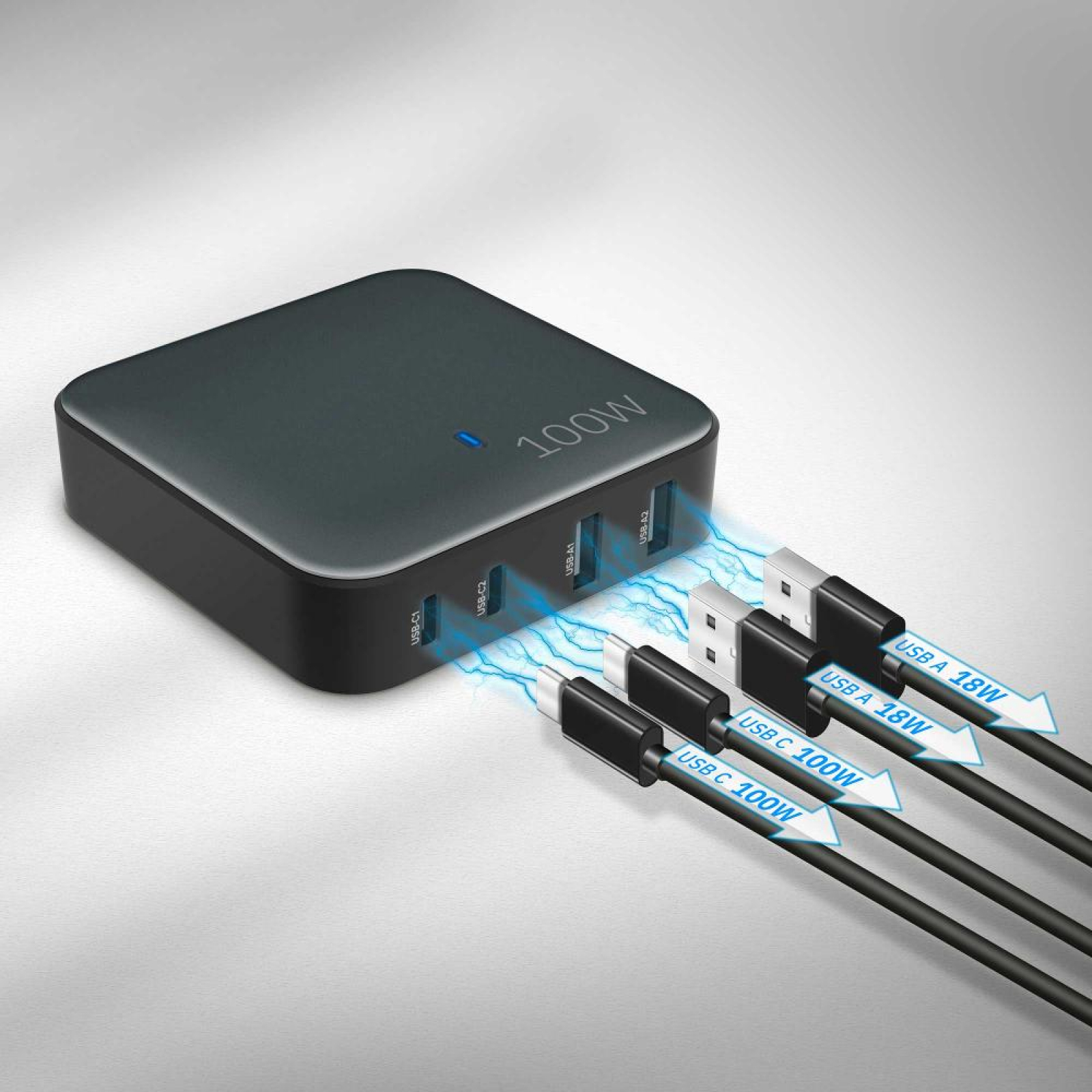Kompaktní nabíjecí stanice s výkonem až 100 W, stanice podporuje širokou škálu nabíjecích protokolů, Power Delivery 3.0, Quick Charge 2.0/3.0/4.0+, HUAWEI FCP/SCP a SAMSUNG AFC, je ideálním řešením pro efektivní a rychlé nabíjení mobilních telefonů, tabletů, notebooků, sluchátek, celý popis chytrých hodinek, reproduktorů a dalších elektronických zařízení. Díky čtyřem výstupním portům USB (2× USB A + 2× USB C) umožňuje současné nabíjení více zařízení. Kompaktní rozměry, je vhodná pro použití v domácnosti, v kanceláři i na cestách. Balení obsahuje nabíjecí stanici a síťový napájecí kabel 230 V.