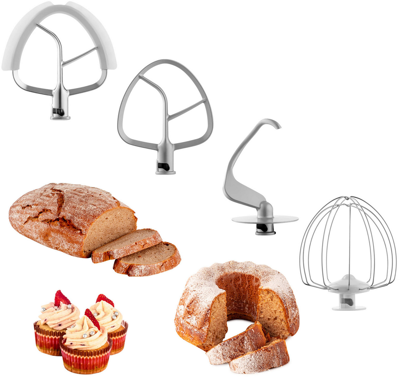 O perfektní zpracování různých surovin se starají nástavce na míchání, šlehání a hnětení. S pomocí robota zvládnete hravě zpracovat až 1,8 kg hutného chlebového těsta a až 3,2 l krému. Na přípravu jemných těst vám pak přijde vhod FLEXI metla.