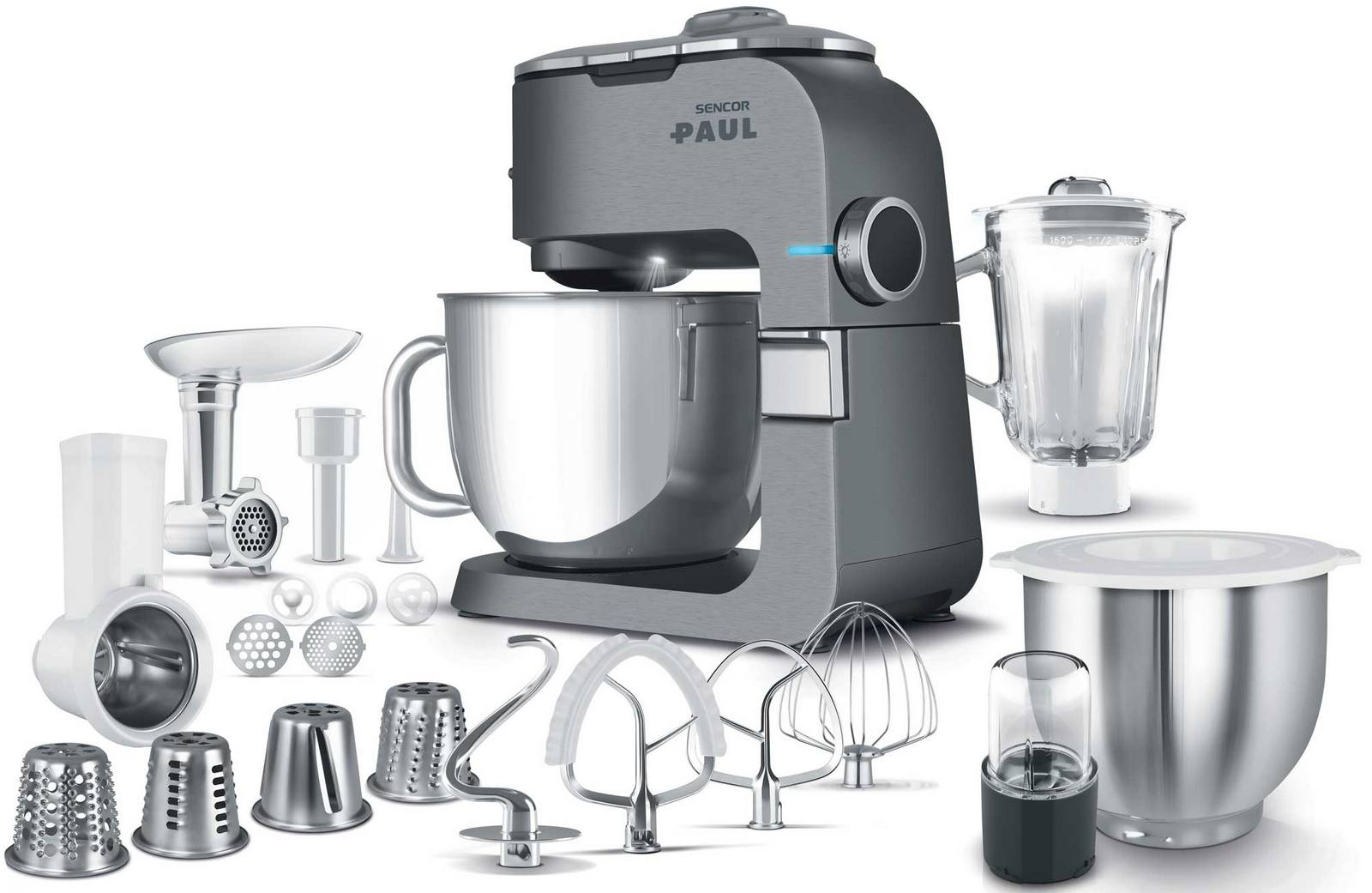 - multifunkční robot s několika nástavci z nerezové oceli pro hnětení těst a šlehání