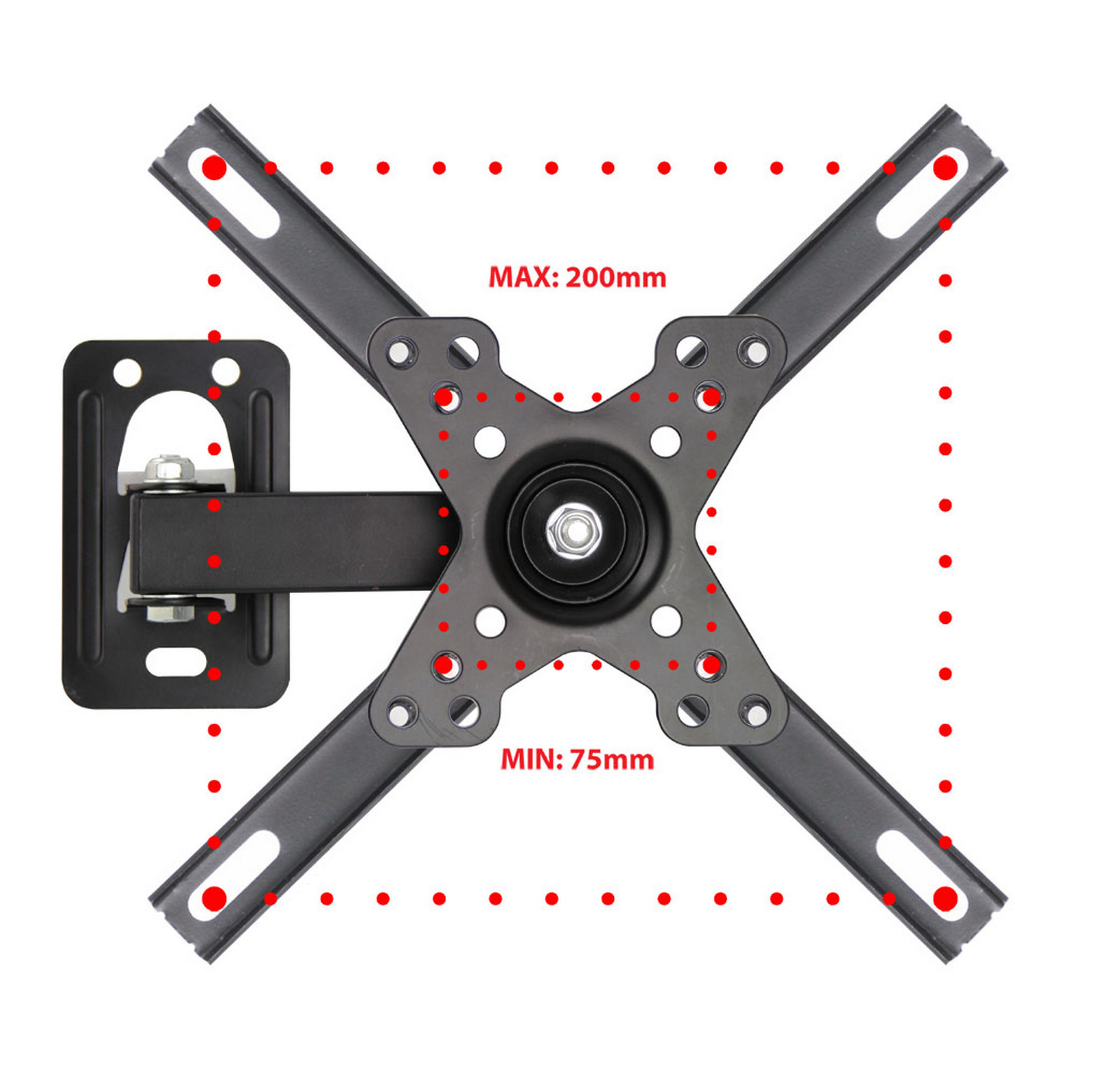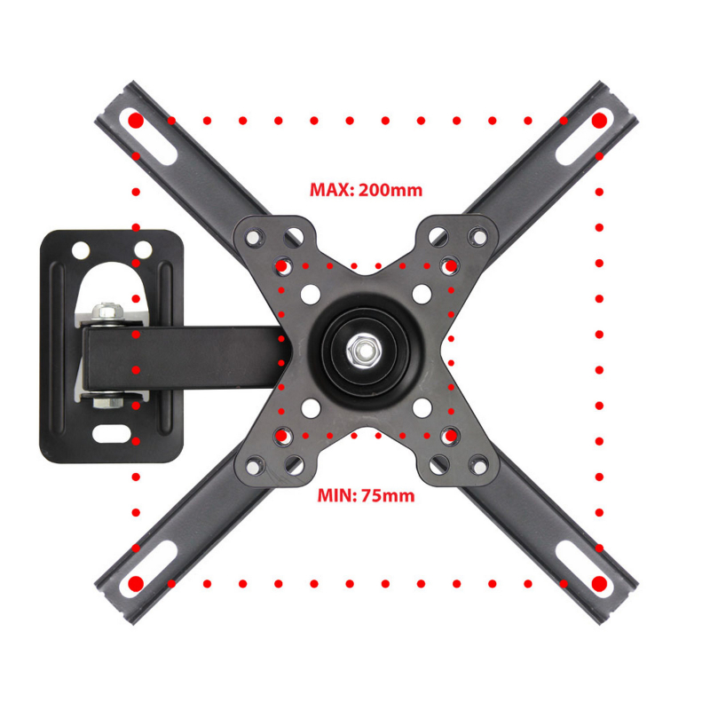 Kovový nástěnný držák pro televizory s úhlopříčkou 12"-50" (30 - 127 cm), nosnost max. 20 kg, nastavitelná vzdálenost od zdi: 55 - 220 mm, vertikální náklon +-25°, horizontální natočení až 180°, rozteč pro přidělání televize VESA 75x75 až 200x200, součástí balení: montážní příslu celý popisšenství, barva černá, hmotnost 0,58 kg.