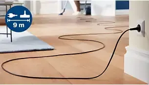 Dosah 9 metrů od zástrčky k hubici umožňuje delší používání bez odpojení.