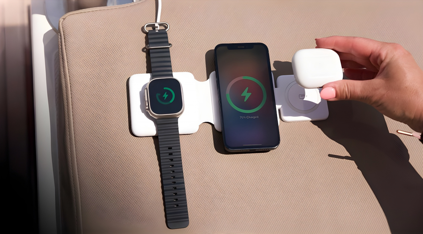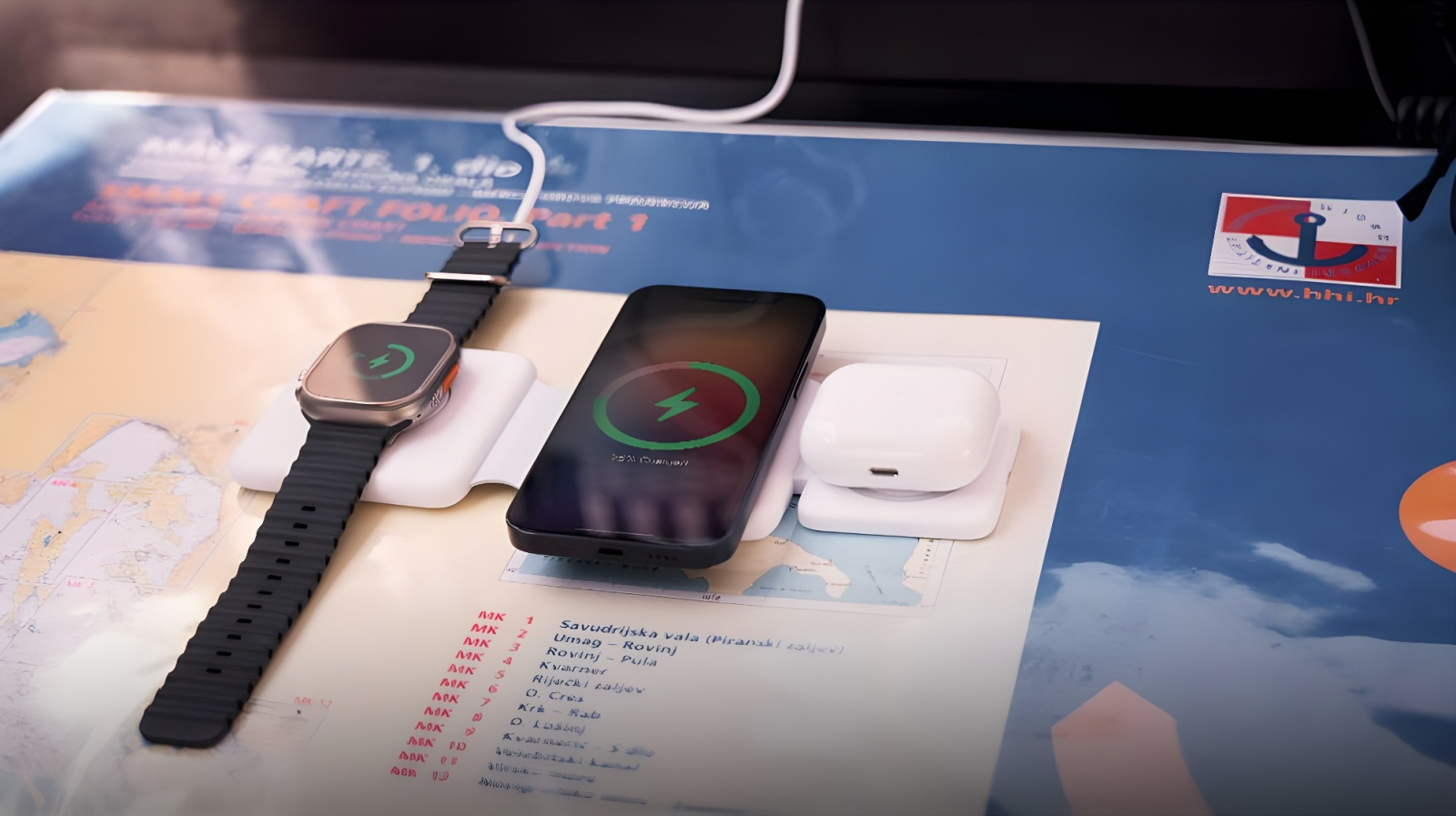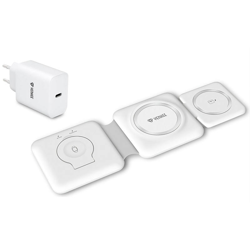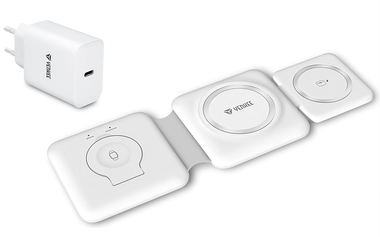 Cestovní bezdrátová nabíjecí stanice pro Apple umožňuje nabíjet až tři zařízení současně: iPhone, Apple Watch a AirPods. Je plně kompatibilní s MagSafe určena pro iPhony od řady 12 výše. Telefon stačí položit na nabíjecí plochu, magnet jej přichytí a vycentruje pro efektivní nabí celý popisjení. Sluchátka AirPods nebo jiné TWS s podporou bezdrátového nabíjení položte na vyznačené místo, nabíjení se spustí automaticky. O průběhu informuje LED indikace, výkon je 3 W. Apple Watch umístěte na vyznačenou plochu, vyklápěcí mechanismus umožňuje vertikální i horizontální polohu. Magnet automaticky zajistí správné přichycení a nabíjení. Výkon je 2,5 W. Nabíječka YAC 5330 je vhodná na cesty díky pružnému silikonovému spoji a ve složeném stavu se vejde do kapsy. Síťový adaptér 24 W a propojovací kabel v balení.