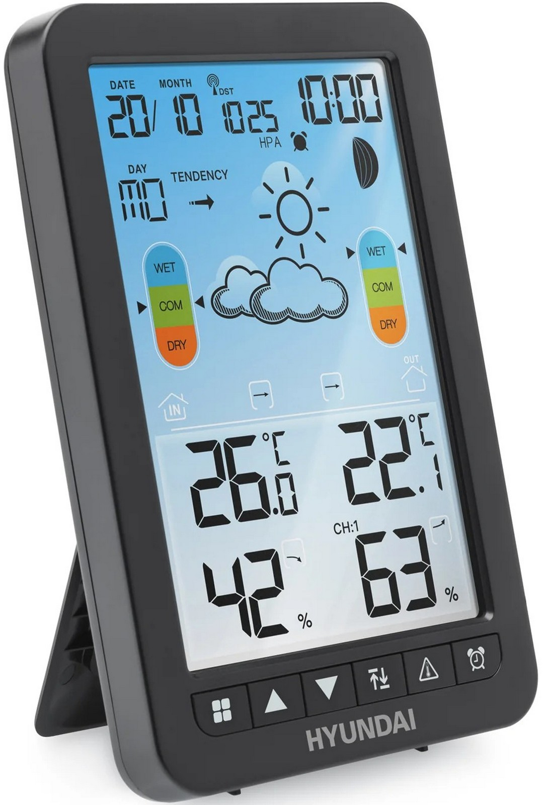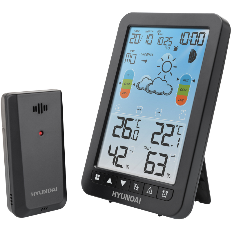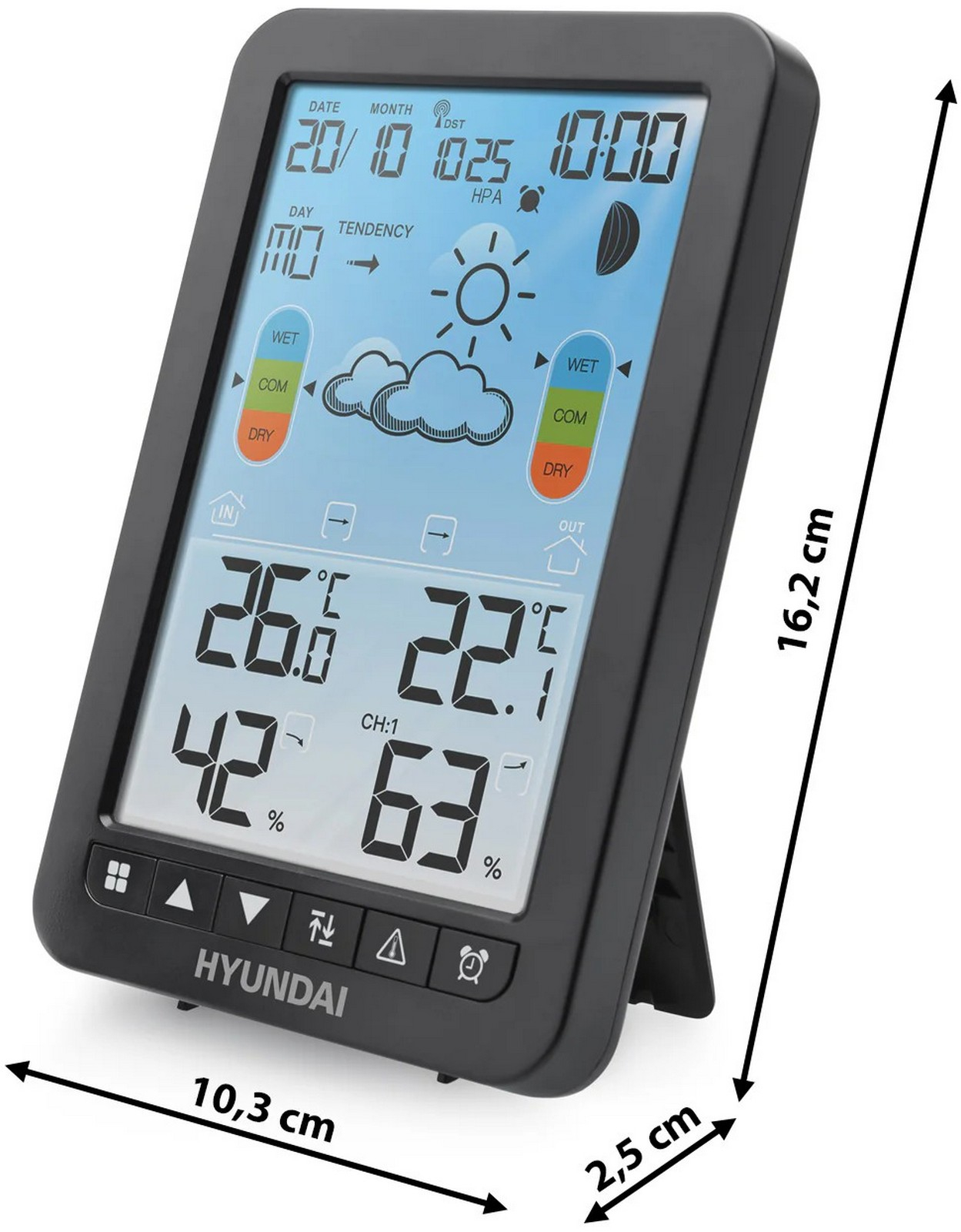 Meteorologická stanice s bezdrátovým snímačem, animovaná předpovědí počasí, vnitřní i vnější měření teploty a vlhkosti, rádiem řízené hodiny pomocí signálu DCF77, barometrický tlak, budík, kalendář, fáze měsíce, barevný LCD displej, tlačítka, umístění na stůl nebo zavěšení na zeď celý popis, možnost připojení až tří senzorů, 1 x senzor součástí balení, přenos mezi hlavní jednotkou a snímačem až 30 metrů v otevřeném prostoru, frekvence vysílání senzoru 433 MHz, napájení meteostanice 3 x 1,5 V typ AAA (nejsou součástí balení), napájení senzoru 2 x 1,5 V typ AAA (nejsou součástí balení), rozměr hlavní jednotky 162 x 103 x 80 mm, hmotnost 260 g.