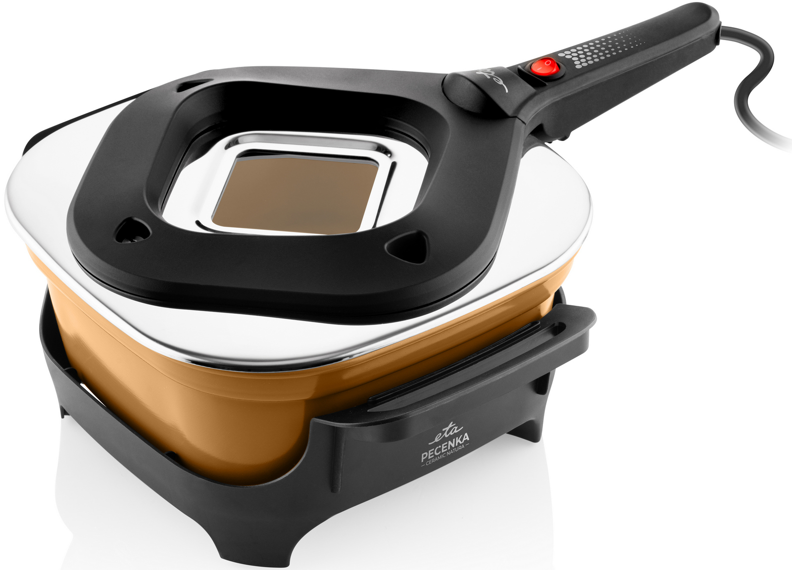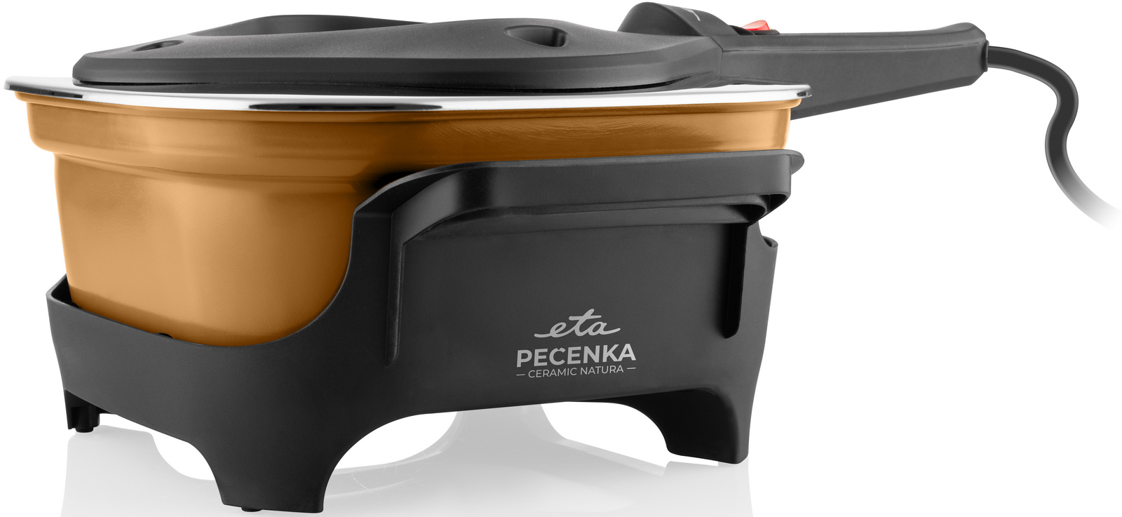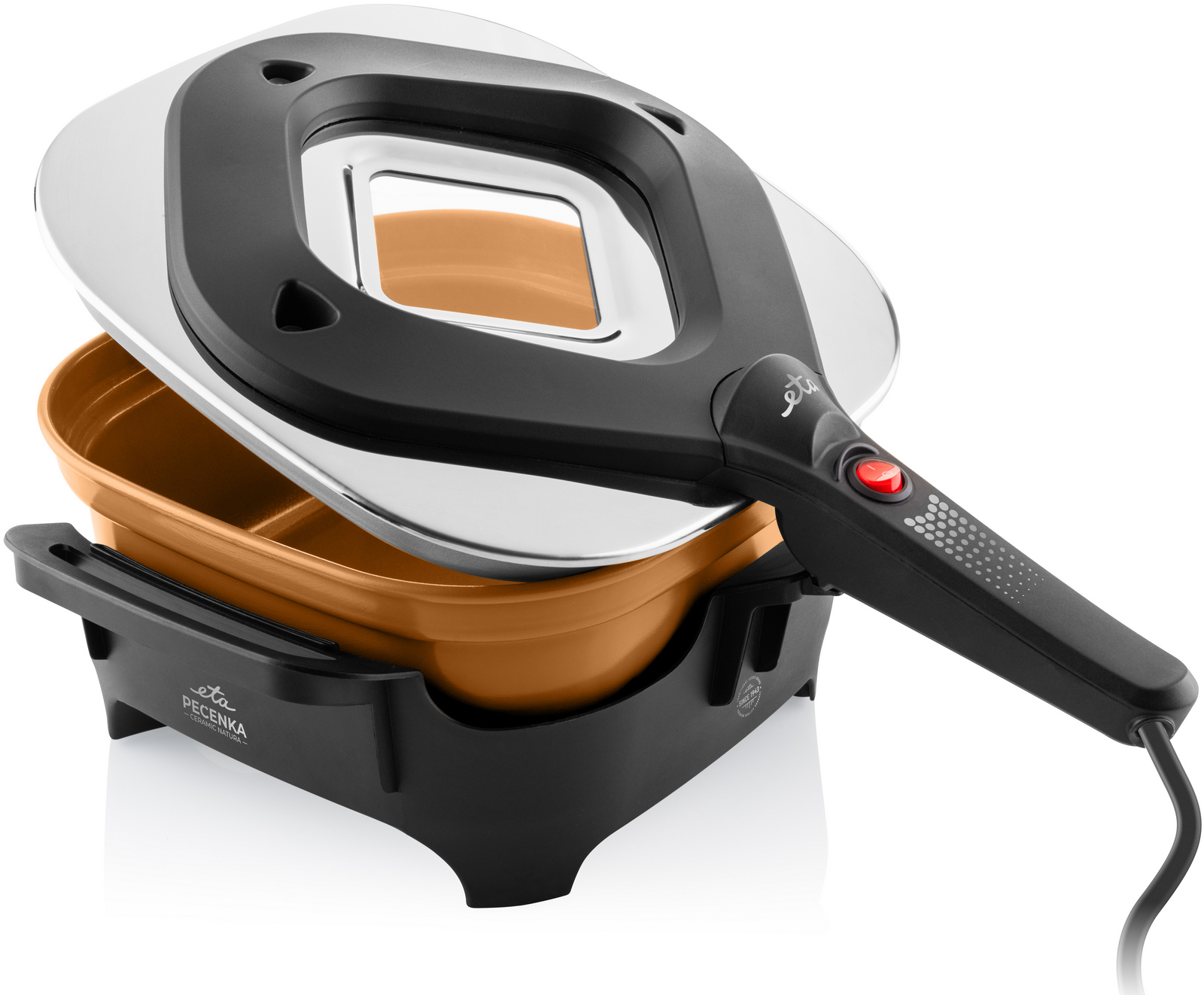 ETA Pečenka přichází v novém, zdravějším kabátě – s pečicí nádobou s nepřilnavým keramickým povrchem. Pečení je úsporné a chutné, ale i šetrnější ke zdraví. Zachovává si současně všechny oblíbené přednosti Pečenky – rychlý ohřev, rovnoměrné pečení a nízkou spotřebu energie. Zvládne vaření, dušení, zapékání i sladké dezerty.
