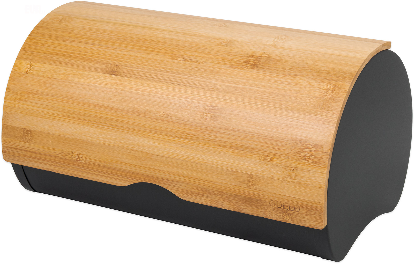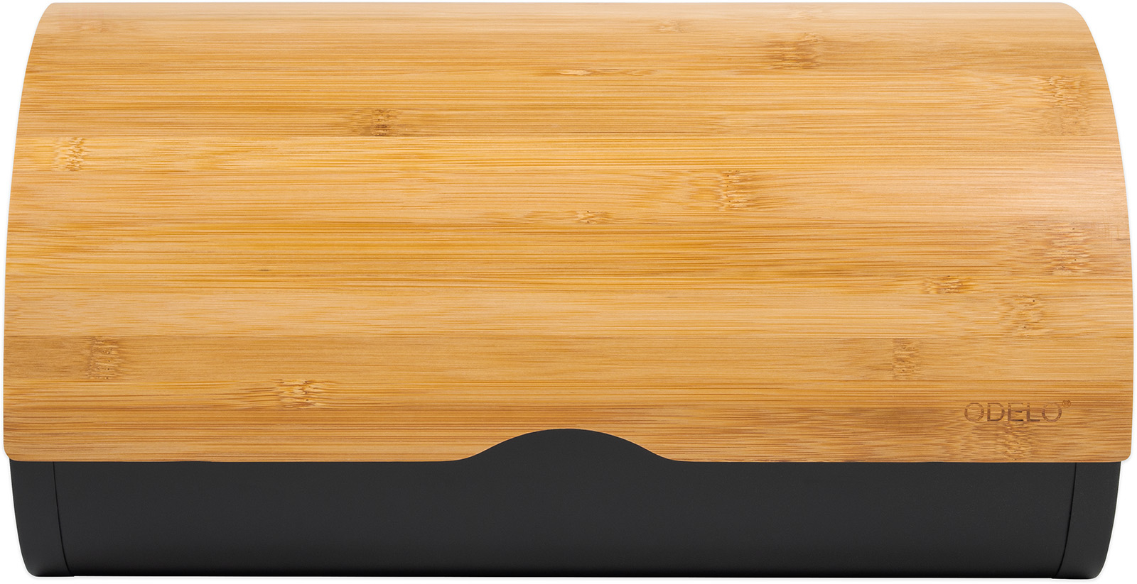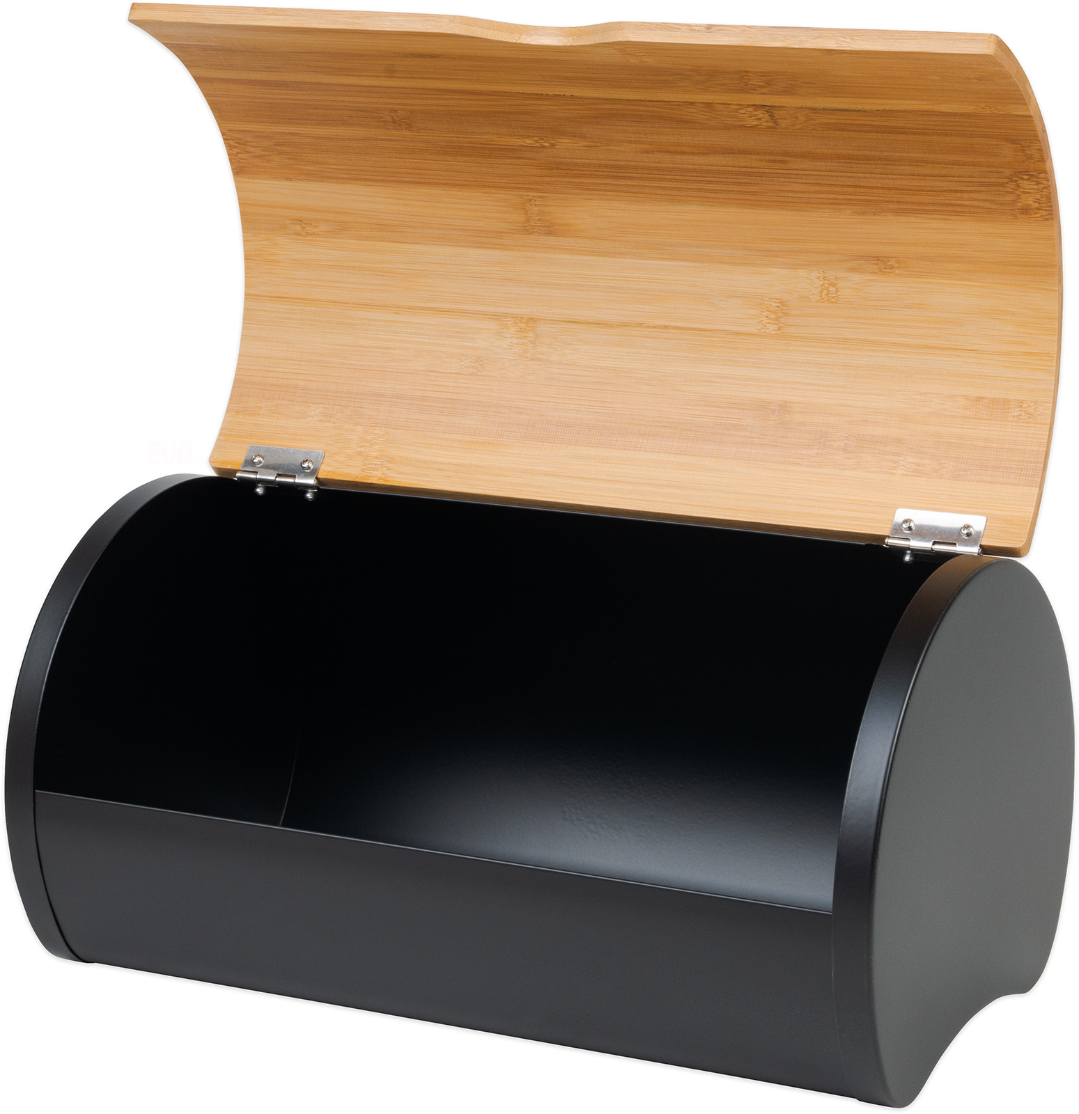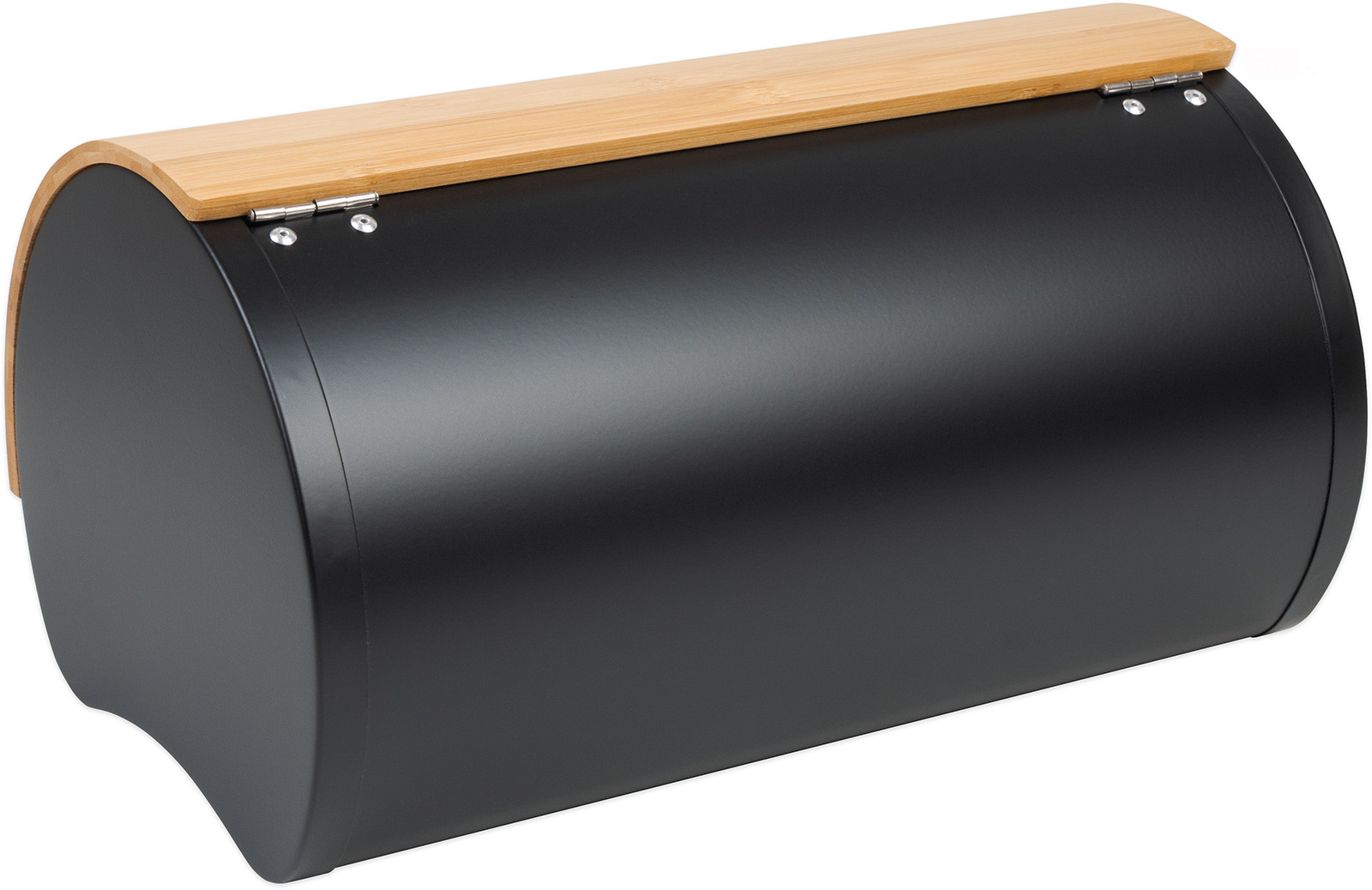 Černý ocelý chlebník s bambusovým víkem k uchování všech druhů pečiva, rozměry 39 x 28 x 18,5 cm , barva: dřevo/černá.