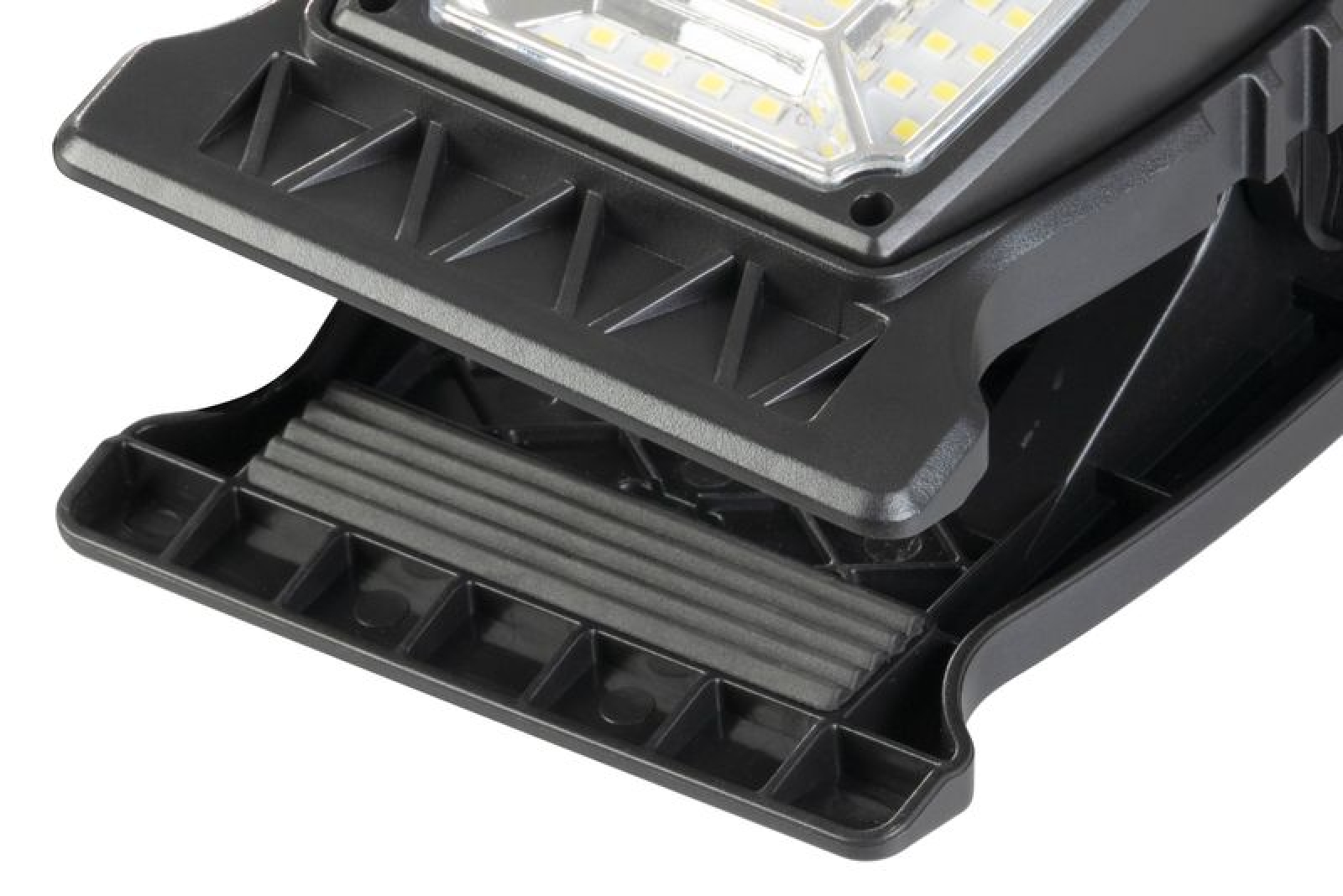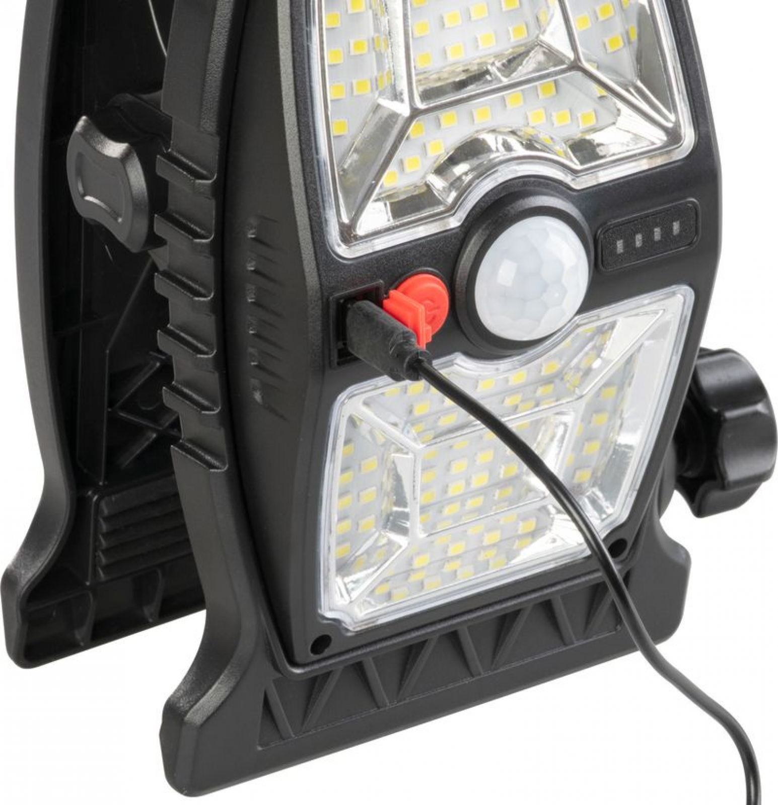 Nabíjecí solární lampa s pohybovým čidlem, které má dosah 3 m. Kombinuje svítivost 600 lm, chladnou teplotu světla 7000 K, dvě možnosti nabíjení, pohybový senzor s automatickým zapnutím a tři režimy svícení: Zapnutím se aktivuje automatické rozsvícení při pohybu. Opakovaným stisk celý popisem tlačítka volíte další režimy: 1. Tlumené světlo + pohyb – svítí stále slabě (55lm) a při pohybu se zesílí na 600 lm. 2. Trvalé svícení – svítí stále na 300 lm. 3. Světlo + pohyb – rozsvítí se na 20 s s maximální inentizou. Svítidlo má odolnost IPX4 (odolná stříkající vodě ze všech stran). Li-ion akumulátor 1200 mAh se nabíjí solárním panelem nebo přes USB-C (kabel součástí). Přenosné světlo má ovrory pro zavěšení. Díky pružině uprostřed jej lze také umístit podobně jako kolíček, klip či svorku. Rozevření čelistí je až 7 cm. Rozměry 22 x 11 × 10 cm.