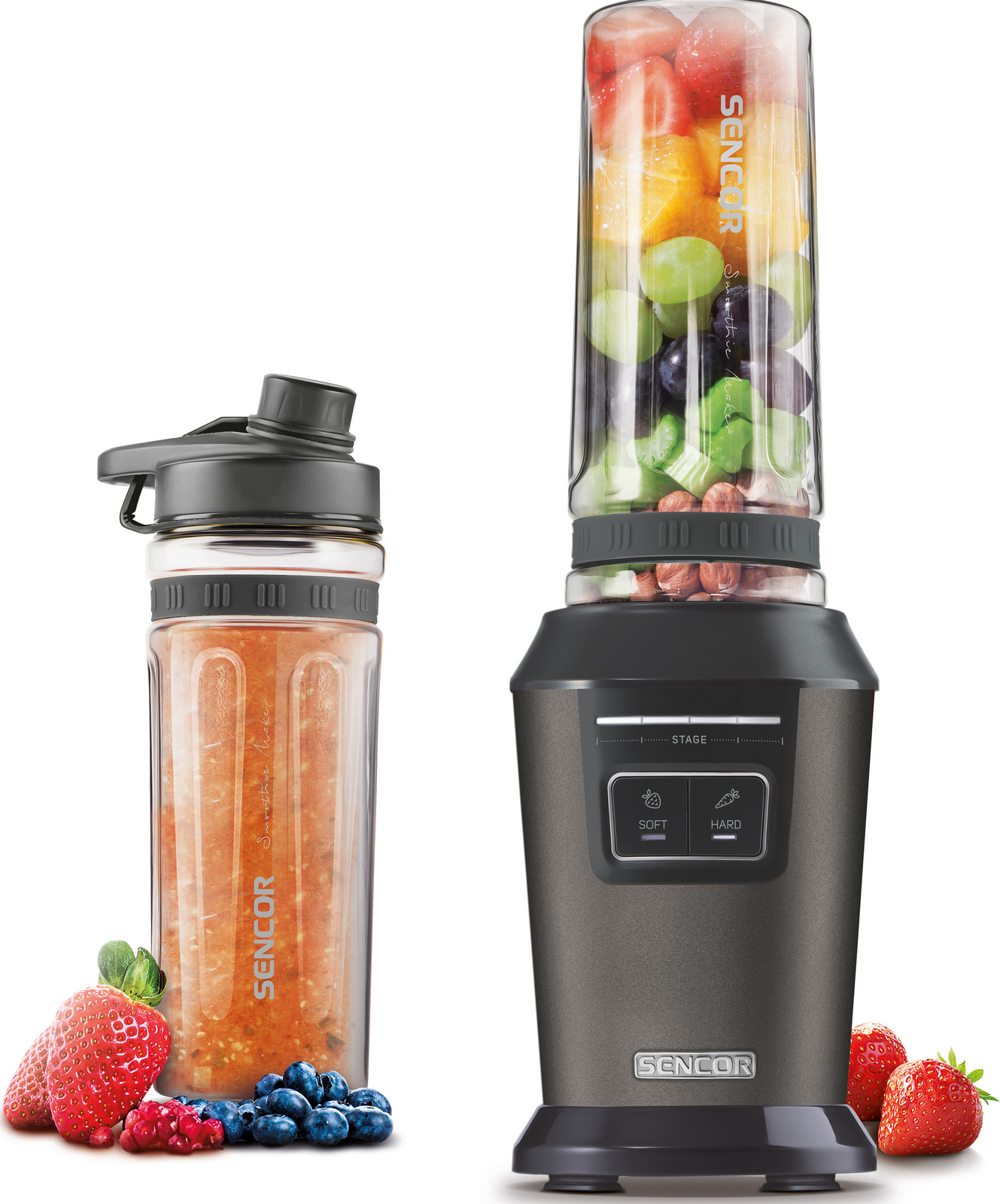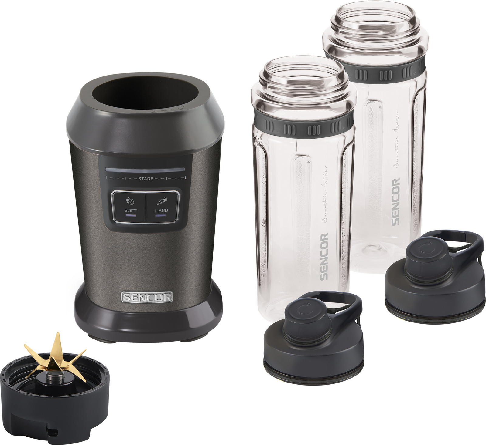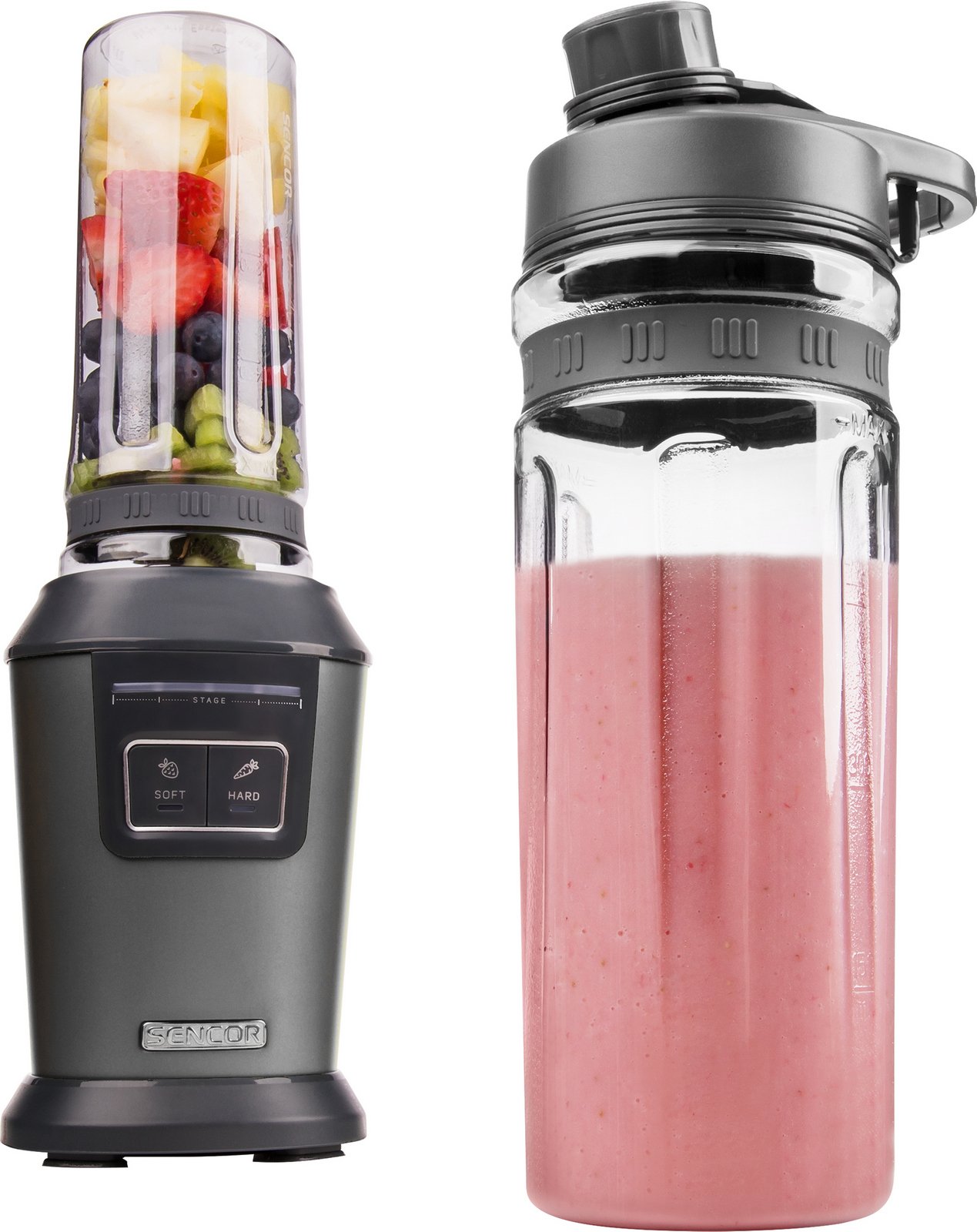 Nápojový mixér pro přípravu koktejlů, ovocných a zeleninových pyré, zajistí rychlé a výživné snídaně, svačiny občerstvení, vhodné do myčky, dva přednastavené programy pro vždy perfektní smoothie, v balení 2 x sportovní láhev z TRITANU, 2 x unikátní sportovní víčko s bezpečnostním celý popis uzávěrem, motor 800 W, protiskluzové nožičky, 6 vysoce kvalitní vyjímatelné čepele z nerezové oceli s povlakem z titanu, multicyklónový efekt, LED signalizace průběhu mixování, automatické vypnutí po ukončení programu.