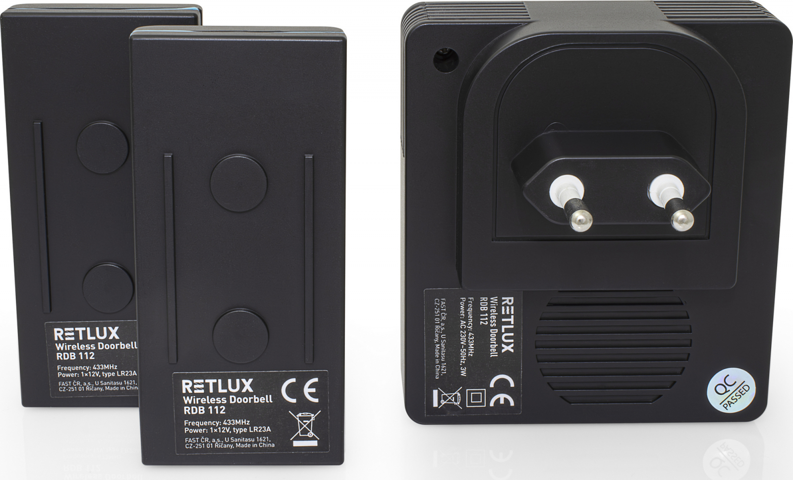 Bezdrátový zvonek, 2 x venkovní tlačítko, vnitřní jednotka pro zapojení do domovní zásuvky 230 V AC, 48 volitelných melodií, světelná LED signalizace zvonění na zvonku, stupeň krytí venkovního tlačítka IP44, nastavení hlasitosti zvonku ve čtyřech stupních, uchycení tlačítka pomoc celý popisí montážních otvorů, barva: bílá, dosah signálu v otevřeném prostranství: 150 m, přenosová frekvence: 433,92 MHz, pracovní teplota: tlačítko -20 °C až +65 °C, zvonek -20 °C až +55 °C. Rozměry zvonku 90 x 80 x 23 mm, hmotnost 95 g. Napájení zvonku~230 V 50 Hz. Rozměry tlačítka 85 x 40 x 21 mm, hmotnost 35 g. Napájení tlačítka 1 x LR23A (součást dodávky).