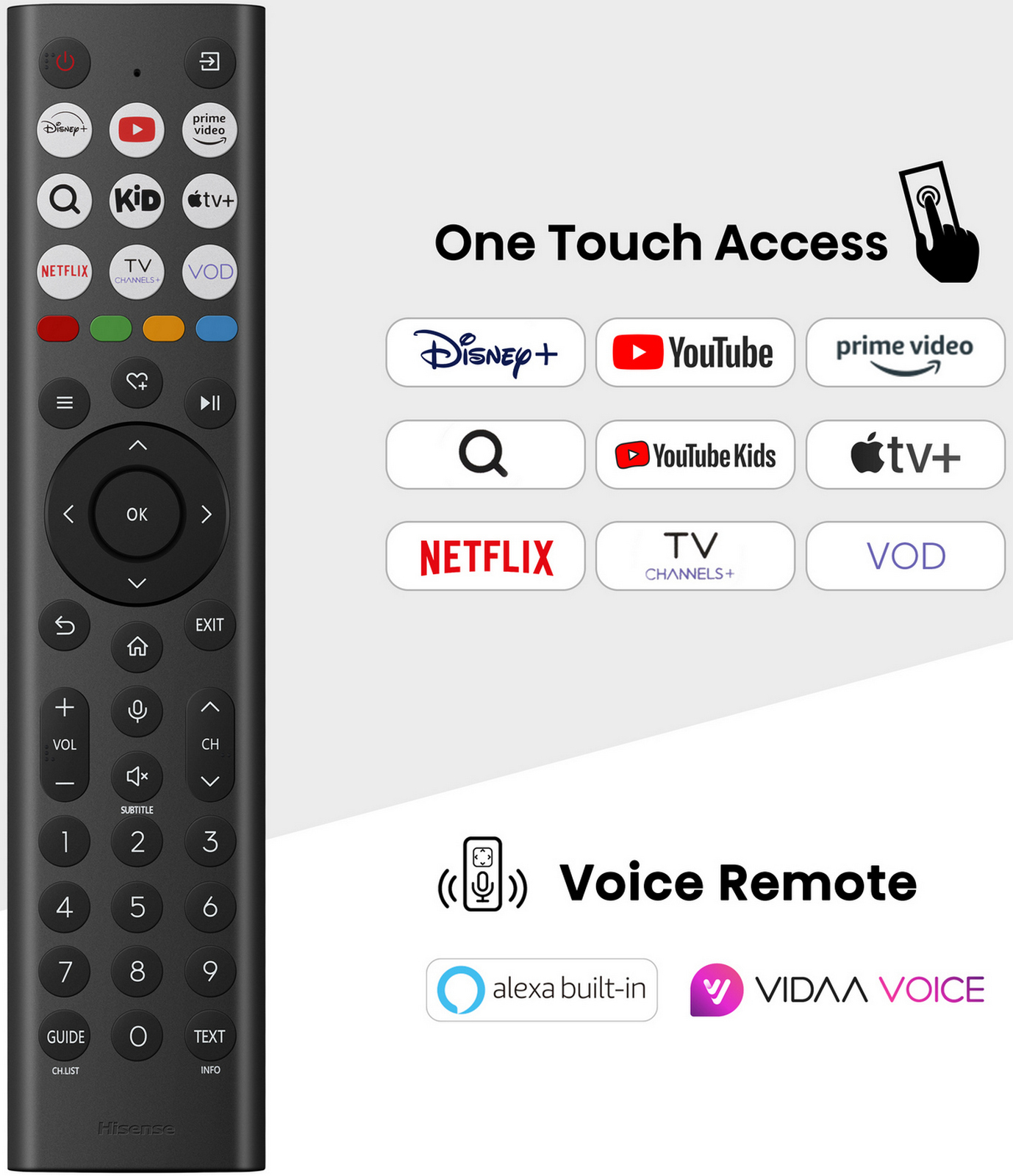Vyzkoušejte VIDAA Voice a posuňte ovládání televize na novou úroveň pohodlí. Jediným stisknutím tlačítka aktivujete hlasové příkazy. Snadno si vyhledejte opblíbený obash, procházejte pořady nebo změnte nastavení televize. To vše i v Češtině. Televize taky podporuje hlasového asistenta Amazon Alexa.