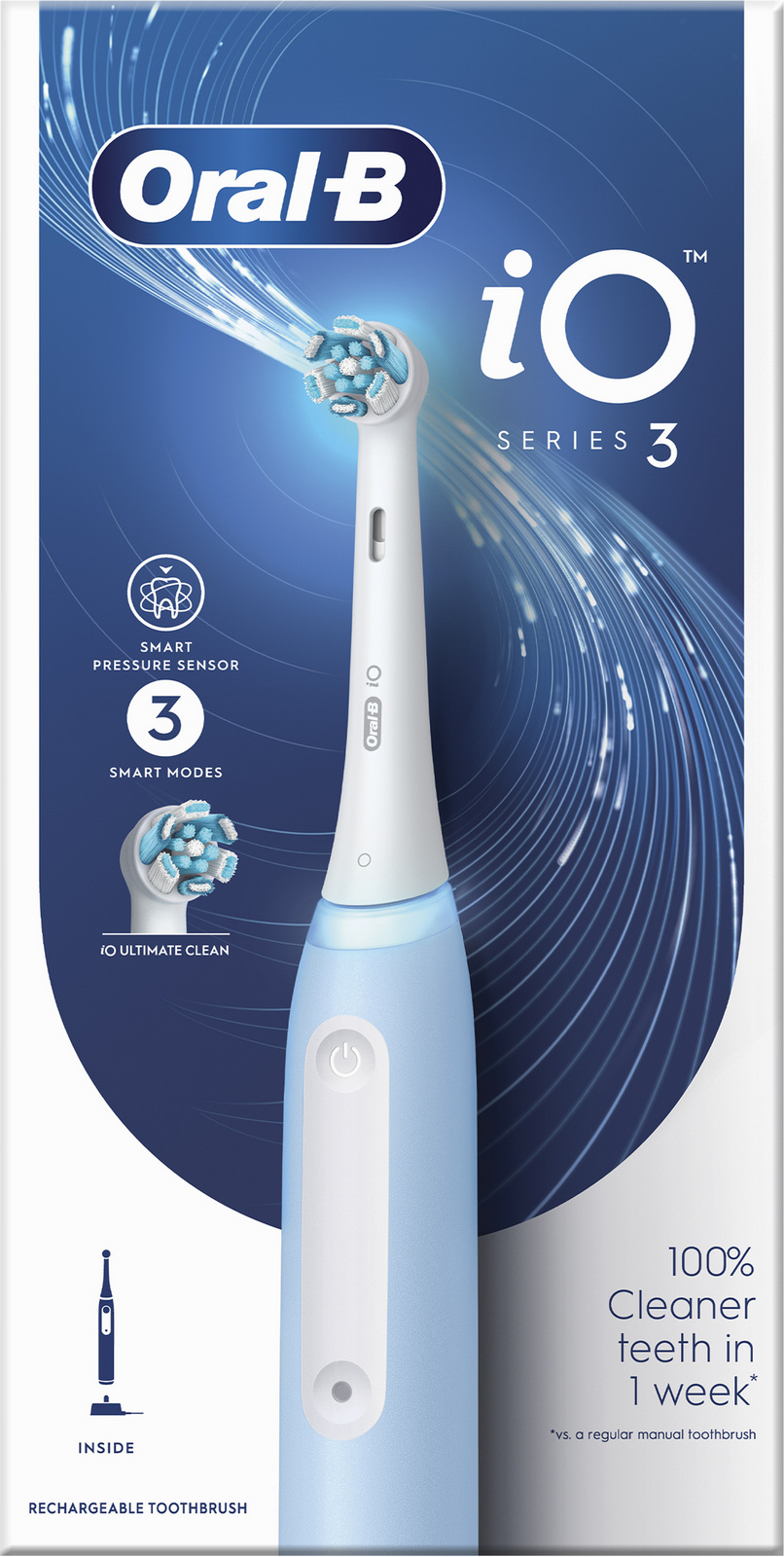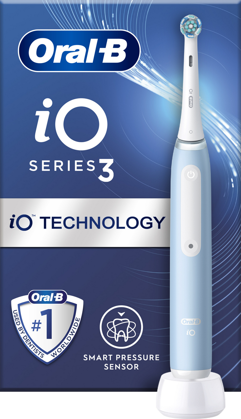 Elektrický zubní kartáček s moderní magnetickou technologií, jemnými mikrovibracemi a kulatou hlavicí, chrání dásně díky automatickému senzoru tlaku, který při příliš silném přítlaku zpomalí otáčky a rozsvítí červené světlo, 3 režimy čištění – jemný, šetrný a každodenní, 2minutov celý popisý časovač s upozorněním každých 30 sekund pro rovnoměrné čištění, tichý chod a jednoduchým ovládáním jedním tlačítkem, ergonomická rukojeť s protiskluzovým povrchem je vodotěsná a pohodlná na držení, výkonný akumulátorí s dlouhou výdrží a indikátorem nízkého nabití, součástí balení je jedna hlavice Oral-B iO, kompatibilní se všemi hlavicemi řady Oral-B iO včetně Ultimate Clean a Gentle Care, doporučená výměna hlavice je každé tři měsíce, barva modrá.