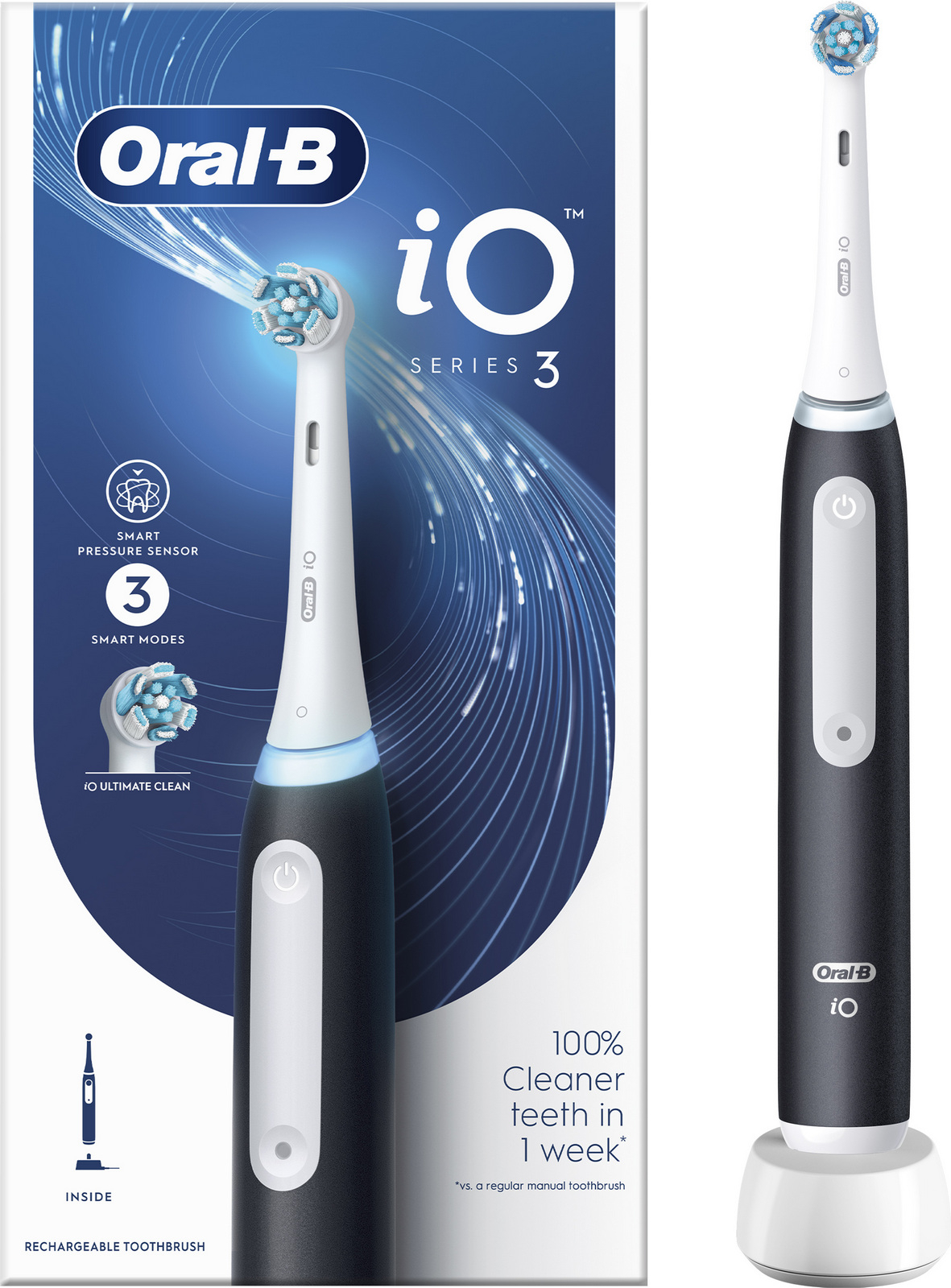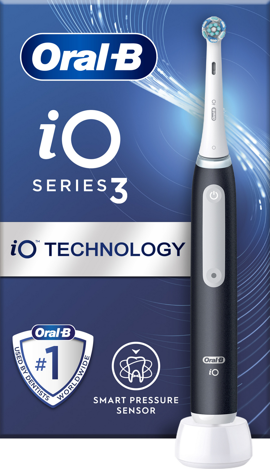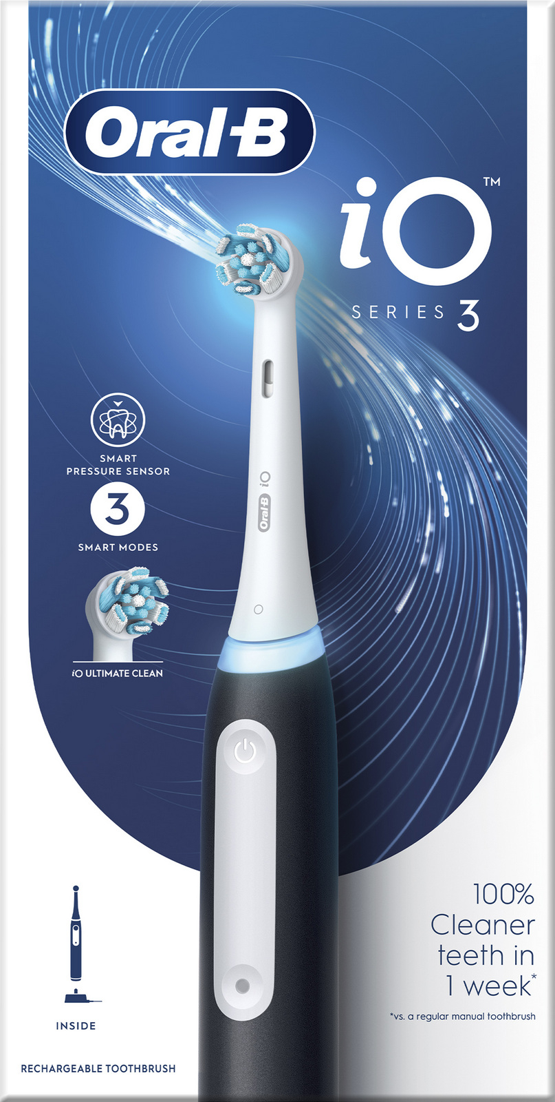 Elektrický zubní kartáček s moderní magnetickou technologií, jemnými mikrovibracemi a kulatou hlavicí, chrání dásně díky automatickému senzoru tlaku, který při příliš silném přítlaku zpomalí otáčky a rozsvítí červené světlo, 3 režimy čištění – jemný, šetrný a každodenní, 2minutov celý popisý časovač s upozorněním každých 30 sekund pro rovnoměrné čištění, tichý chod a jednoduchým ovládáním jedním tlačítkem, ergonomická rukojeť s protiskluzovým povrchem je vodotěsná a pohodlná na držení, výkonný akumulátorí s dlouhou výdrží a indikátorem nízkého nabití, součástí balení je jedna hlavice Oral-B iO, kompatibilní se všemi hlavicemi řady Oral-B iO včetně Ultimate Clean a Gentle Care, doporučená výměna hlavice je každé tři měsíce, barva černá.