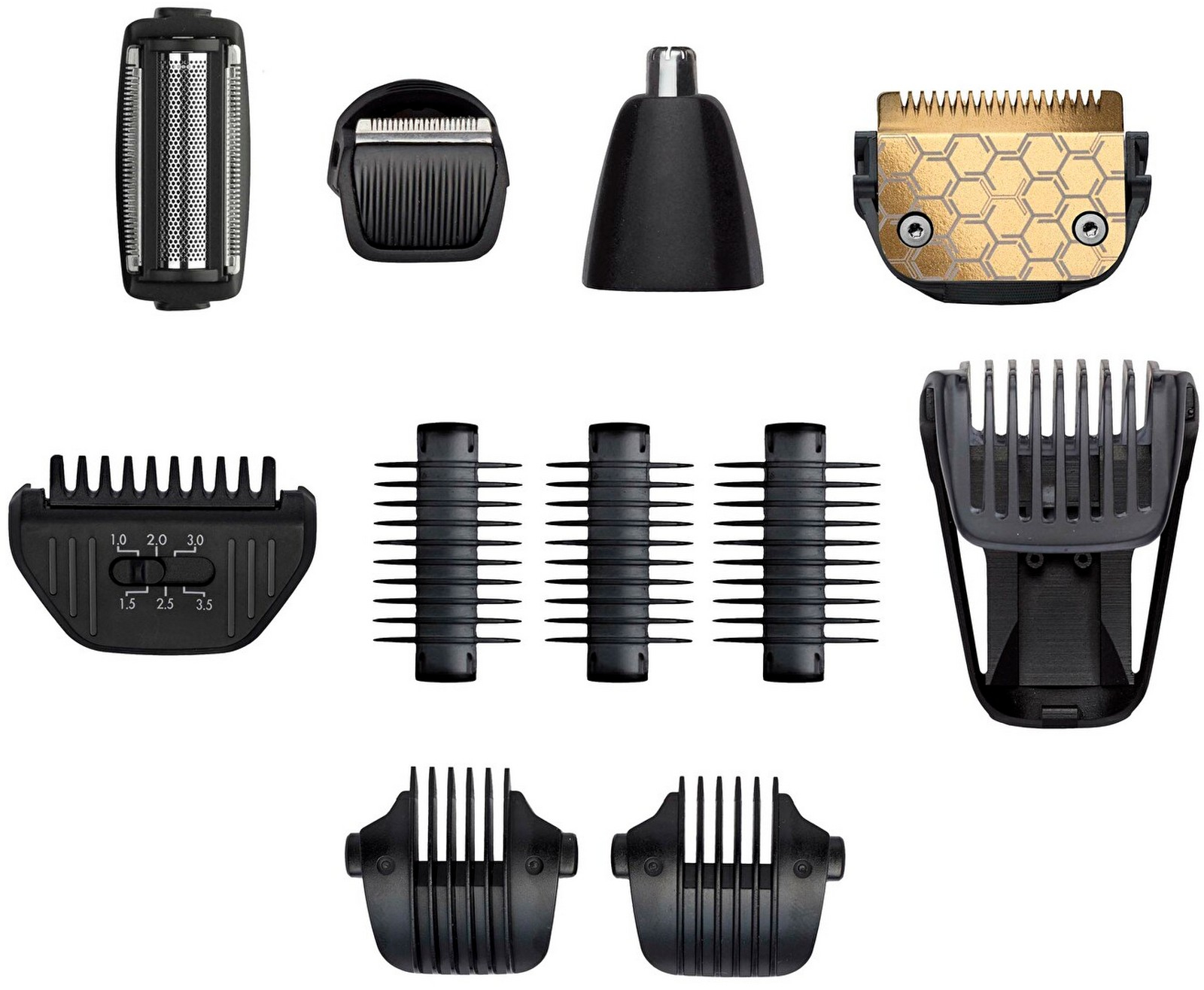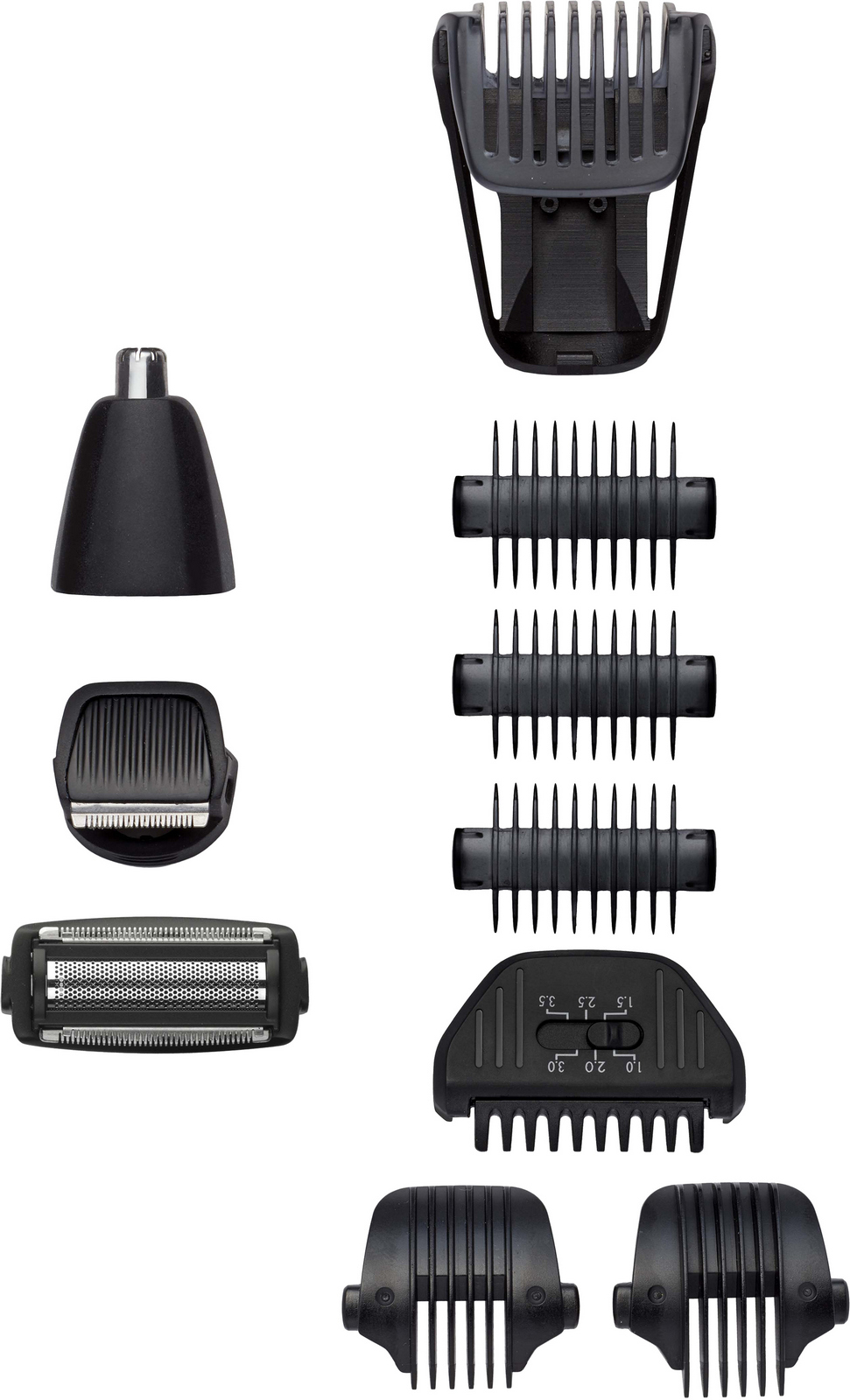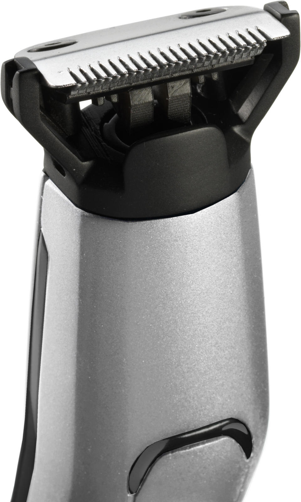 Multifunkční zastřihovač na vlasy, vousy a tělo, čepelí s titanovým povrchem, voděodolný, 11 různých nástavců, 32 mm čepel, nástavec na vousy (2-14mm), nástavec na strniště (1-3.5mm), 2x nástavec na obočí (3mm,5mm), 3x nástavec na tělo (3mm,5mm,7mm), umyvatelné nástavce, provozní celý popis doba 70 minut, doba nabíjení 8 hod. rozměry 180 x 220 x 95 mm, pouzdro, barva stříbrná/černá.