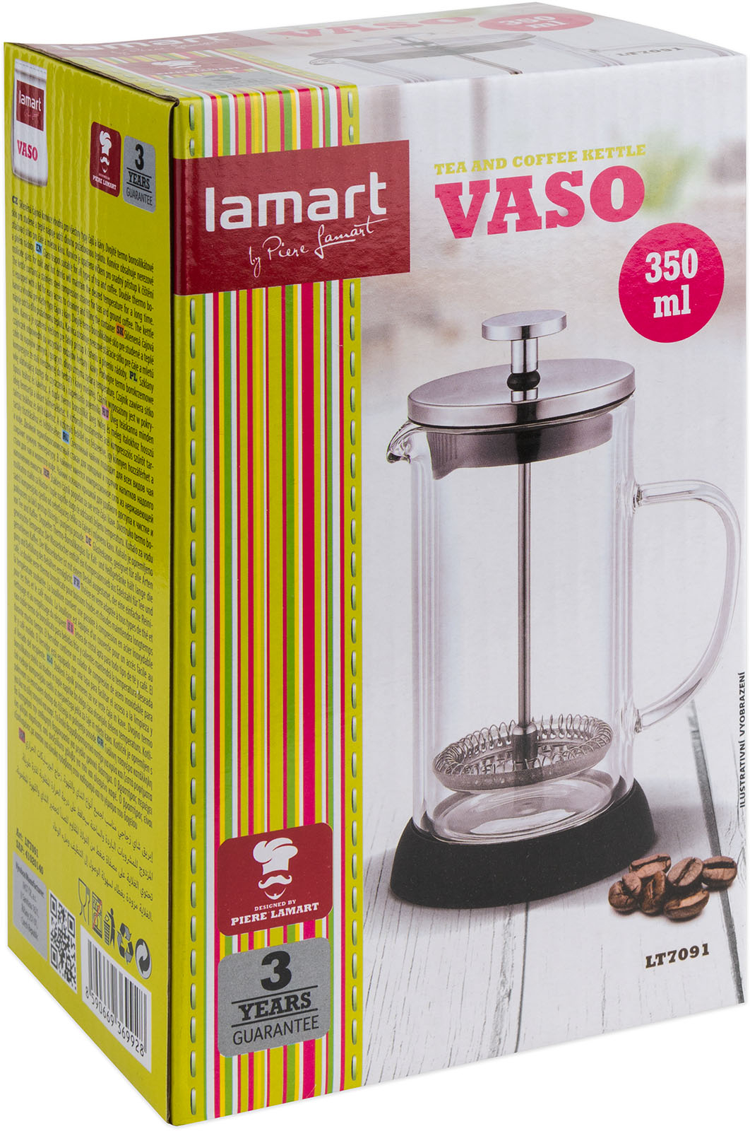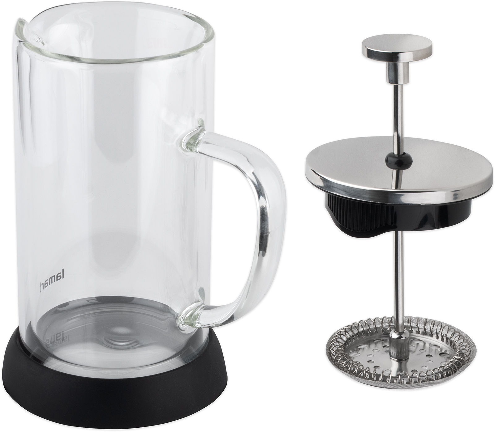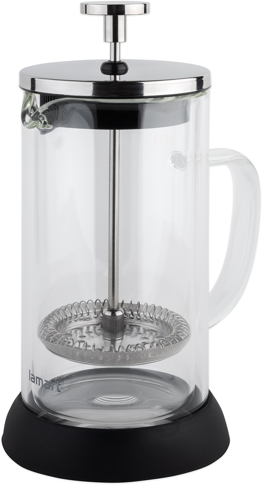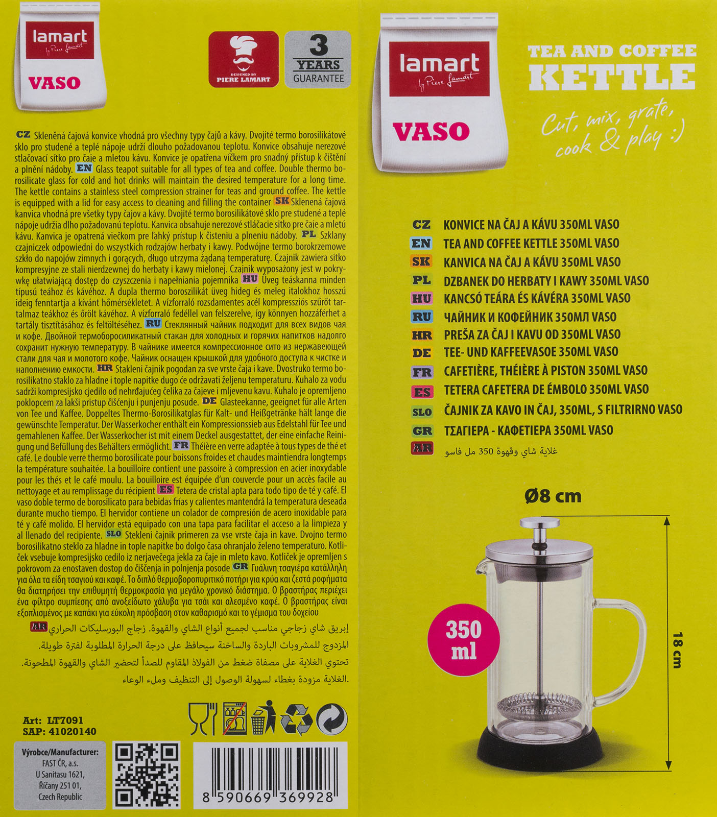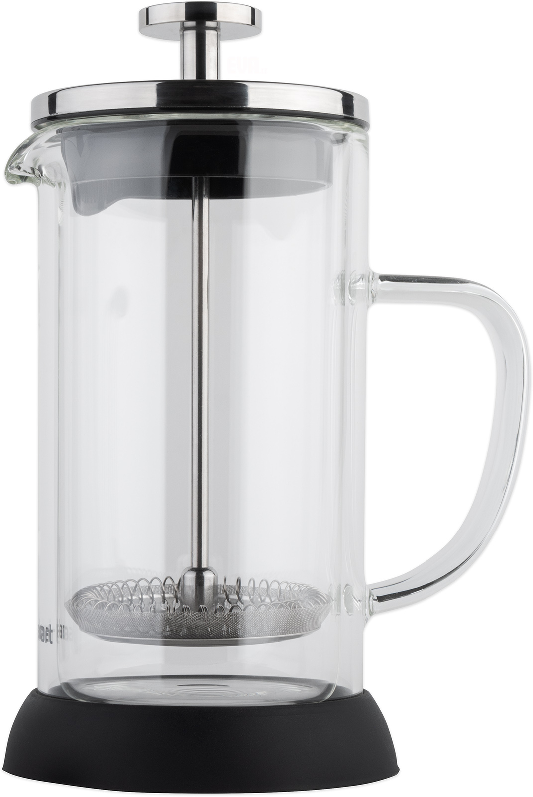 Skleněná čajová konvice vhodná pro všechny typy čajů a kávy, nerezové stlačovací sítko pro čaje a mletou kávu, konvice je opatřena plastovým víčkem pro snadný přístup k čištění a plnění nádoby, materiál: sklo, plast, barva: černá/nerez, objem 350 ml, průměr 8 cm, výška 18 cm.