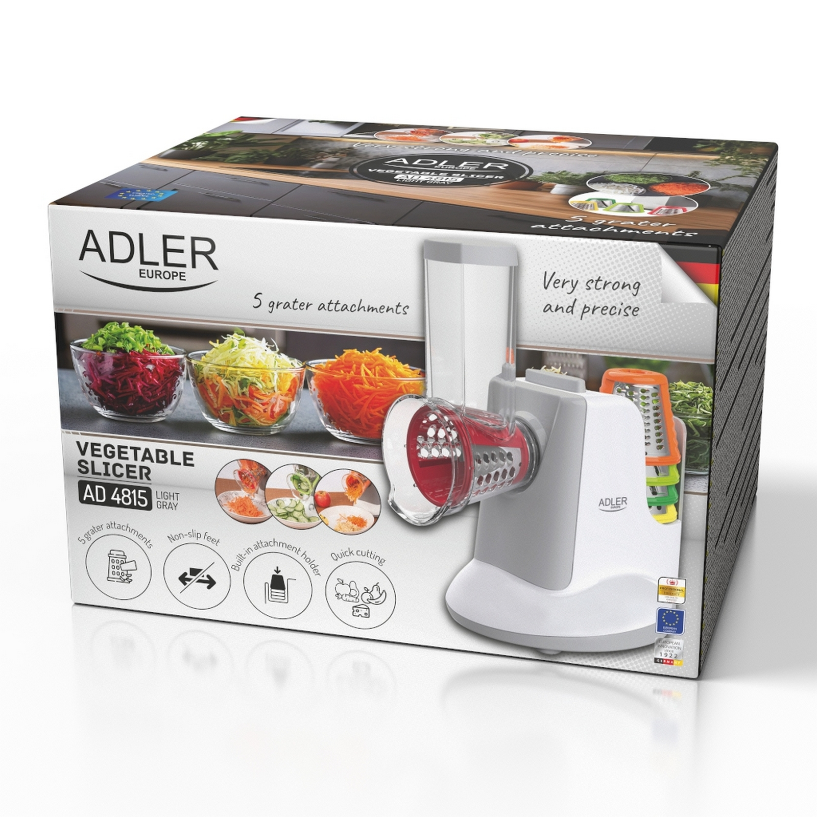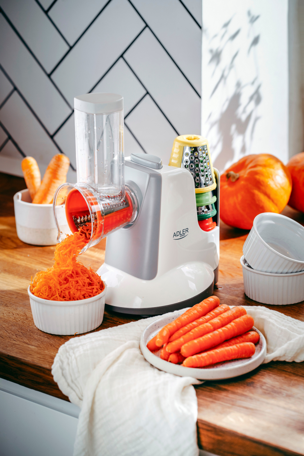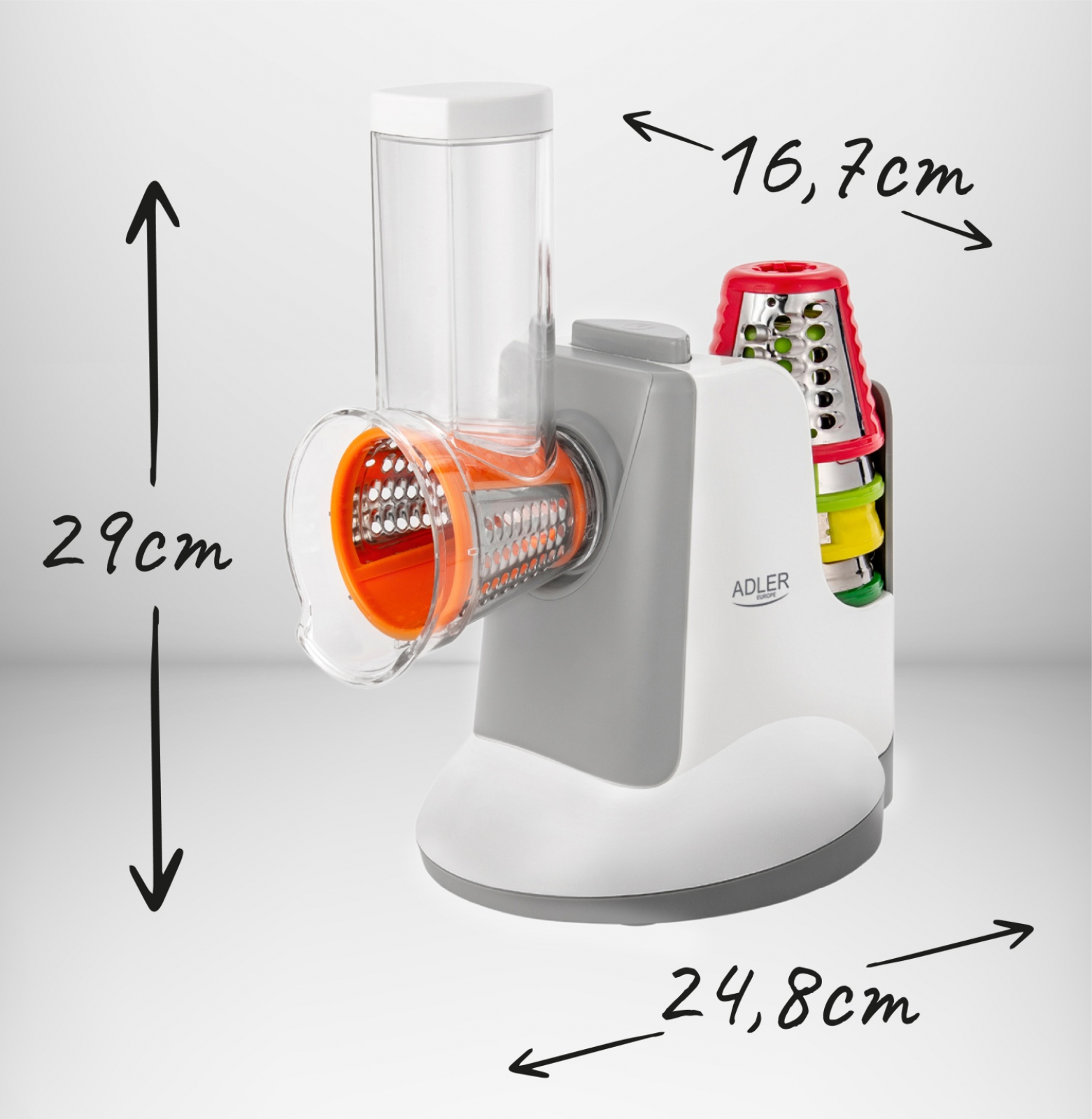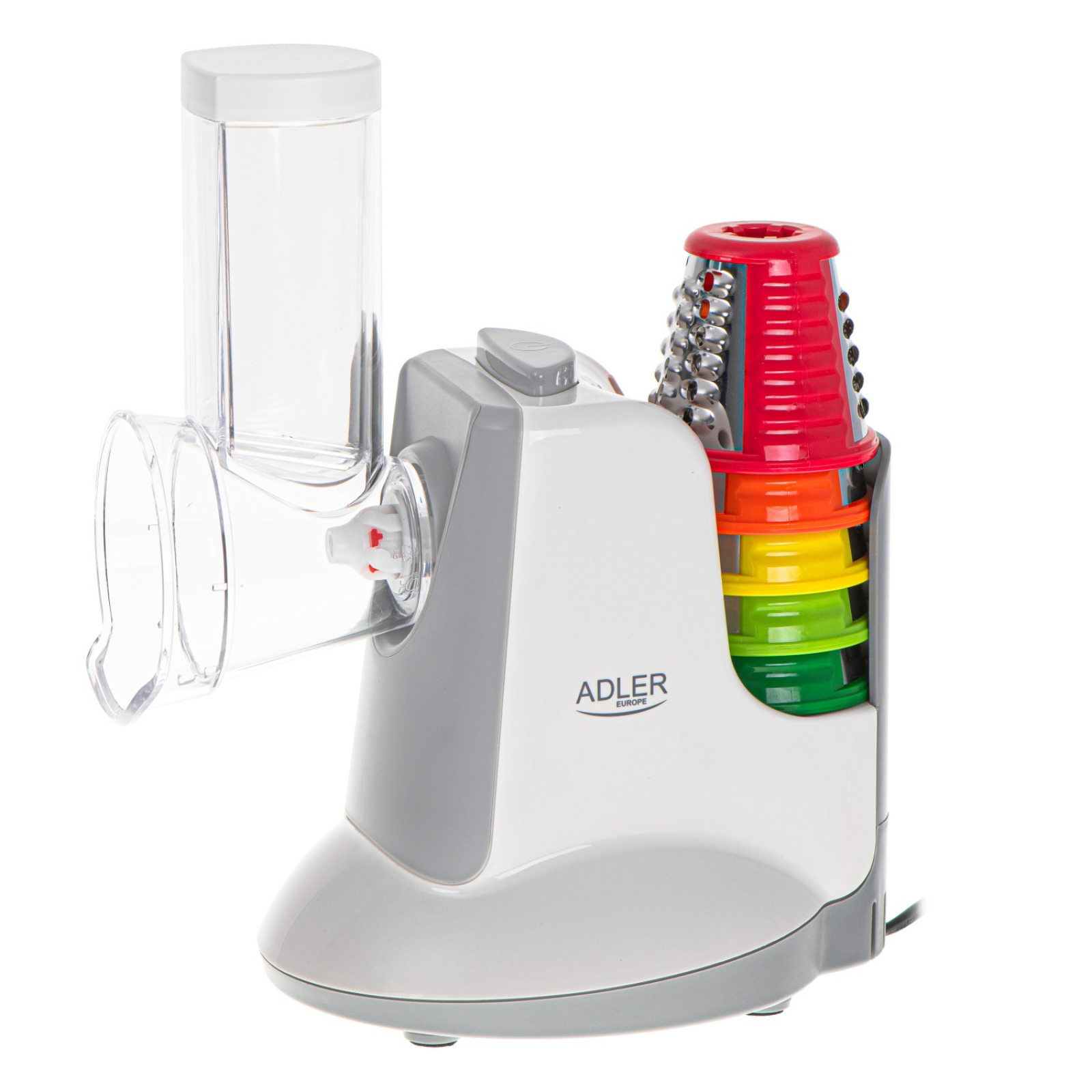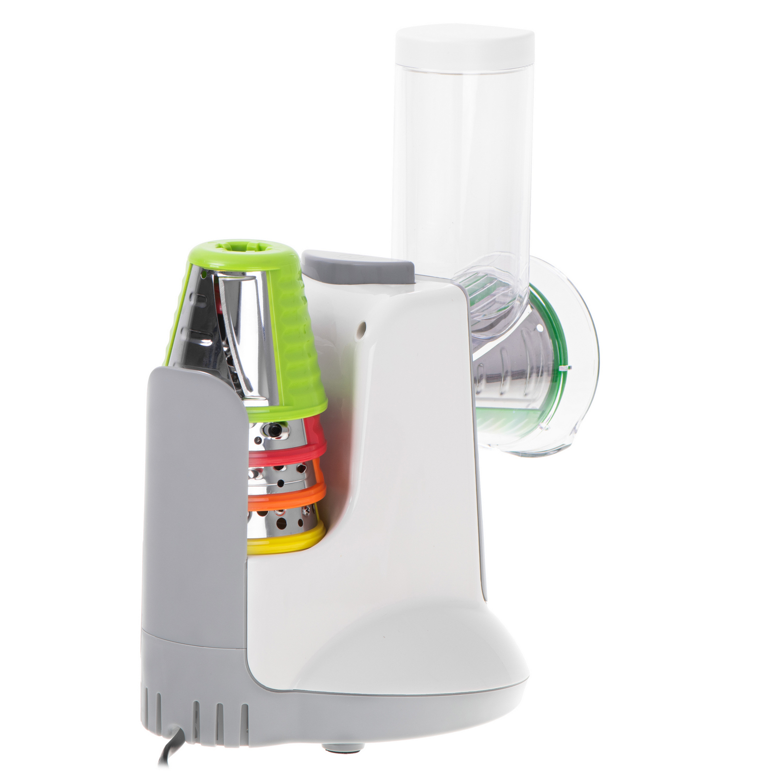 Elektrický krouhač zeleniny s příkonem 150 W, 5 výměnných struhadel pro hrubé a jemné strouhání, krájení na plátky a mletí, integrovaný držák pro uložení nástavců přímo na těle přístroje, protiskluzové nožičky, délka napájecího kabelu 75 cm, materiál ABS plast, napájení 220–240 V celý popis, maximální doba nepřetržitého provozu 3 minuty, hmotnost 1,6 kg, rozměry 25 x 17 x 29 cm, bílé barevné provedení s šedými detaily.