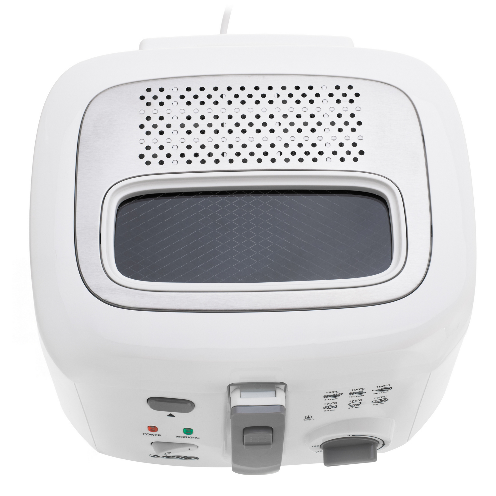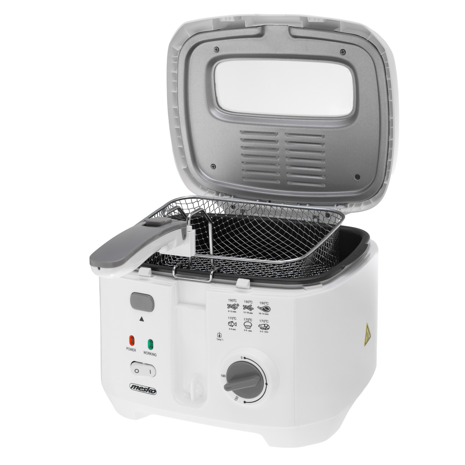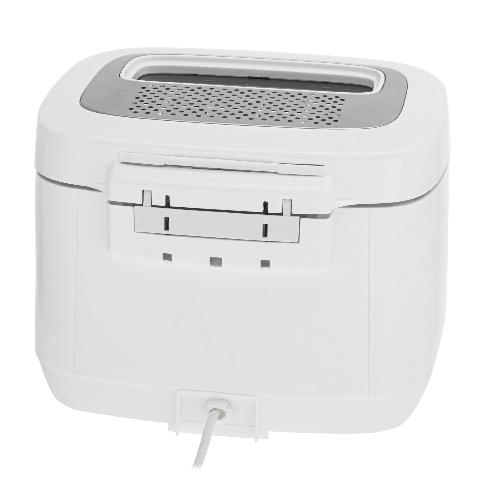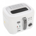 Fritéza s objemem 2,5 l, příkon 1800 W, vyjímatelná nádoba na olej, nastavitelný termostat, víko s filtrem a průzorovým okénkem, fritovací koš se sklopnou rukojetí a funkcí zdvihu, tlačítko pro mechanické otevírání víka, světelná indikace provozu a připravenosti, délka přívodního celý popis kabelu 97 cm, rozměry (š x v x h): 300 x 285 x 218 mm, hmotnost 2,59 kg, bílá se stříbrnými detaily.