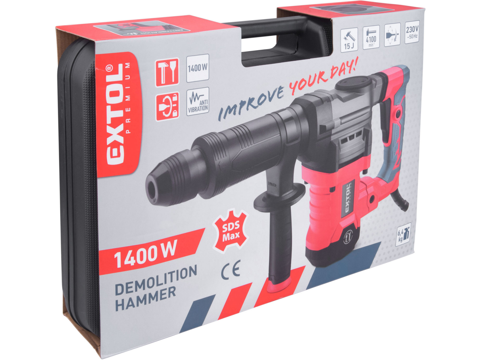 Sekací kladivo SDS MAX s energií úderu 15 J je výkonný nástroj určený pro stavební a demoliční práce, kde běžné vrtací kladivo nestačí, zejména při bourání betonu, kamene nebo cihel. Nabízí ideální kompromis mezi vysokou silou a dobrou ovladatelností, takže umožňuje jak efektivní celý popis demolice, tak přesnější odsekávání omítek, dlažby či lepených povrchů. Robustní systém SDS MAX zajišťuje pevné uchycení nástroje a maximální přenos rázové energie, zatímco antivibrační konstrukce a ergonomická protiskluzová rukojeť zvyšují komfort i při delší práci. Kladivo má příkon 1400 W, dosahuje až 4100 úderů za minutu, je vybaveno zámkem spínače pro nepřetržitý provoz, otočnou rukojetí v rozsahu 360° a dodává se v kufru. Hmotnost stroje 6,4 kg.