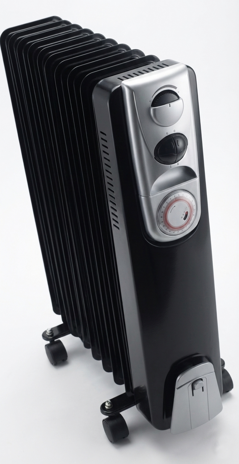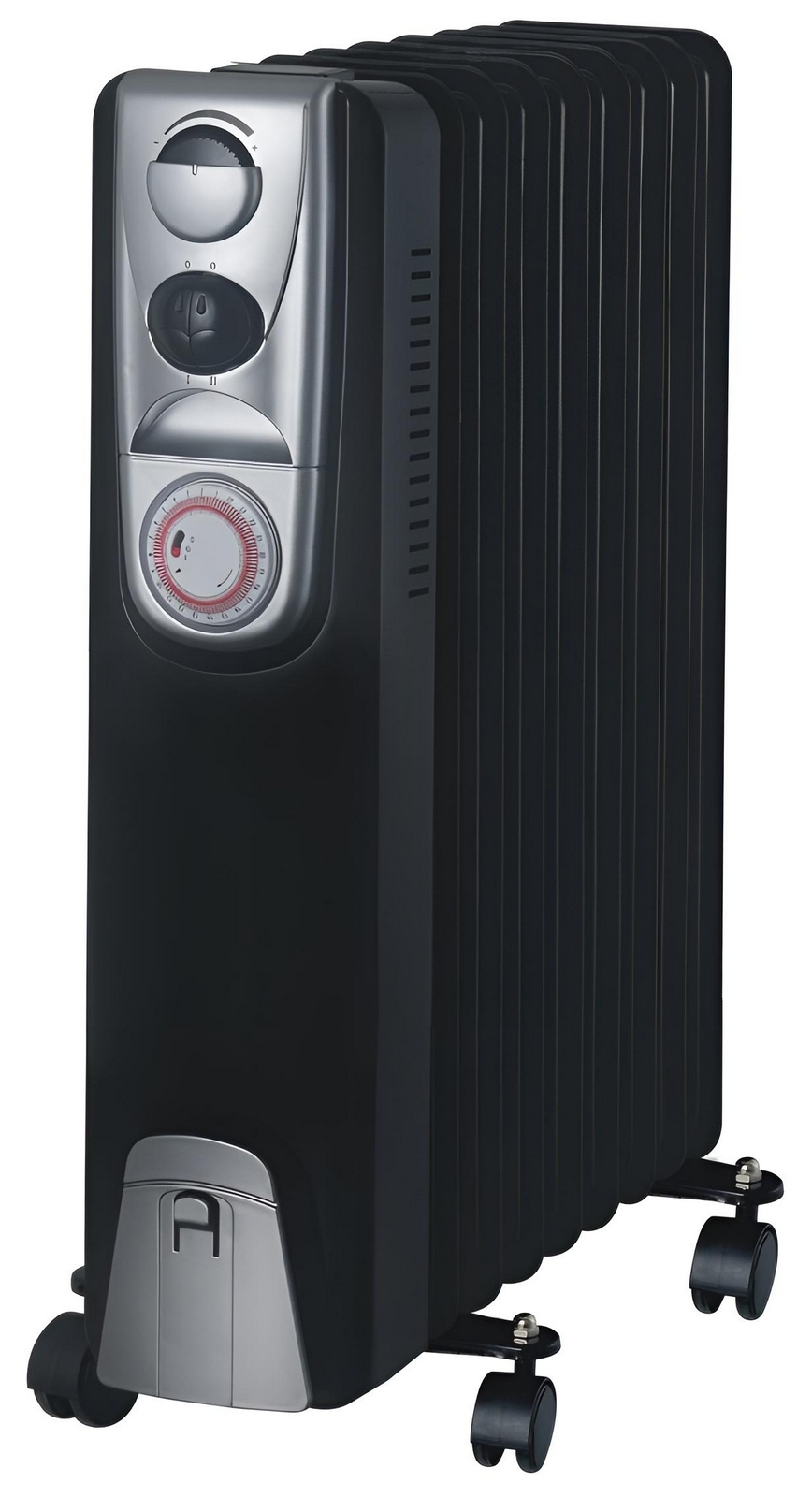 Olejový radiátor s 9 žebry v černém provedení se stříbrnými detaily, tři nastavitelné stupně výkonu 800 W, 1200 W a 2000 W, integrovaný 24hodinový časovač s nastavitelnými intervaly provozu, termostat pro plynulou regulaci teploty, bezpečnostní pojistka proti přehřátí, automatick celý popisé vypnutí při převržení, světelná kontrolka provozu, prostor pro navinutí napájecího kabelu, čtyři pojezdová kolečka, napájení 220–240 V.