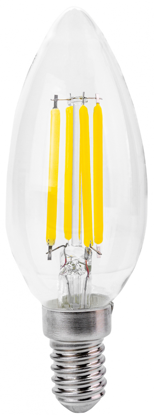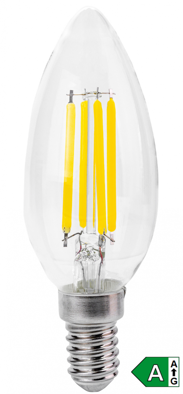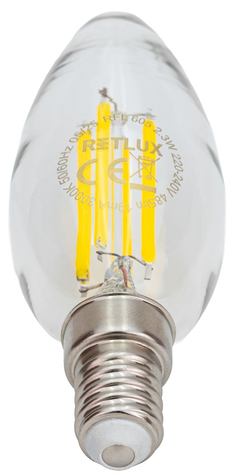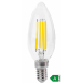Retro LED žárovka, energetrická třída A, příkon 2,3 W, závit E14 svítivost 485 lm, teplota světla 3000 K (teplé světlo), typ baňky svíčka C35, životnost 25 000 h, nahradí 41 W klasickou žárovku, velký úhel vyzařování 330 stupňů.