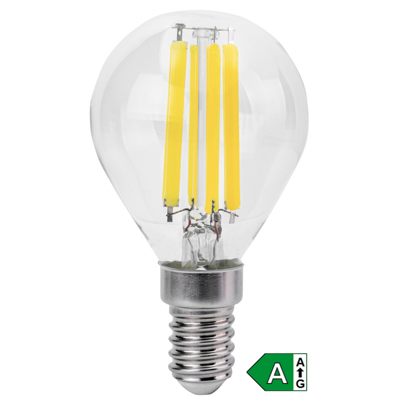 Retro LED žárovka typ , malá baňka, energetrická třída A, příkon 4 W, závit E14 svítivost 840 lm, teplota světla 3000 K (teplé světlo), typ baňky mini globe G45, životnost 25 000 h, nahradí 62 W klasickou žárovku, velký úhel vyzařování 330 stupňů.