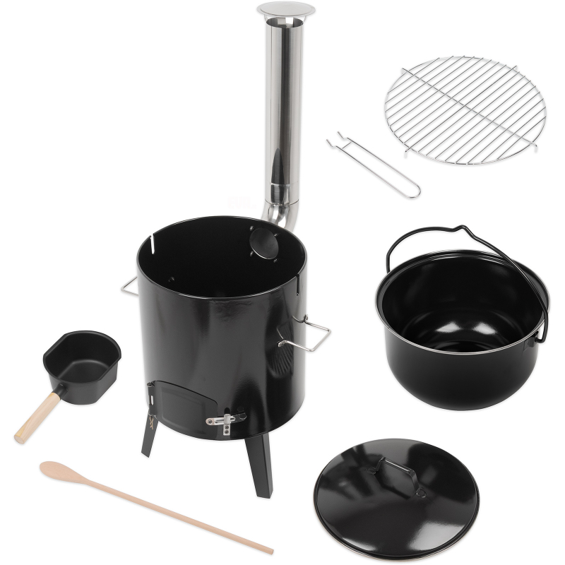 Venkovní kotlová souprava určená pro vaření na otevřeném ohni, objem smaltovaného kotlíku 14 l, jmenovitý tepelný výkon 0,9 kW, účinnost min. 20 %, doporučené palivo dřevo, spotřeba paliva cca 1,5 kg/h , provozní tah komína 5 Pa, konstrukce z oceli se smaltovanou povrchovou úprav celý popisou, nerezový komín s průměrem 76 mm, součástí balení kotlina, kotlík s poklicí, grilovací rošt, nádoba na popel, naběračka a dřevěná vařečka, černá barva s nerezovými detaily, rozměry (š x v x h): 490 x 960 x 460 mm, hmotnost 6,80 kg.