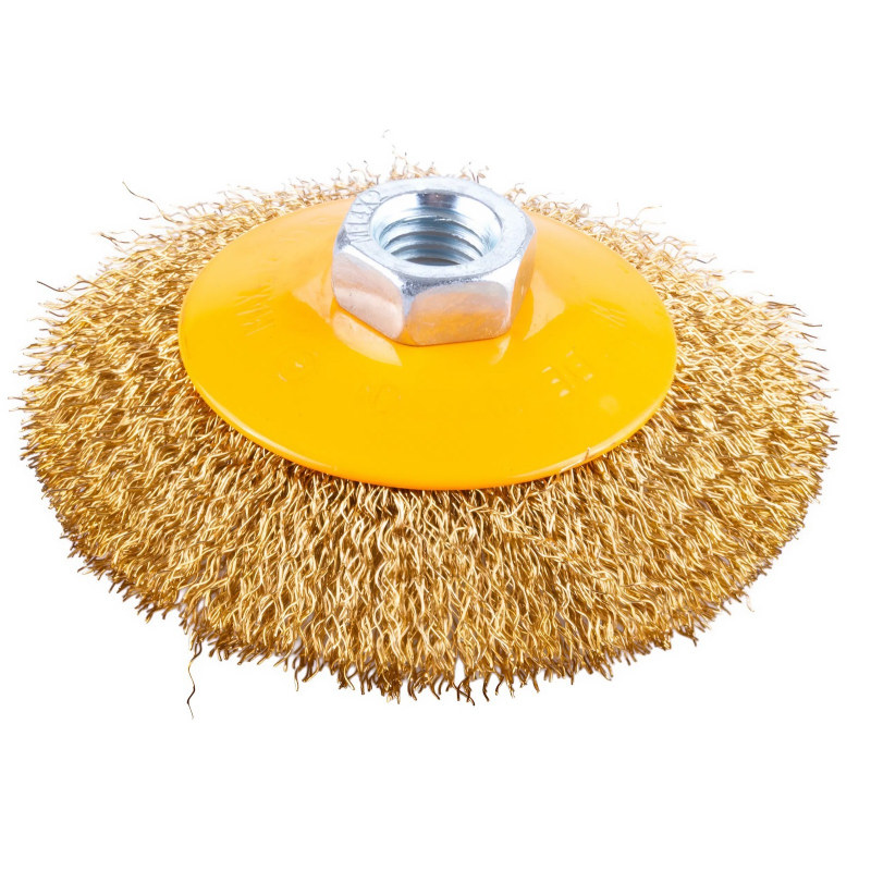 Ocelový kartáč pro upnutí do úhlové brusky, závit M14, max. otáčky 12 500 min, průměr kartáče 120 mm, pro čištění větších povrchů dřeva, kovů, plastů.