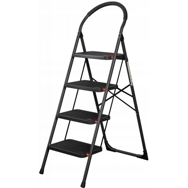 Ocelové 4 - stupňové skládací schůdky, stabilní konstrukce, nosnost 150 kg, výška posledního schodu 98 cm, čtyři velké protiskluzové schůdky 38 x 26 cm, měkká rukojeť pro větší pohodlí při přenášení, rozměr schůdků po složení (š x v x h) 48 x 9 x 150,5cm.