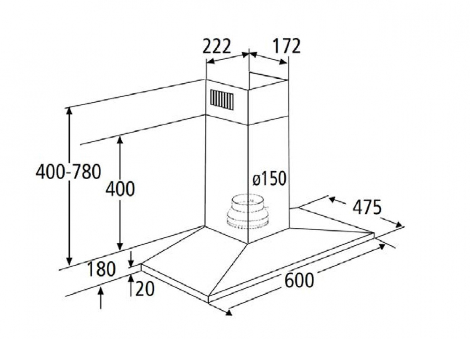 Komínový odsavač par, šířka 60 cm, provedení z nerezové oceli, maximální výkon odtahu 348 m3/h, 3 stupně rychlosti, ovládání pomocí tlačítek, možnost recirkulace i odtahu do komína, LED osvětlení 2 × 2 W, hlučnost 64 dB, roční spotřeba energie 28 kWh, v energetické třídě B, 2 hli celý popisníkové tukové filtry omyvatelné v myčce, možnost dokoupení uhlíkového filtru, stříbrná barva.