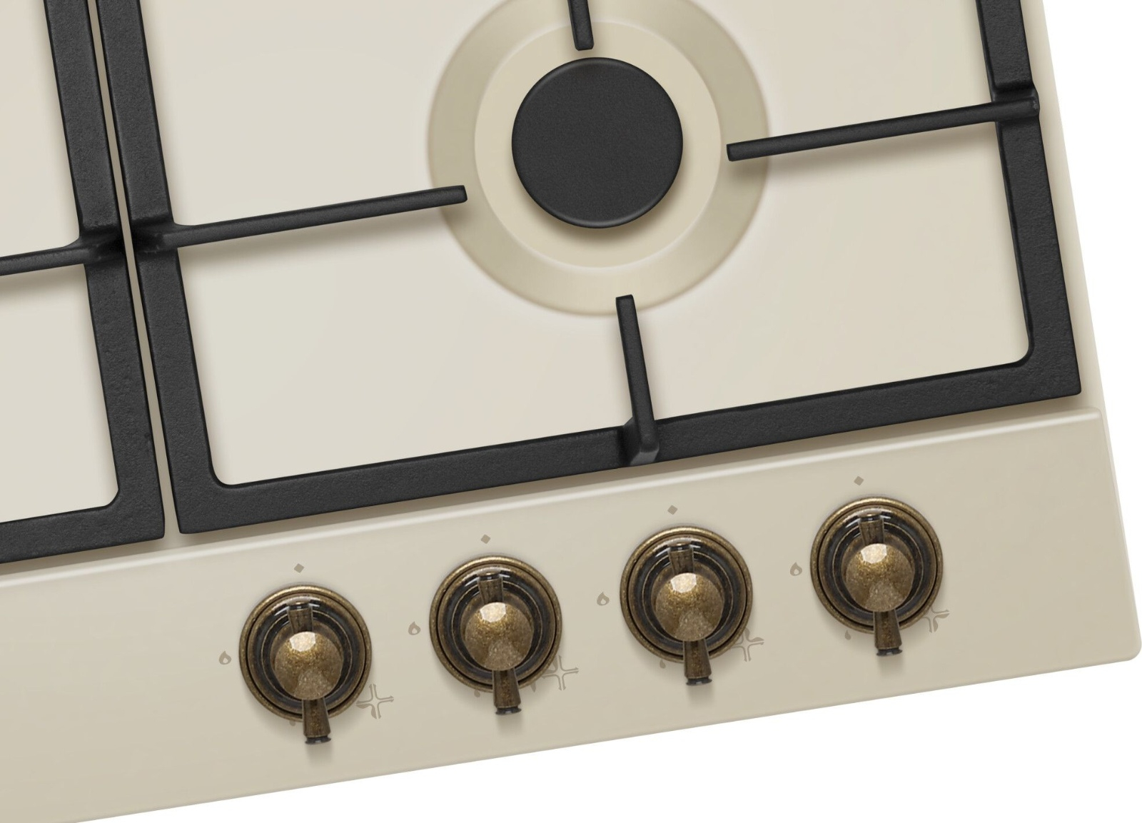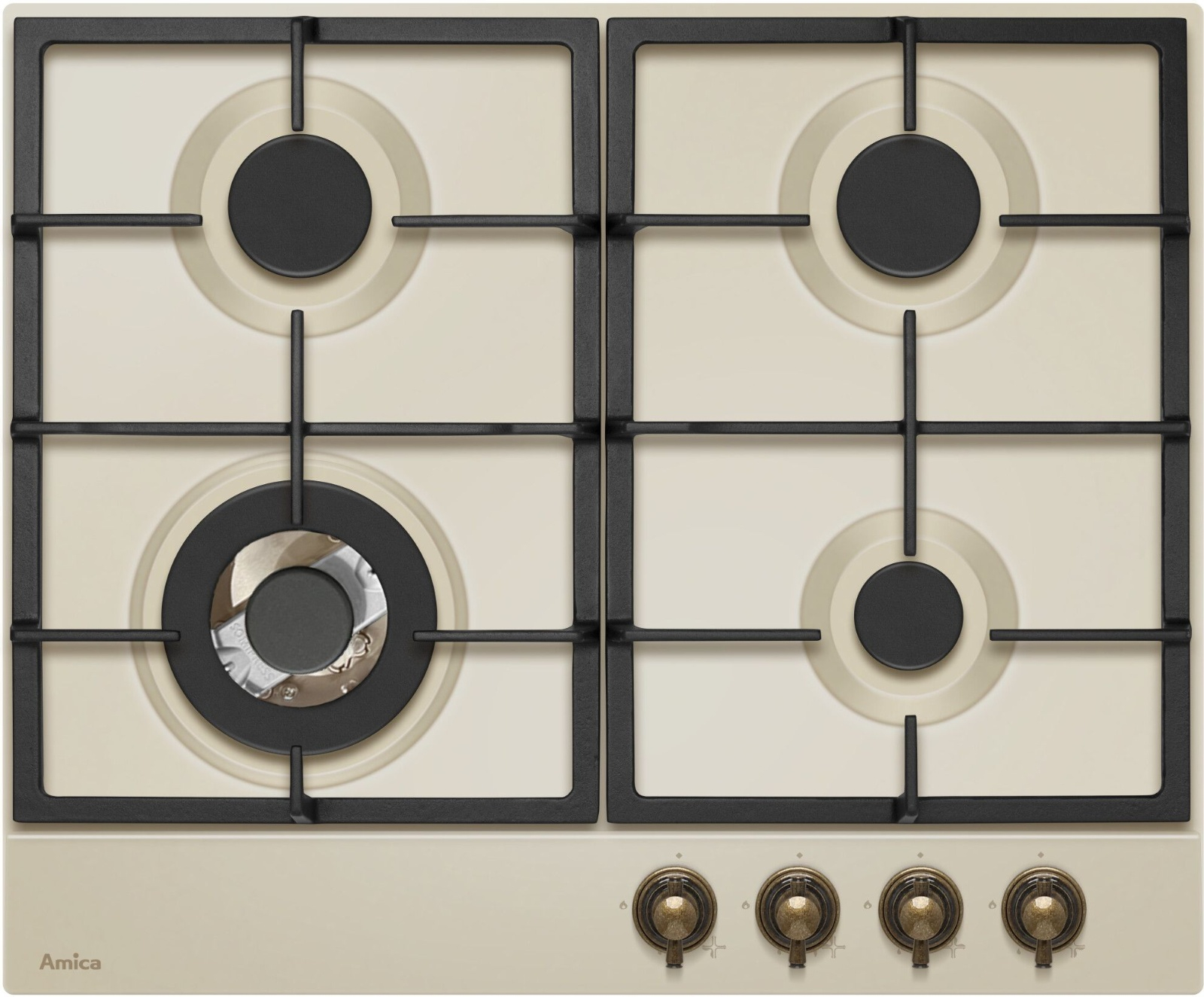 Plynová varná deska v retro stylu se 4 hořáky, 1 hořák wok s tepelným zatížením 2,8 kW, 2 střední hořáky s tepelným zatížením 1,8 kW, 1 malý hořák s tepelným zatížením 1,0 kW, elektrické zapalování integrované v každém ovládacím knoflíku, bezpečnostní pojistka hořáků proti úniku celý popisplynu, stabilní rošty pod nádobí, připojení G 1/2", napájení 230 V, hmotnost 10,3 kg, (š x v x h): 590 x 52 x 520 mm, barevné provedení slonová kost
