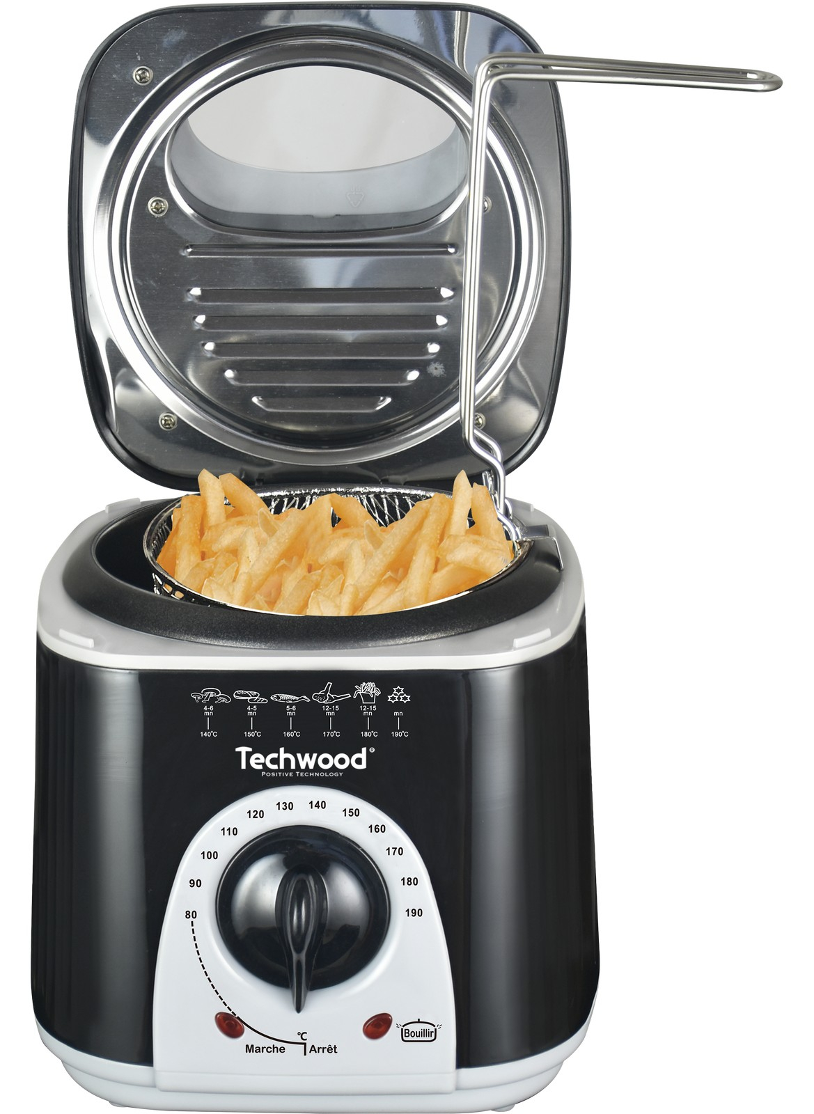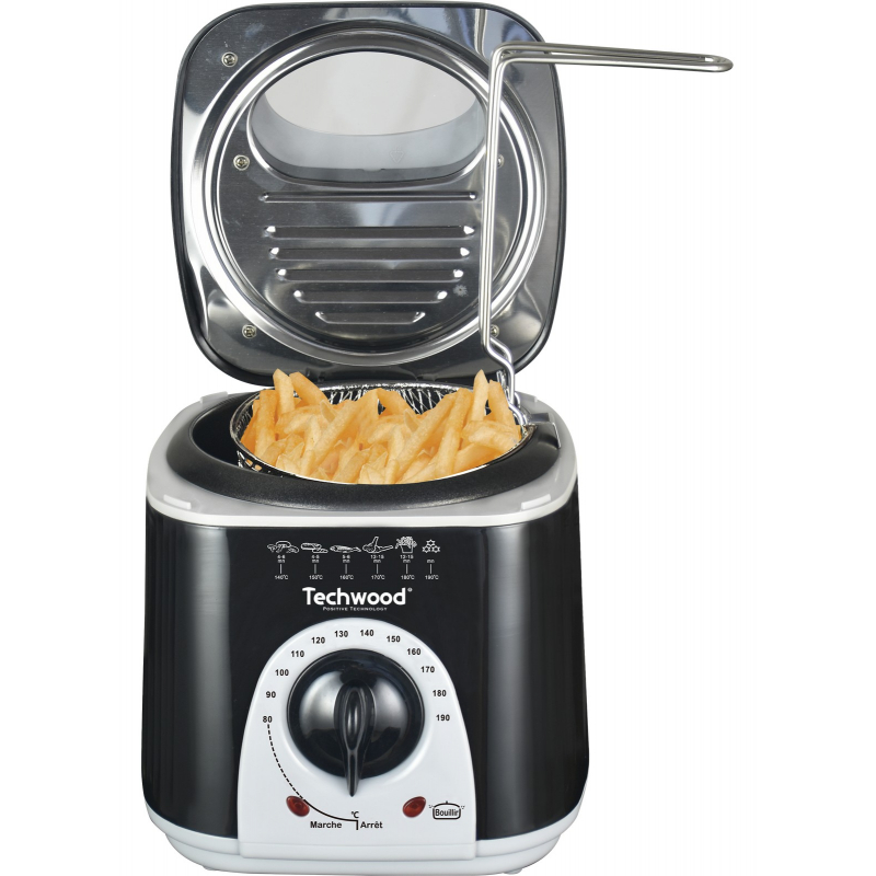 Nerezová fritéza a fondue set v jednom, objem olejové nádoby 1 litr (maximální doporučený objem oleje 0,8 l), nastavení teploty od 80°C do 190°C, nádoba s nepřilnavým povrchem, nastavitelný termostat, světelná signalizace nahřívání a provozu, bezpečnostní tepelná pojistka, odníma celý popistelné víko s průhledným okénkem, integrovaný permanentní filtrační systém, příslušenství: fondue set 6 vidliček, fritovací koš. Příkon max. 950 W, hmotnost 1,4 kg, rozměry (š x v x h): 220 x 205 x 195 mm.