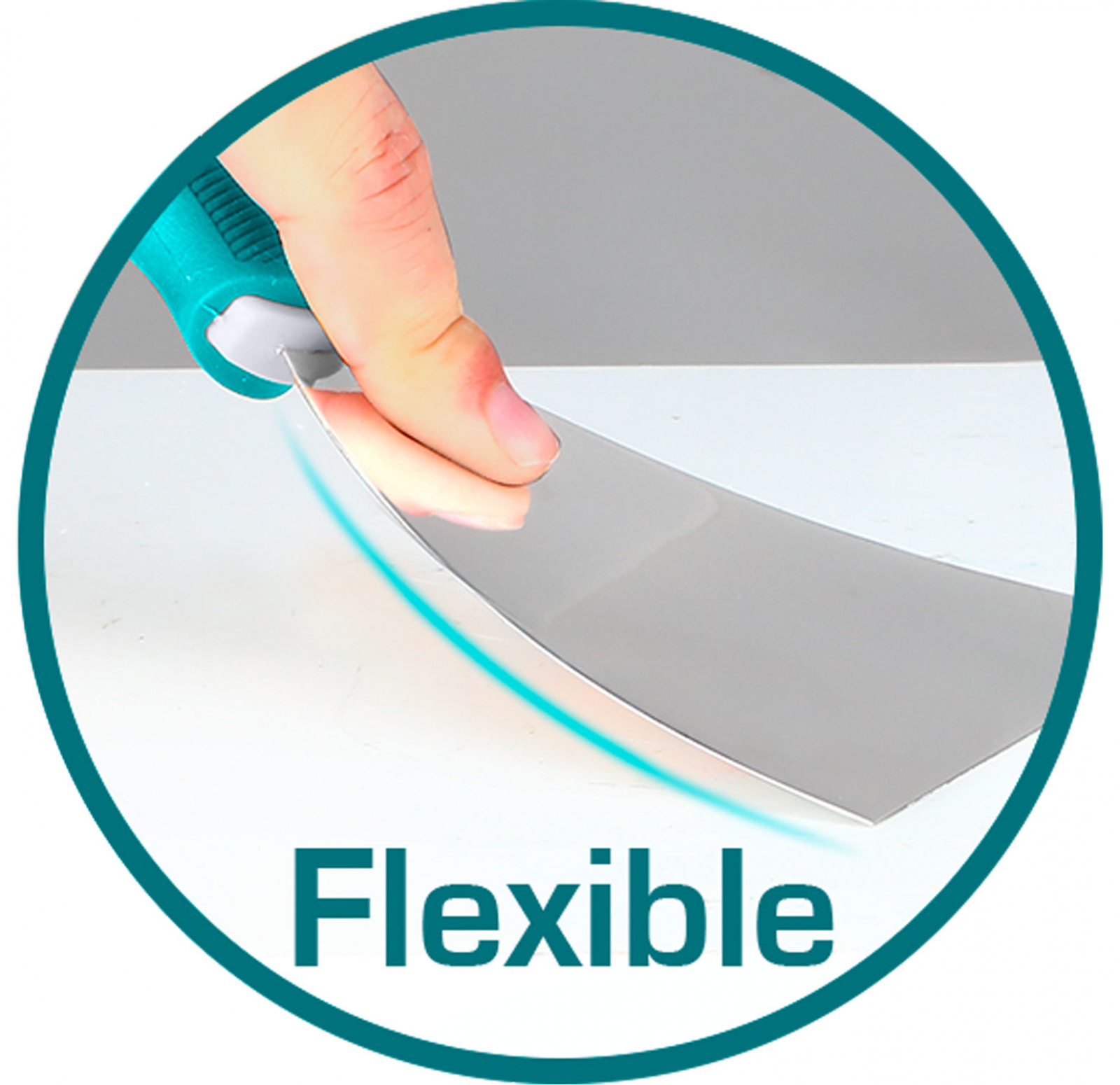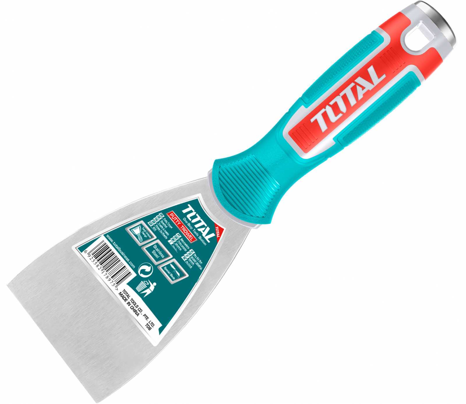 Leštěná nerezová ocel, ergonomická protislkuzová rukojeť z TPR zakončená kovovou hlavou , šířka špachtle 40 mm.