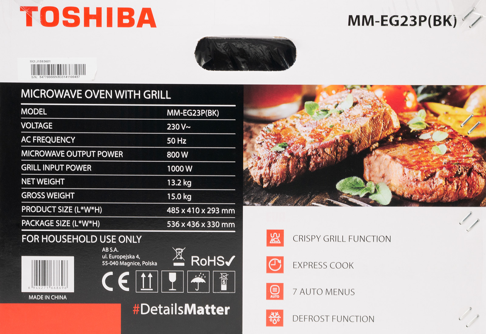 Mikrovlnná trouba s grilem, objem 23 l, výkon mikrovln 800 W, příkon grilu 1000 W, jmenovitý příkon mikrovlnné trouby 1250 W, elektronické ovládání, 11 úrovní výkonu, 13 automatických programů včetně funkcí pro popcorn, brambory, mraženou zeleninu, nápoje, maso nebo pizzu, režim celý popiskombinovaného vaření, hmotnostní a časové rozmrazování, digitální hodiny, kuchyňský časovač s nastavením do 99 minut a 99 sekund, funkce Express Cook pro rychlé spuštění, paměťová funkce pro uložení nastavení, vícestupňové vaření, dětský zámek, skleněný otočný talíř o průměru 270 mm, grilovací rošt součástí balení, smaltovaný vnitřní povrch pro snadné čištění, rozměry (š x v x h): 485 x 293 x 410 mm, hmotnost 13,2 kg, černé provedení.