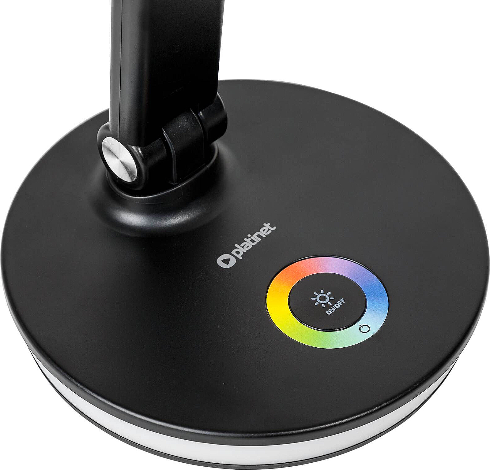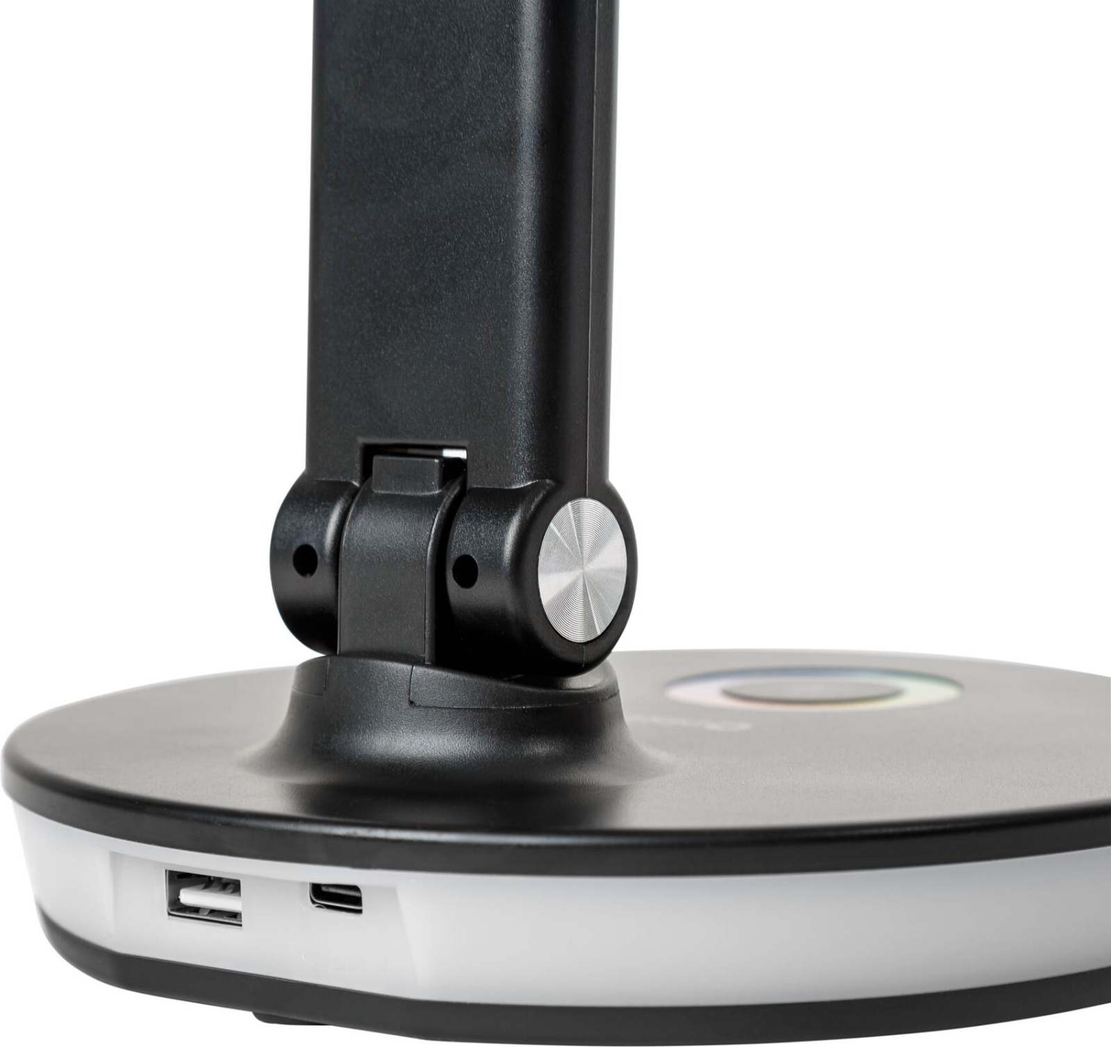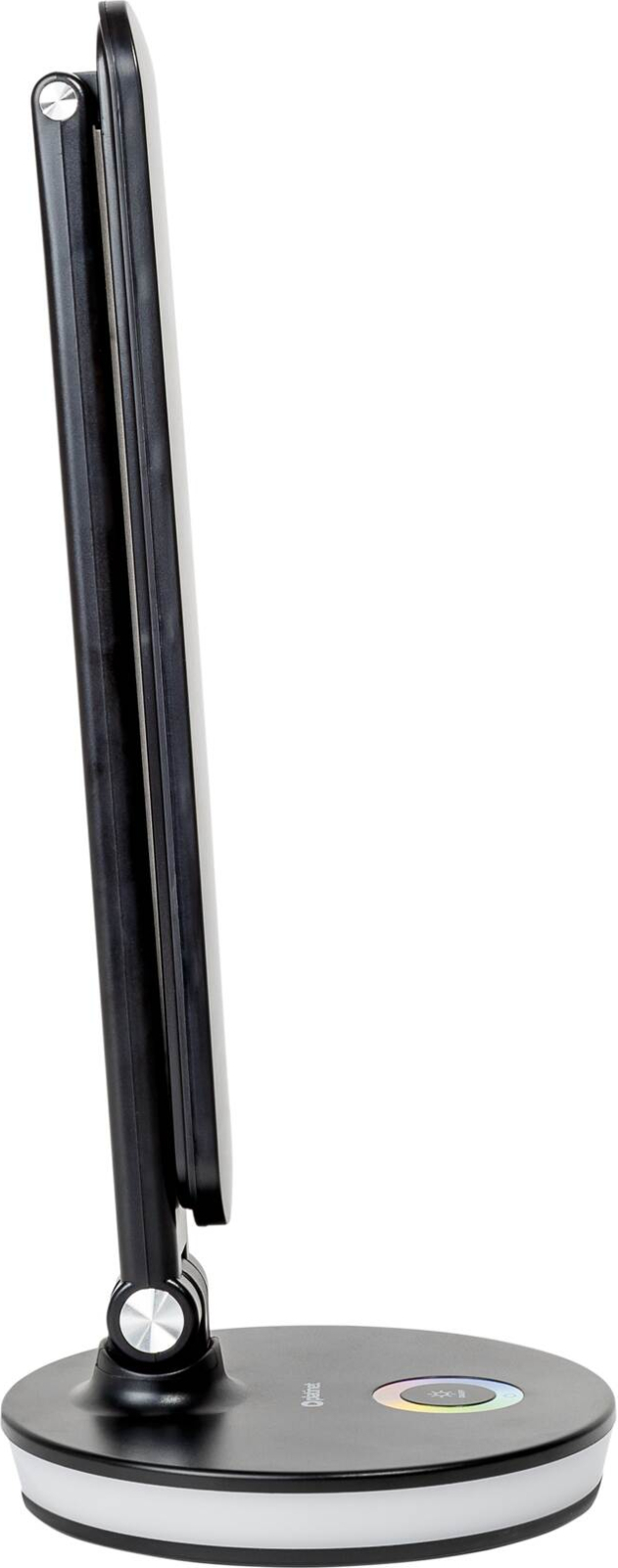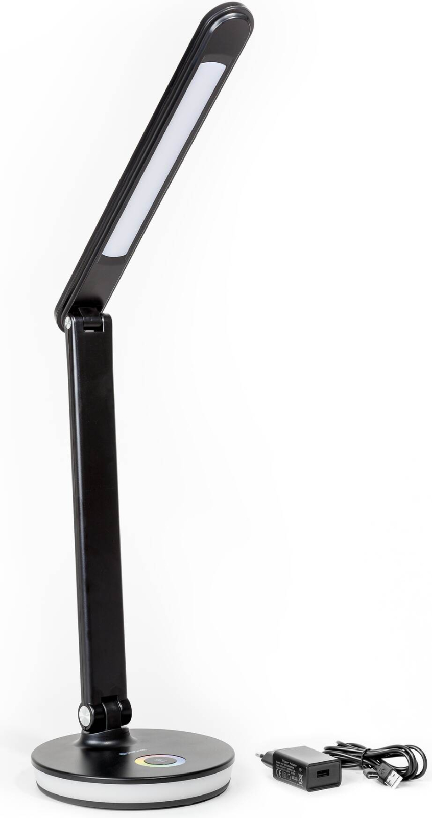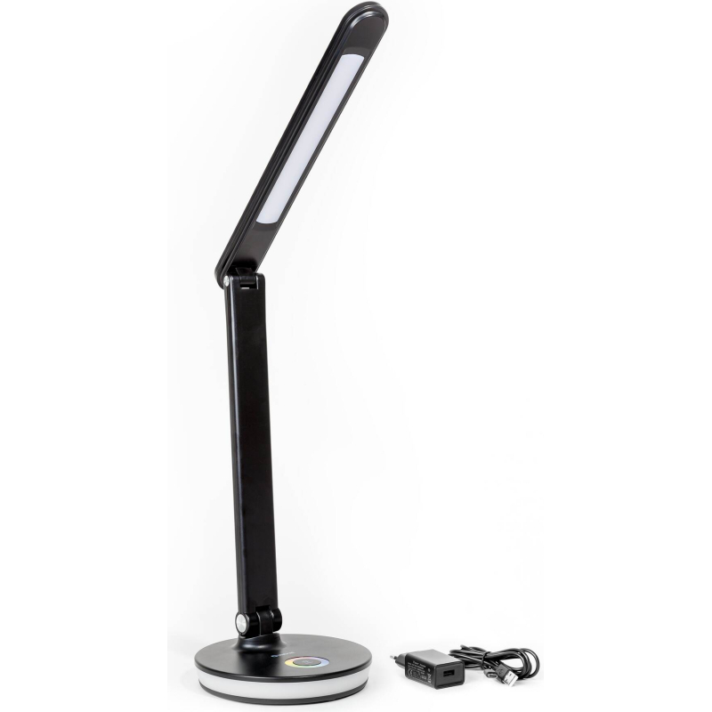 LED stolní lampa s příkonem 12 W a světelným tokem 500 lm, 36 LED diody, plynulé nastavení teploty světla v rozsahu 2800 až 6000 K, třífázovým stmívč, dotykové ovládání, ohebné rameno dovoluje libovolné nastavení směru světla, základna obsahuje integrovaný USB port pro nabíjení e celý popisxterních zařízení a dekorativní RGB podsvícení s plynulou regulací barev, napájení zajišťuje DC 5V adaptér, délka přívodního kabelu činí 100 cm, (š x v x h): 165 x 405 x 165 mm, hmotnost 0,62 kg, černé barevné provedení.