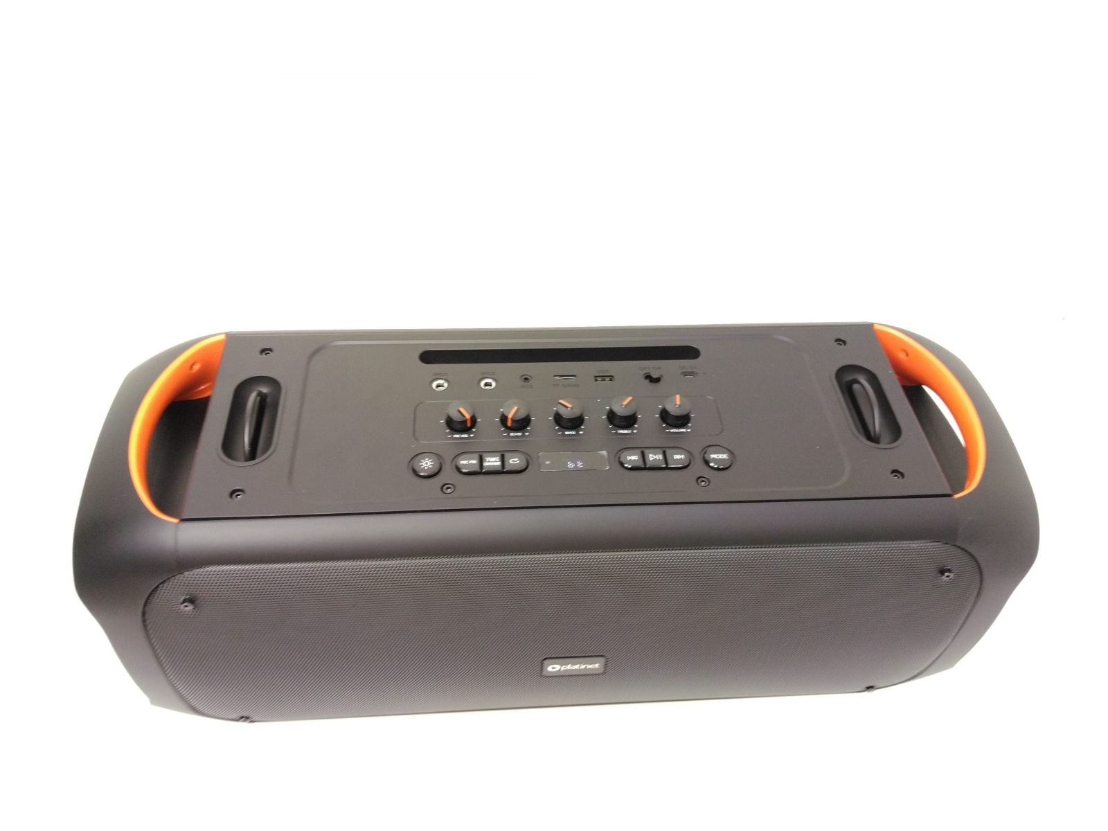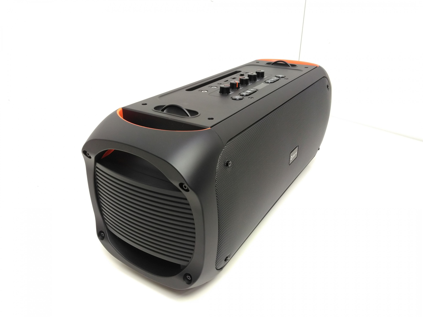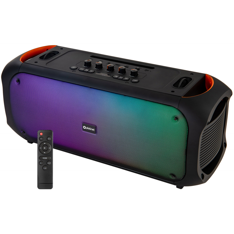 Velký přenosný Bluetooth reproduktor s celkovým hudebním výkonem 60 W 2x basový reproduktor s průměrem 13 cm a 2x výškový reproduktor s průměrem 3,8 cm, Bluetooth 5.3, FM rádo, slot pro microSD karty, vstupem AUX a dva vstupy pro mikrofon 6,3 s nastavitelným echo efektem, integro celý popisvaný akumulátor s kapacitou 6000 mAh a napětím 7,4 V, funkce TWS pro bezdrátové spojení dvou reproduktorů, nabíjení přes USB-C, hmotnost 7,65 kg, (š x v x h): 600 x 250 x 235 mm, součástí balení je nabíjecí USB-C kabel, černé provedení s čelním RGB podsvícením.