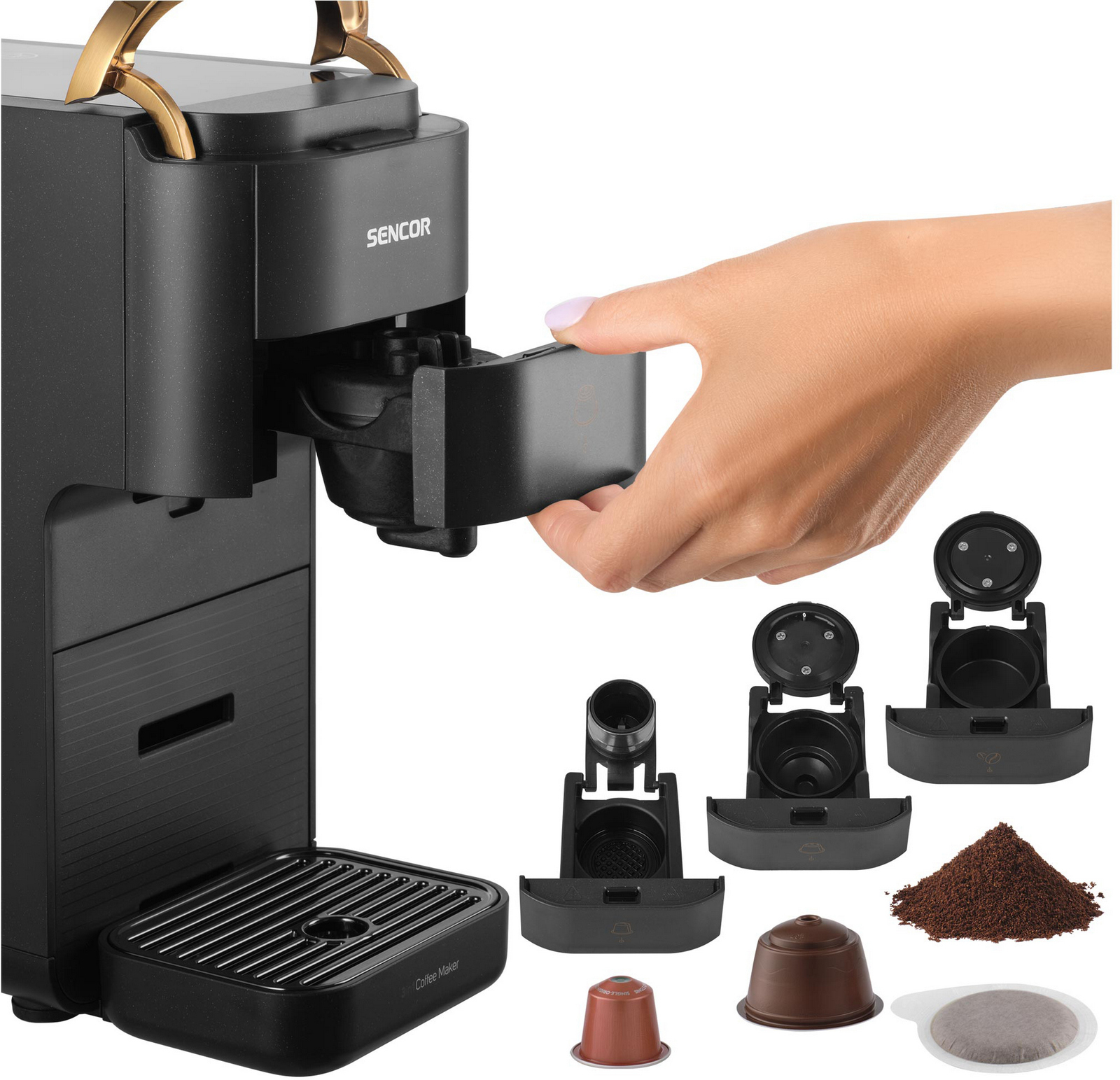- multikapslový systém 3v1 kompatibilní s kapslemi Nespresso® Original*, NESCAFÉ® Dolce Gusto®*, E.S.E. pody nebo 7 g mleté kávy