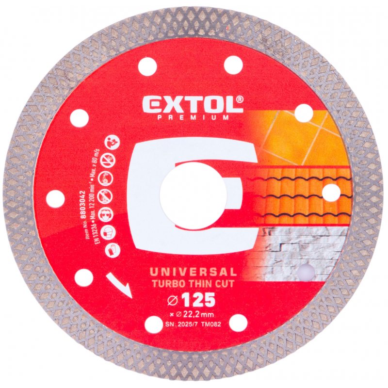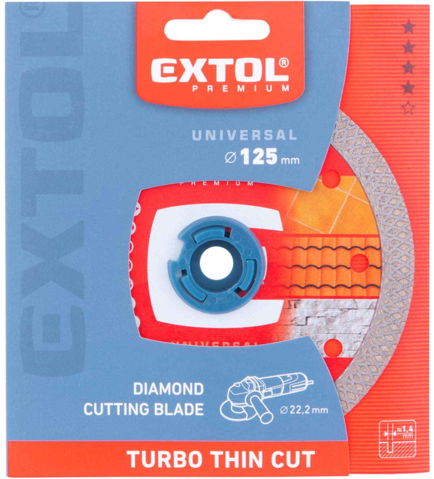 Tenký diamantový kotouč 115 mm s tloušťkou 1,4 mm je určen pro rychlé a přesné řezy. Průměr upínacího otvoru 22,2 mm. Výška segmentu 10 mm. Max. otáčky 12 200 ot./min. Turbo provedení pro suché i mokré řezání obkladů, dlažby, keramiky, porcelánu i skla. Použitelný také na žulu, m celý popisramor a břidlici. Uplatní se při přesném řezání tenkých materiálů při obkladačských a stavebních pracích.