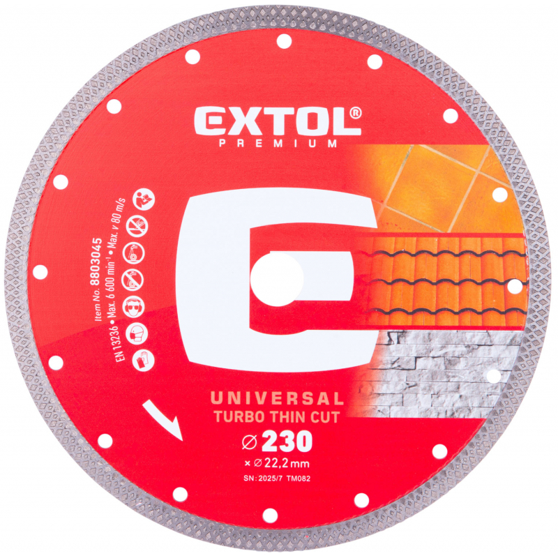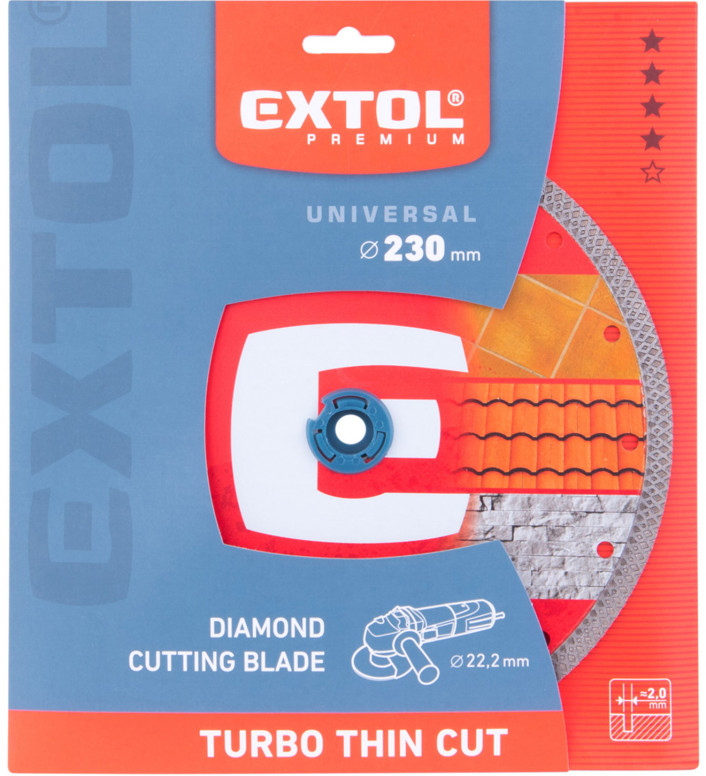 Tenký diamantový kotouč 230 mm s tloušťkou 2 mm je určen pro rychlé a přesné řezy. Průměr upínacího otvoru 22,2 mm. Výška segmentu 10 mm. Max. otáčky 6 600 ot./min. Turbo provedení pro suché i mokré řezání obkladů, dlažby, keramiky, porcelánu i skla. Použitelný také na žulu, mram celý popisor a břidlici. Uplatní se při přesném řezání tenkých materiálů při obkladačských a stavebních pracích.