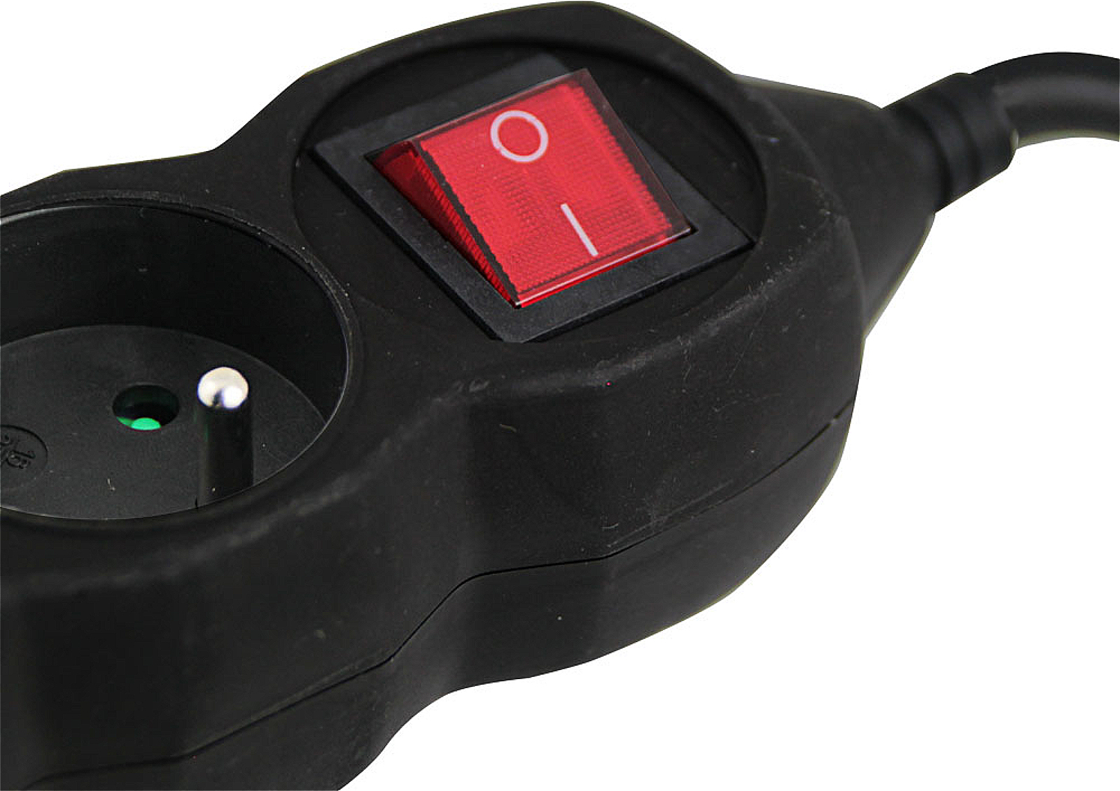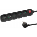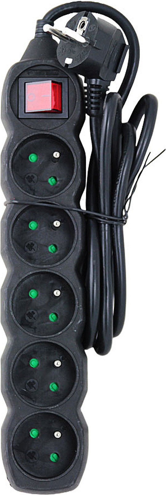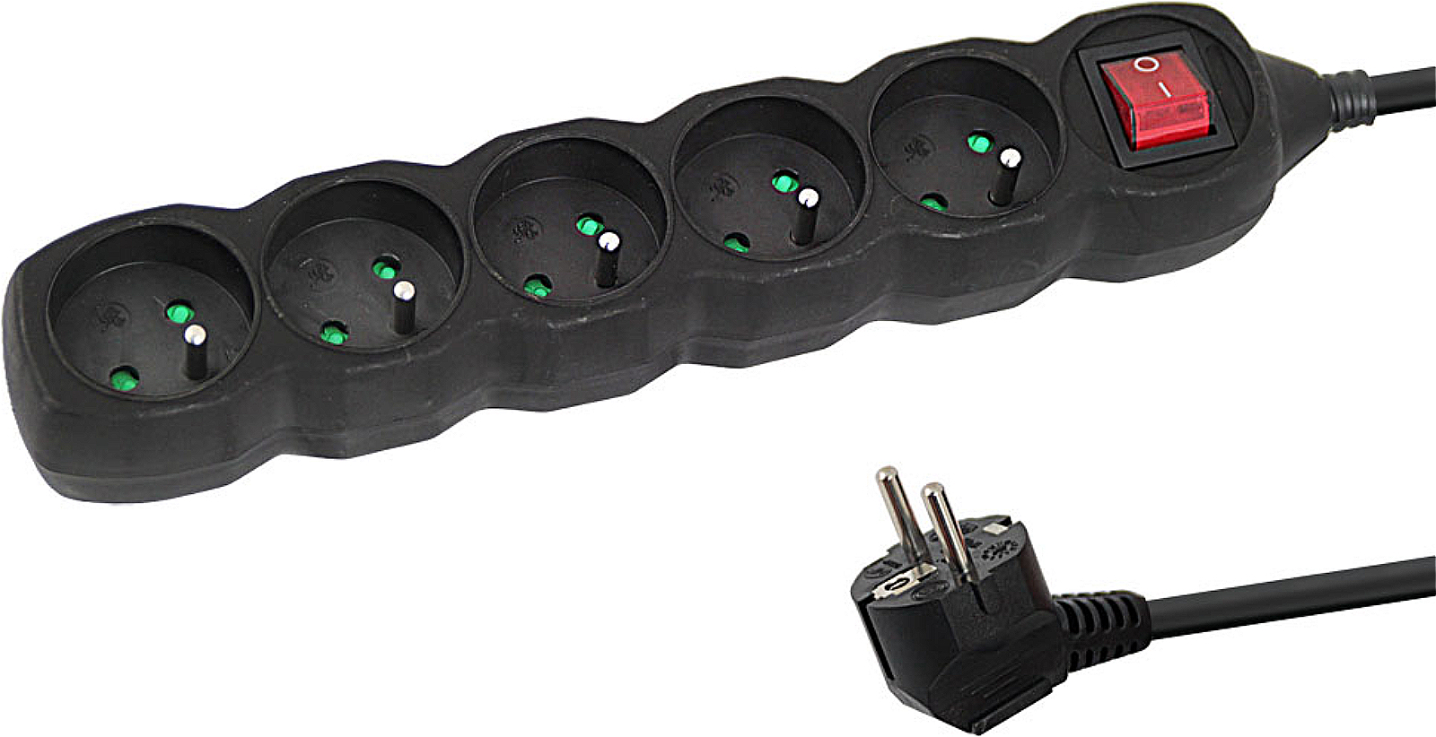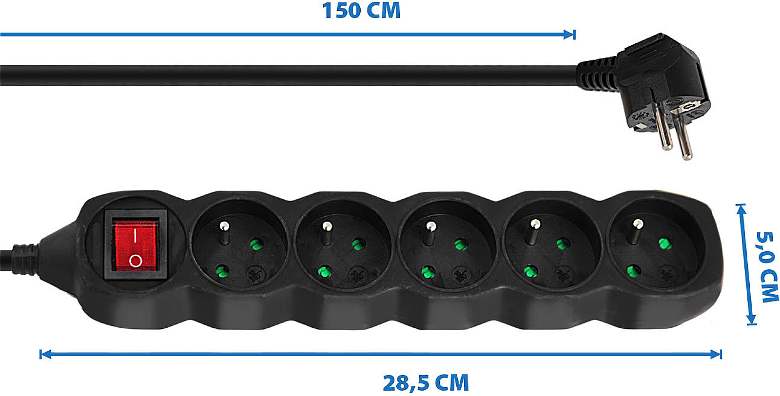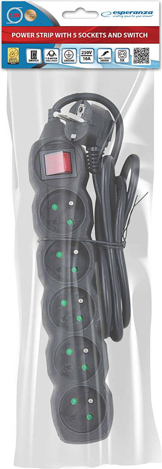 Prodlužovací přívod s 5 zásuvkami, průřez vodičů 3 x 1,5 mm, maximální zatížení 3680 W, jmenovité napětí 220–250 V, jmenovitý proud 16 A, dětské pojistky, zásuvky s uzemňovacím kolíkem (typ E), osvětlený kolébkový vypínač pro centrální odpojení, délka přívodního kabelu 1,5 m, roz celý popisměry (š x v x h): 285 x 50 x 45 mm, hmotnost 0,37 kg, krytí IP20 pro použití v suchém prostředí, černá barva.