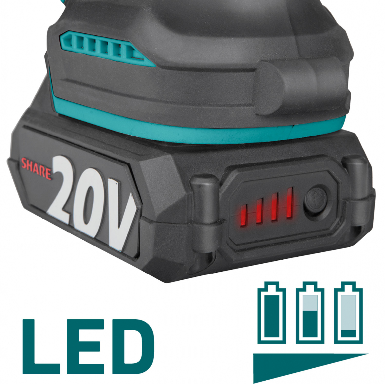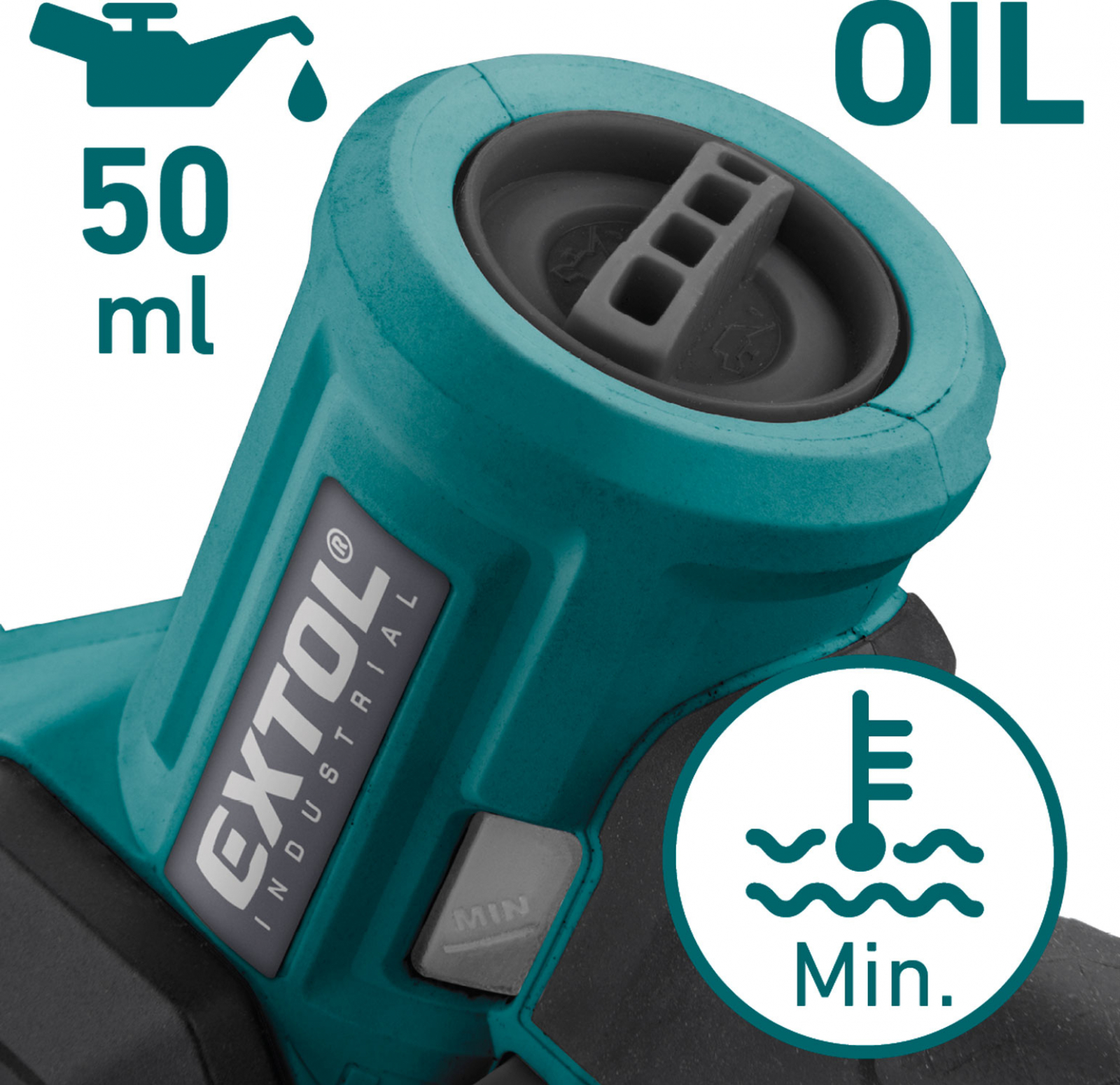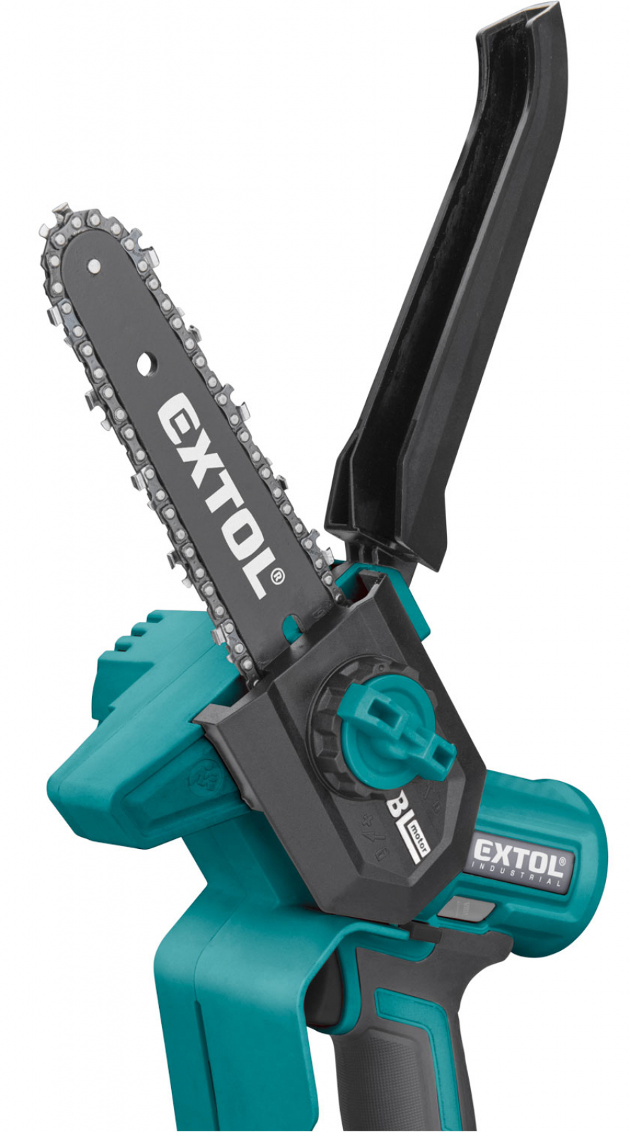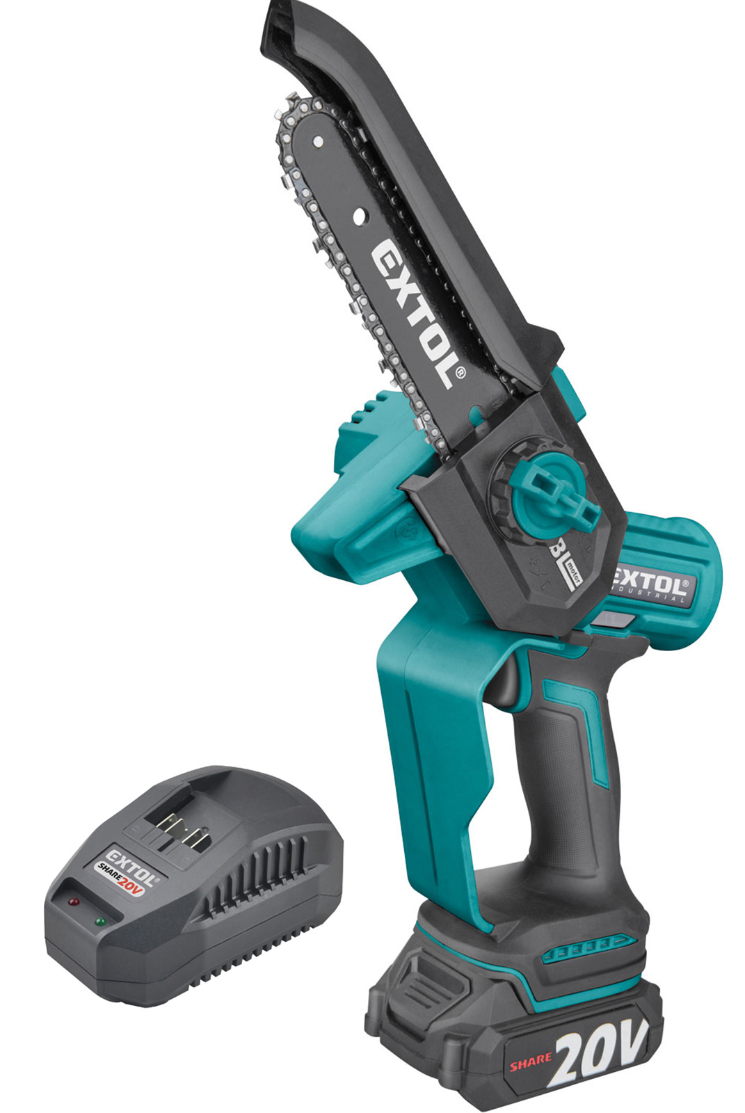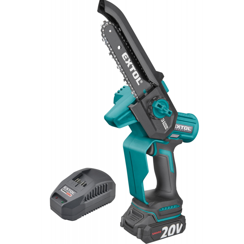 Akumulátorová ruční řetězová pila s 18?cm lištou, bezuhlíkovým motorem a automatickým mazáním. Dodávána s 20V 2Ah akumulátorem a nabíječkou, nabíjení trvá 60?minut. Napínání řetězu je bez použití nářadí, integrovaná olejová nádržka 50?ml s průhledovým okénkem. Pilka je vhodná pro celý popis prořezávání stromů, přípravu menšího množství palivového dřeva a další práce kolem domu. Provozní doba je přibližně 25?minut s 2?Ah baterií a až 50?minut se 4?Ah baterií, v závislosti na podmínkách. Baterie a nabíječka jsou kompatibilní se stroji programu Extol Share 20?V. Bezuhlíkový (brushless) motor poskytuje vyšší výkon, nižší spotřebu a delší životnost než běžné motory s uhlíkovými kartáči. Součástí je bezpečnostní pojistka spínače, ochranná lišta řetězu. Hmotnost s 2?Ah akumulátorem je 1,7?kg.
