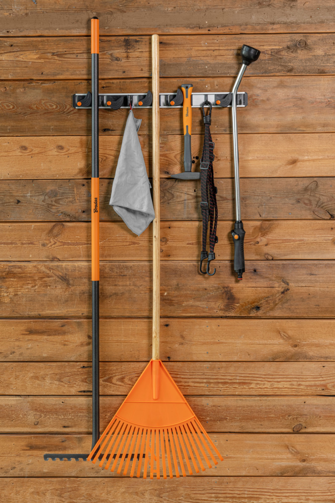 Držák na zahradní nářadí, lišta 79 cm z hliníku, 5x držák vyrobený z odolného ABS, 5x háček pro zavěšení. Vhodný pro násady o průměru 20 - 30 mm. Možno uchytit až 5 násad. Maximální zatížení jednoho závěsu je 2 kg