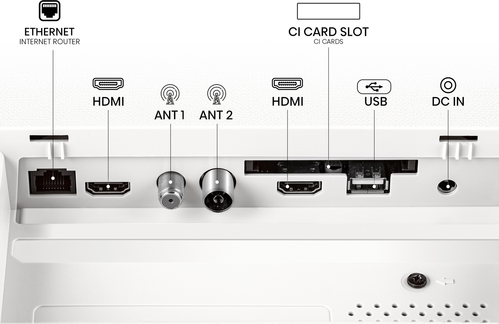 CI slot, HDMI - 4x, síťový konektor RJ-45, USB |