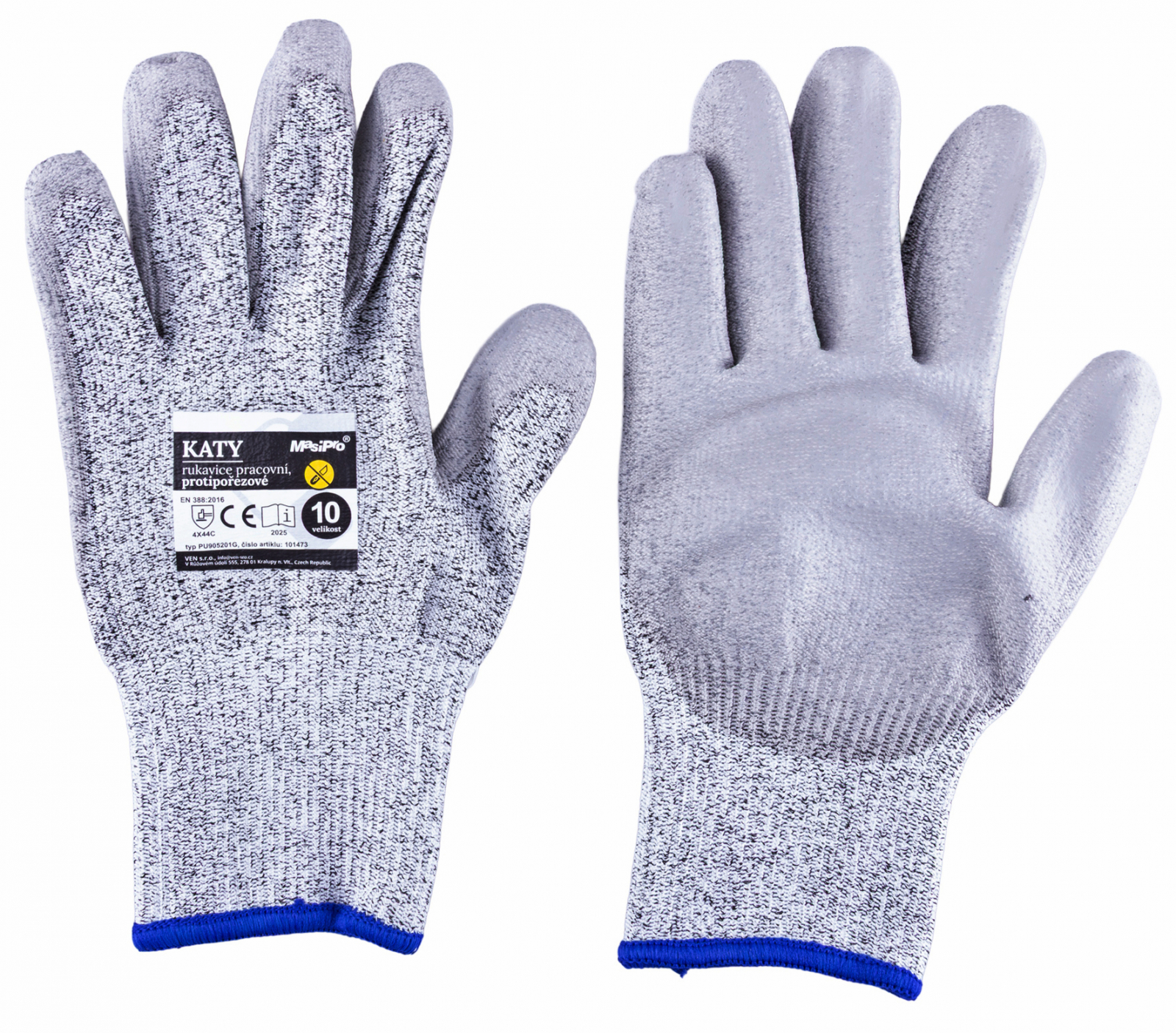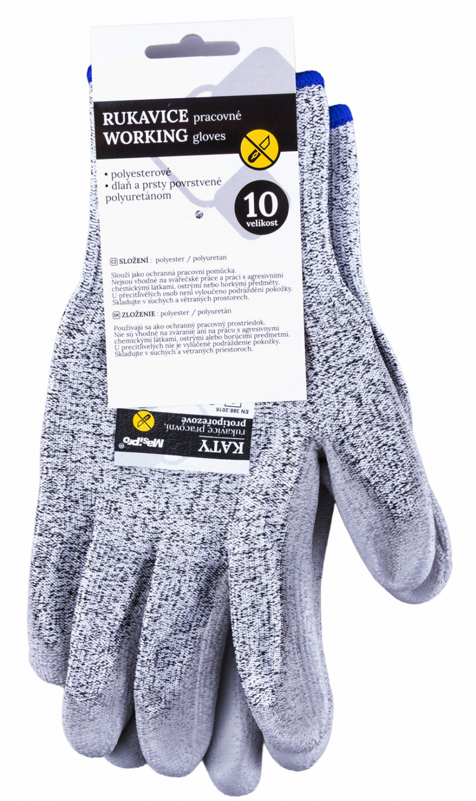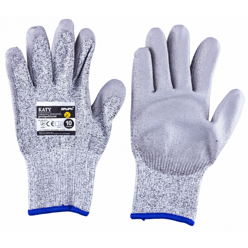 Protiprořezové rukavice, velikost 10", polyester/PE úplet s PU vrstvou, splňují normy EN420: EN388, 4X44C. Nabízí střední až vyšší ochranu proti proříznutí C. Bezešvý úplet s pružným nápletem dobře sedí na ruce. Dlaň a prsty s polyuretanem zajišťují jistý úchop i při jemné manipu celý popislaci. Vhodné pro práci s materiály s rizikem řezu, montáže i logistiku.