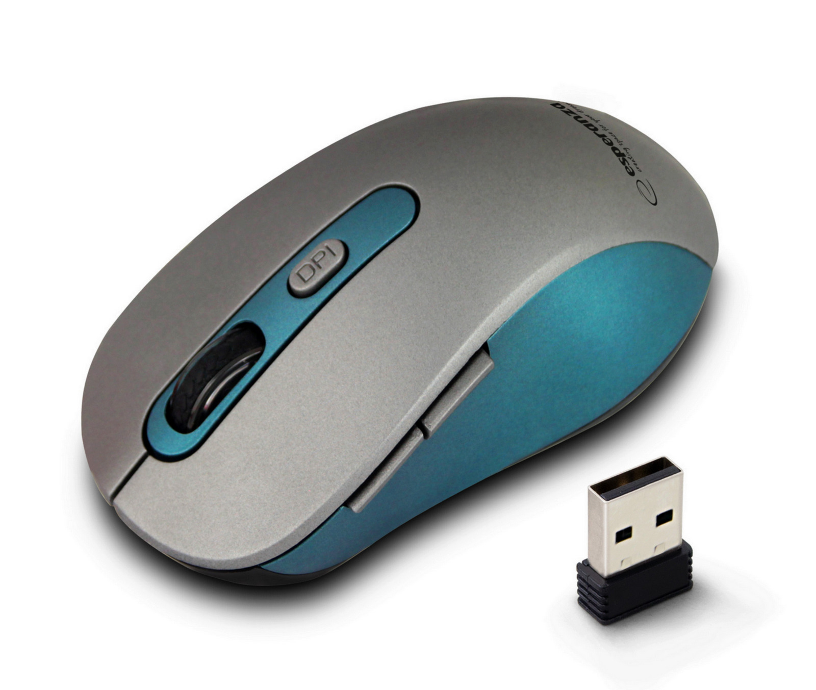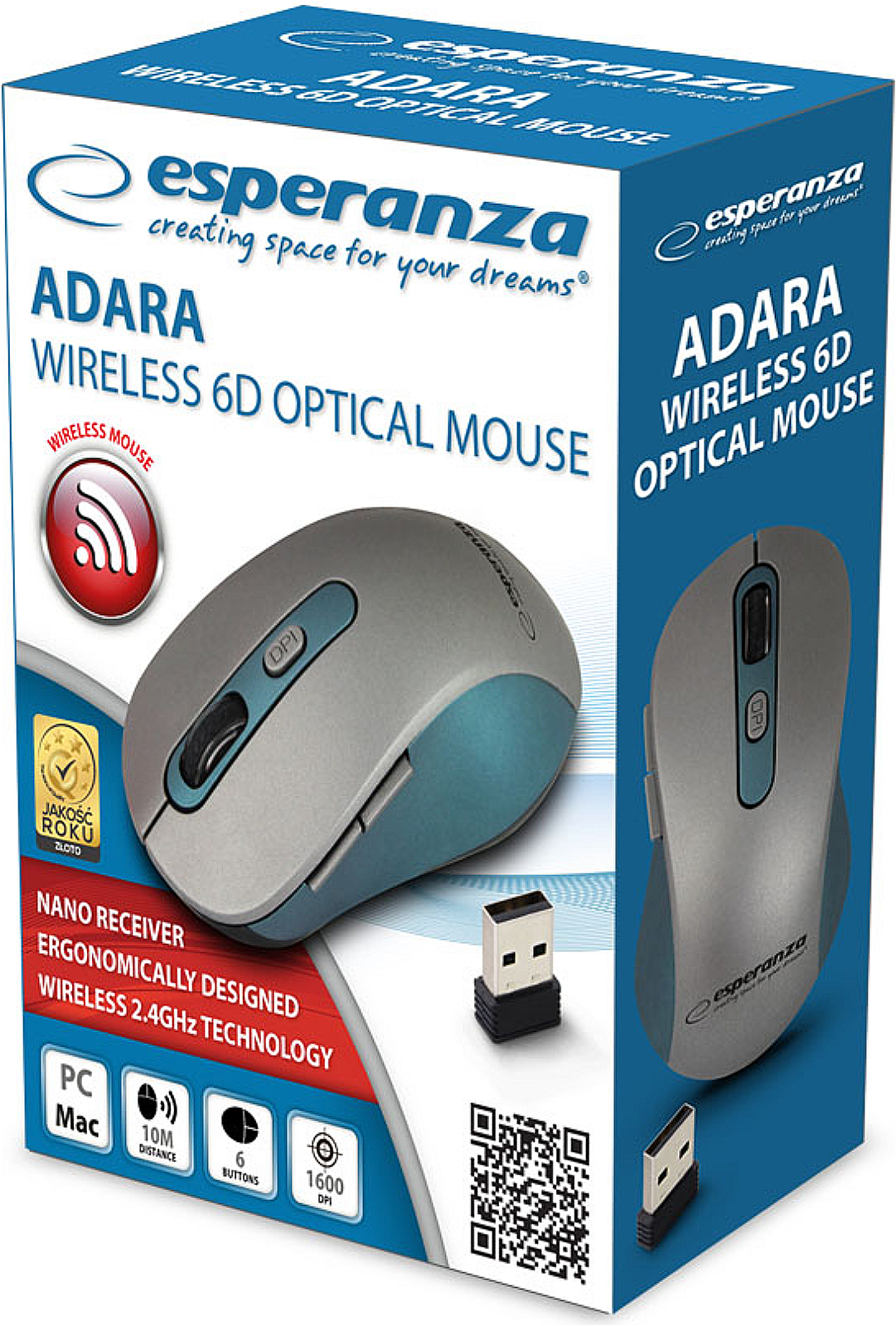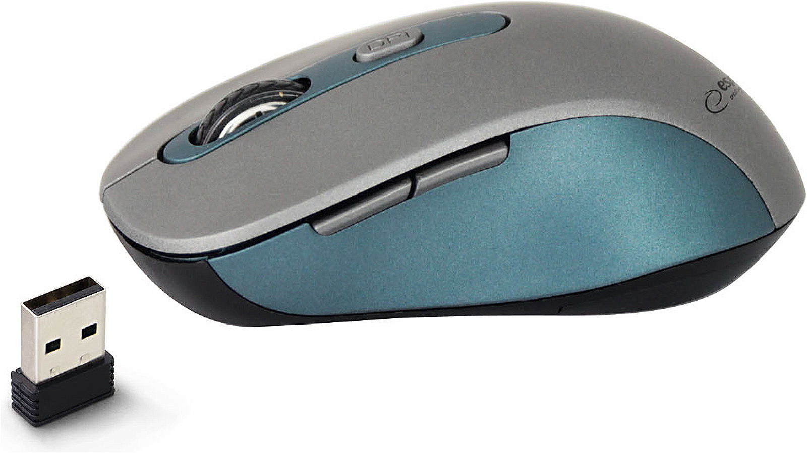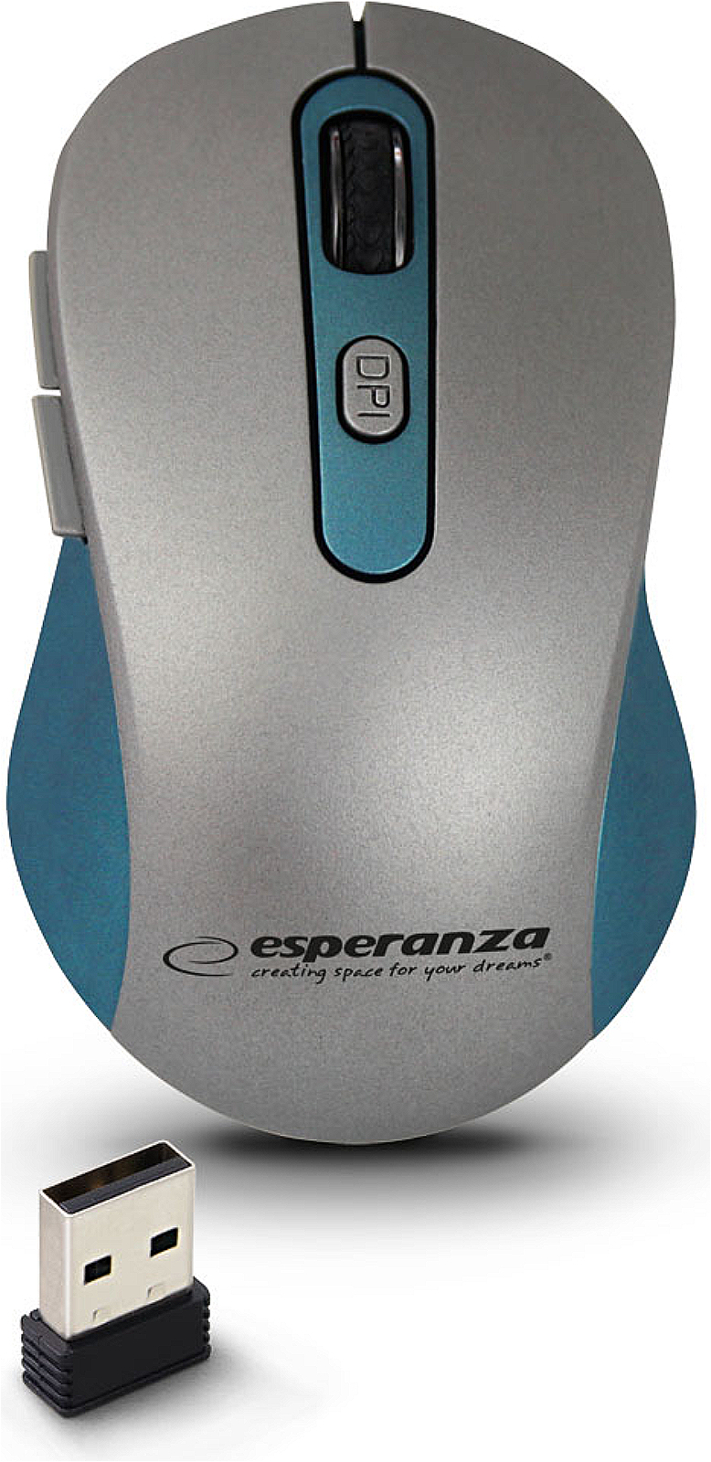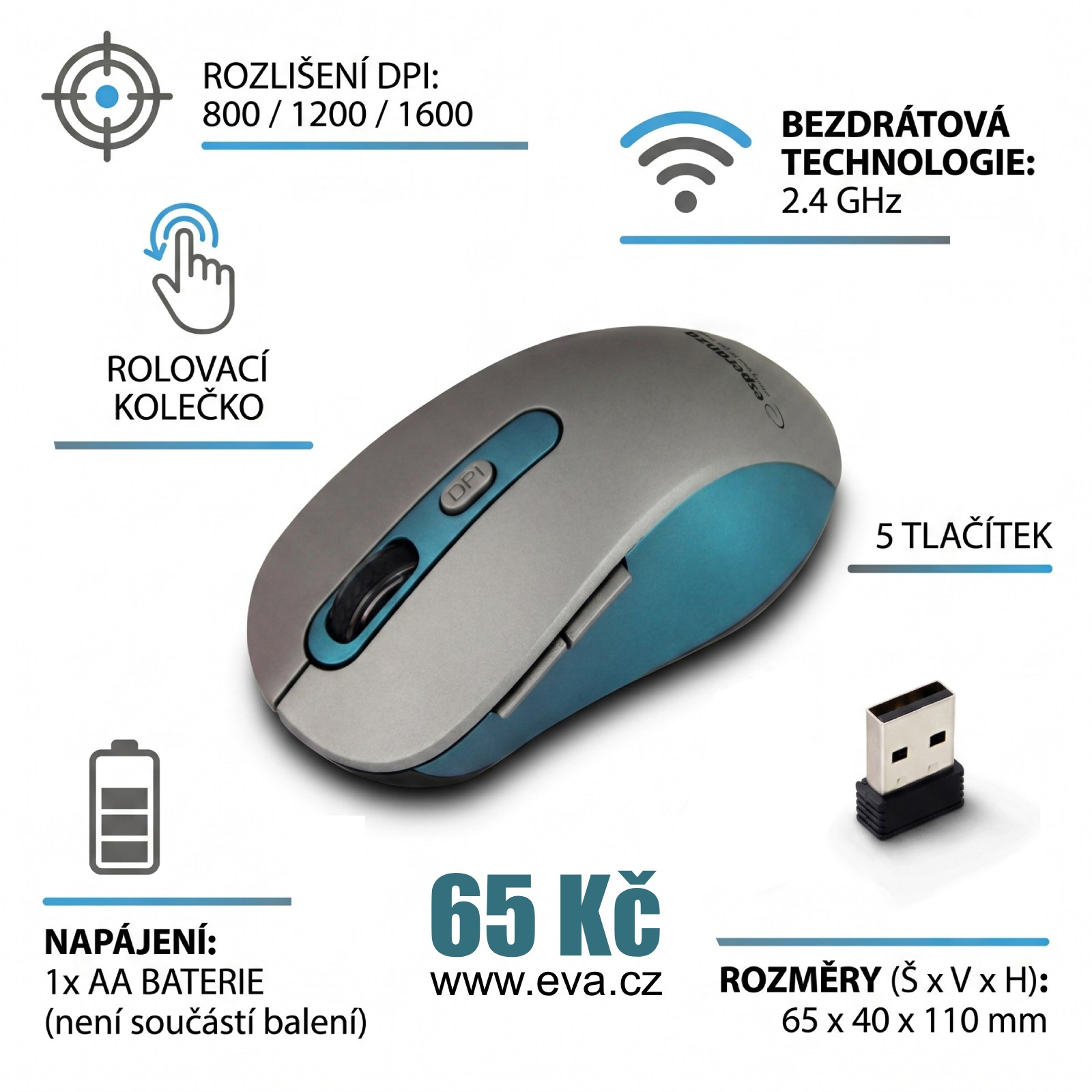 Bezdrátová optická myš, nastavitelné rozlišení 800/1200/1600 DPI, rolovací kolečko, 2,4 GHz, 5 tlačítek, napájení 1x AA baterií (není součástí balení), rozměry (š x v x h): 65 x 40 x 110 mm, stříbrné provedení s modrými prvky.