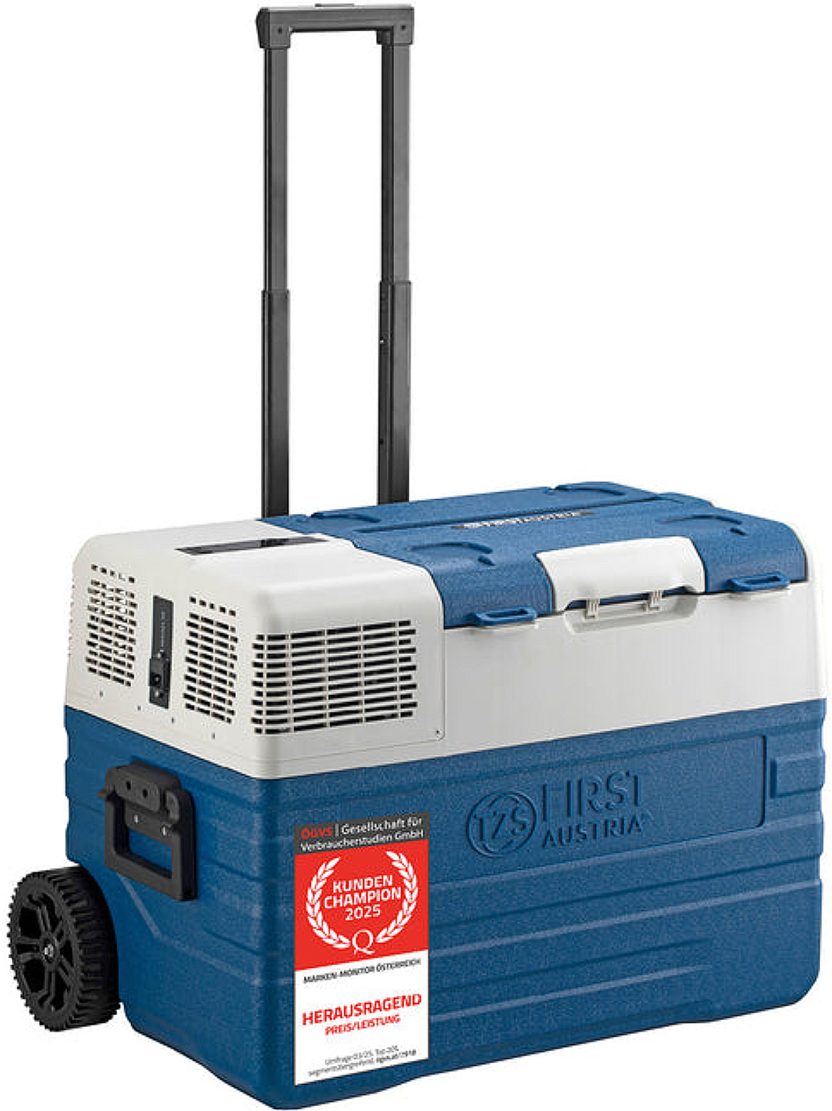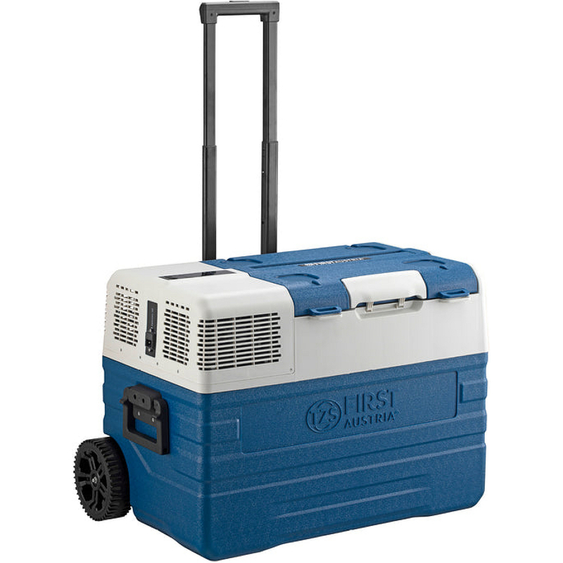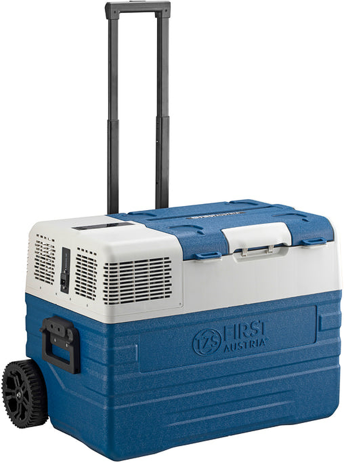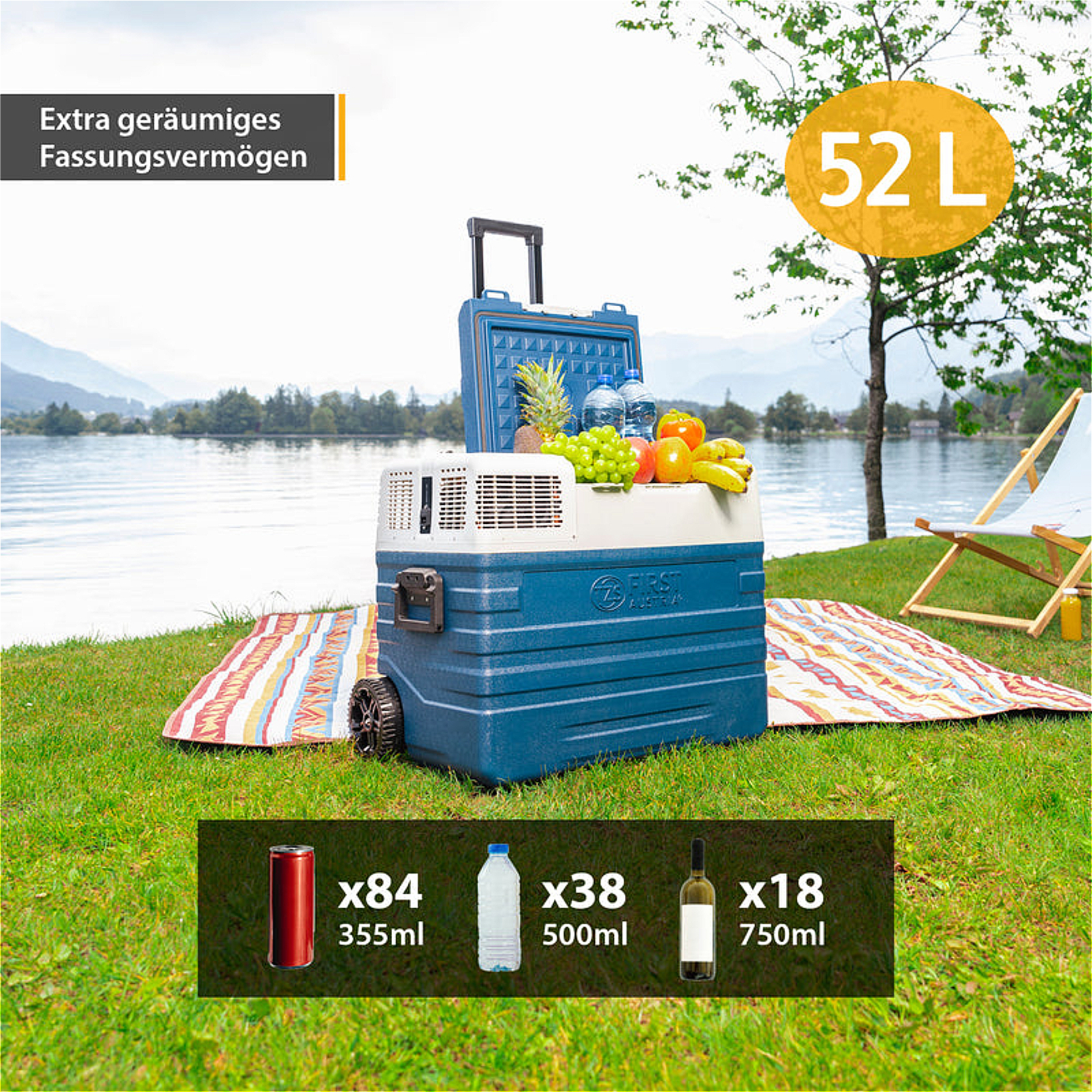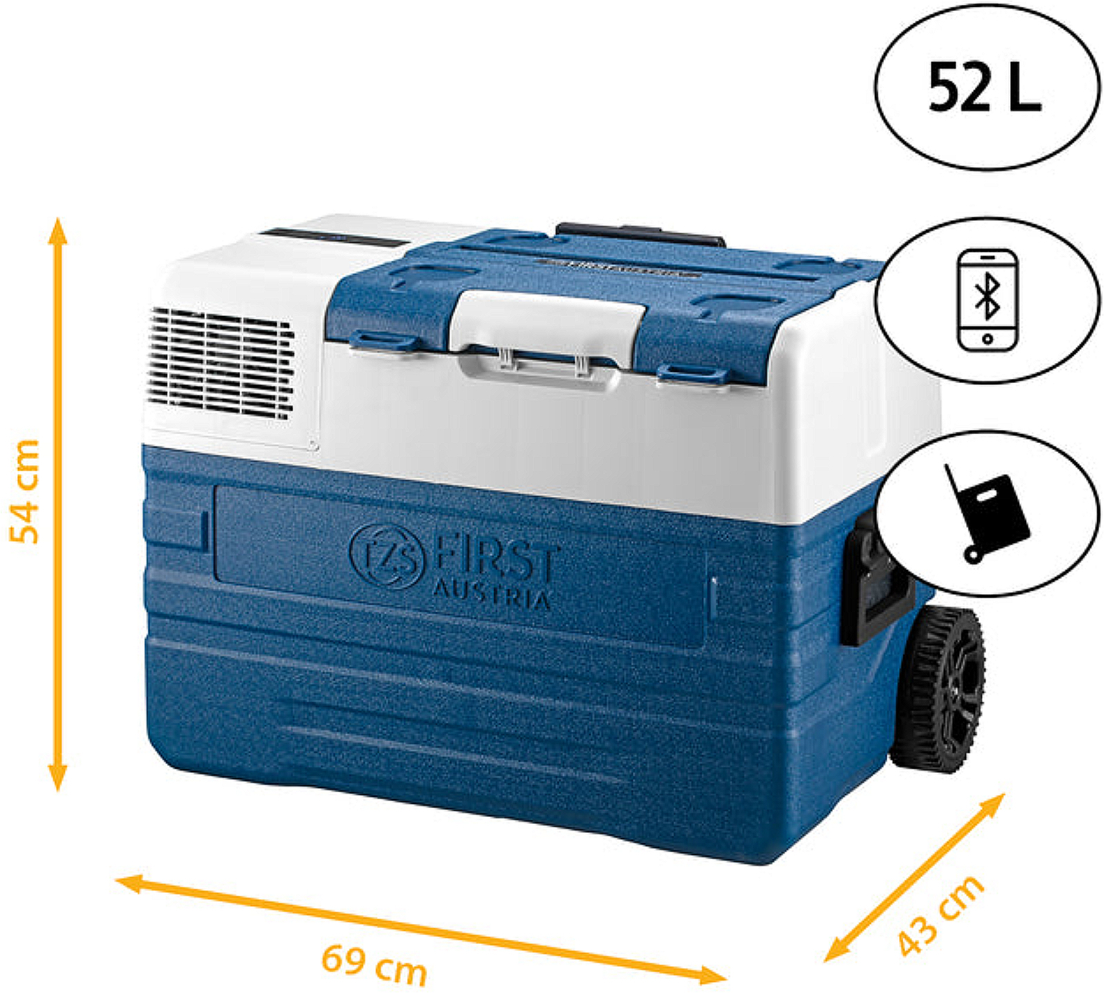 Kompresorová autochladnička, celkový objem 52 l, nastavení teploty v rozsahu -20 °C až +20 °C, rychlé zchlazení na 0 °C za 15 minut, ovládání pomocí mobilní aplikace přes Bluetooth, režim ECO, nabíjecí výstup USB, integrovaný otvírák na lahve, vypouštěcí šroub, třístupňová ochran celý popisa proti vybití autobaterie, výsuvná rukojeť až do výšky 100 cm, energetická třída D, transportní kolečka, hlučnost 45 dB, roční spotřeba energie 60 kWh, délka přívodního DC kabelu 235 cm, hmotnost 15,8 kg, modré provedení s bílými a šedými prvky, rozměry (š x v x h): 689 x 542 x 427 mm.